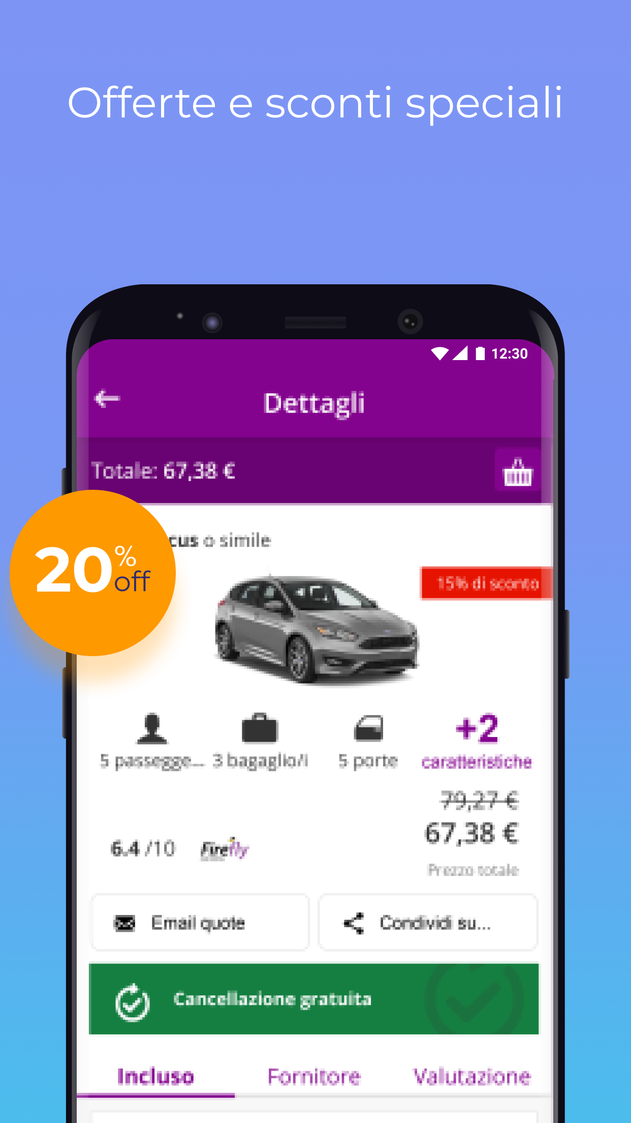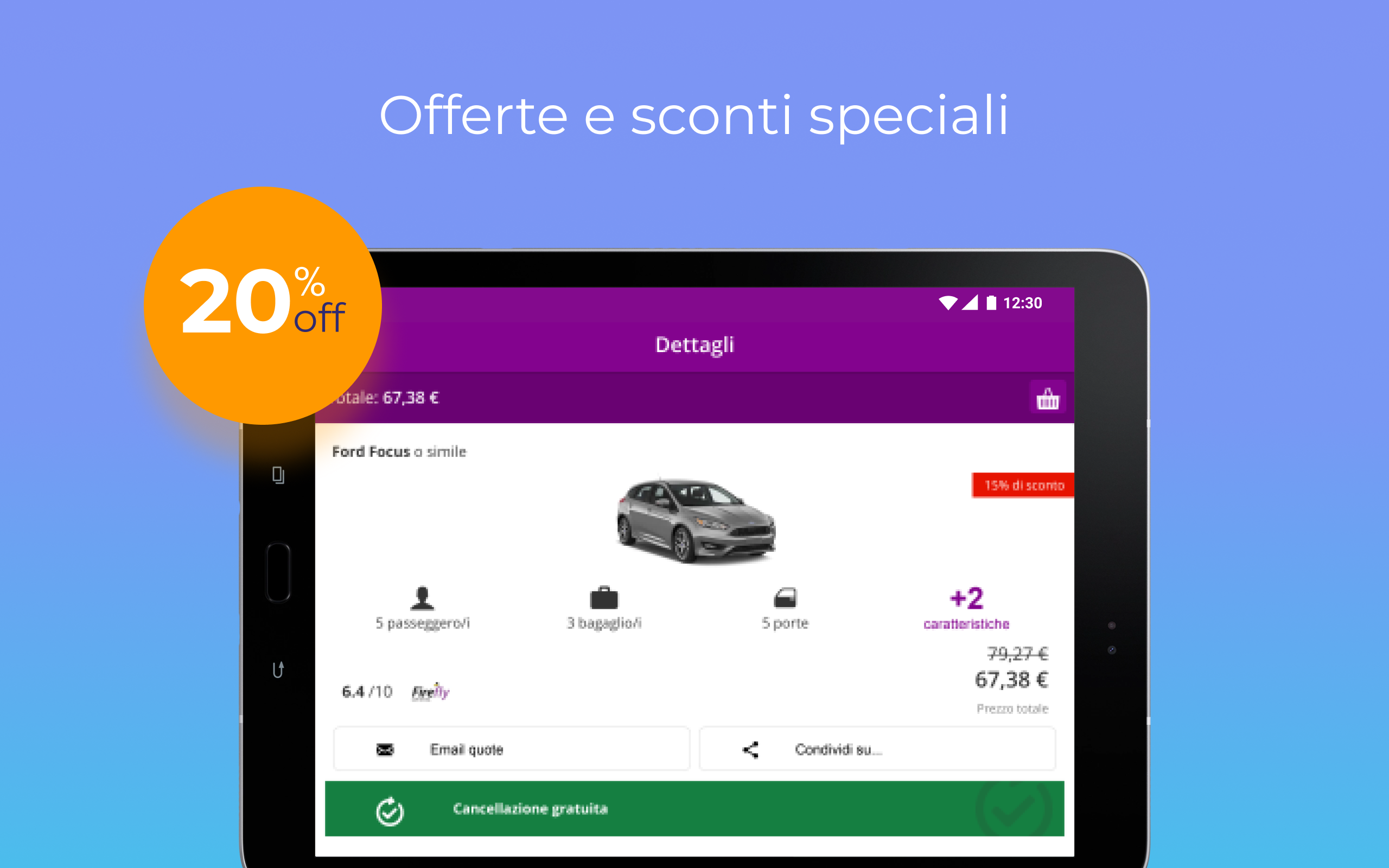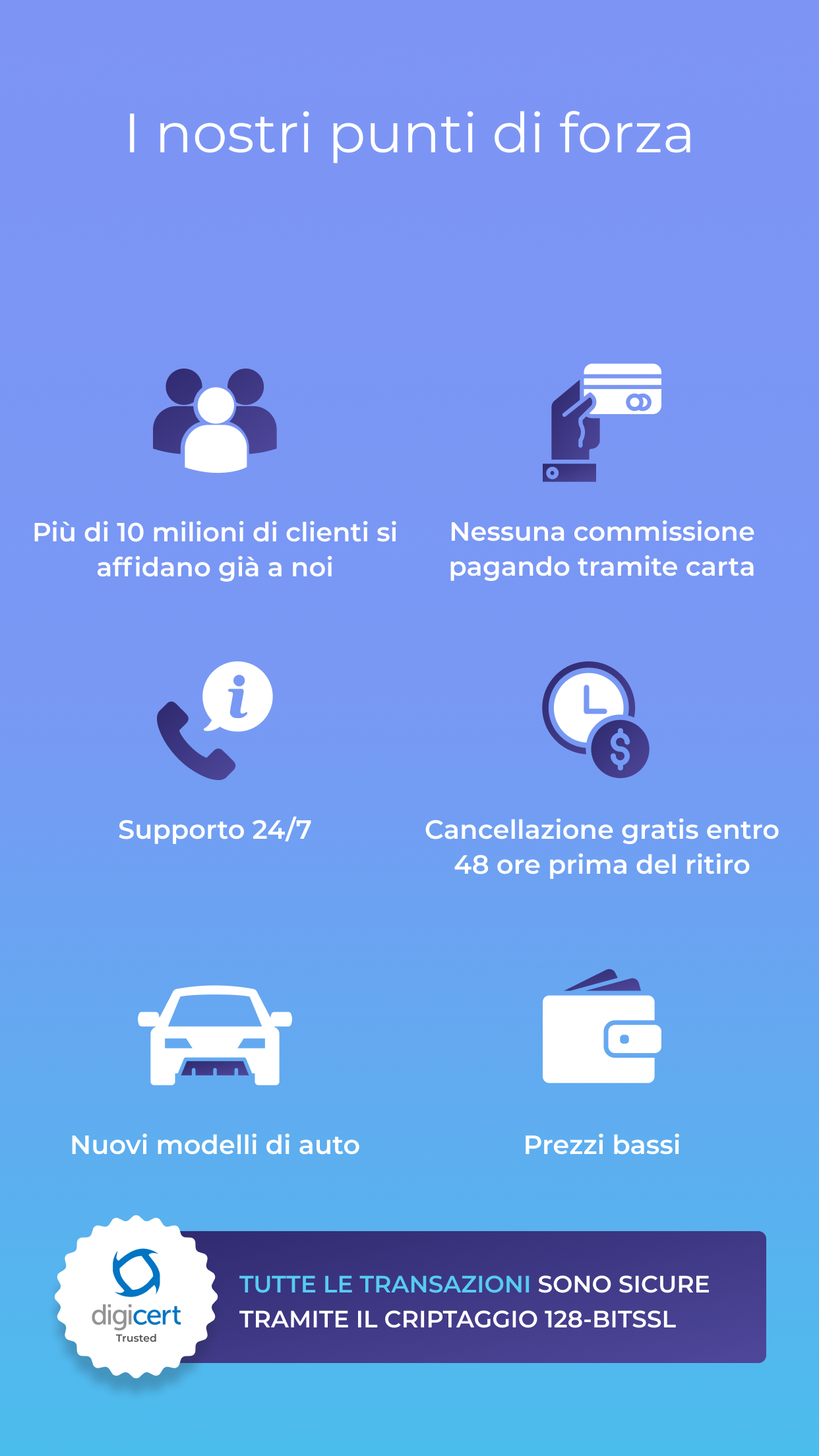 Con la nostra app, puoi facilmente trovare le migliori offerte per il noleggio auto nella tua posizione attuale o nella città/aeroporto di tua scelta. Seleziona le date desiderate e controlleremo subito la dis-ponibilità di auto in tutte le compagnie di noleggio localizzate nel luogo di tua scelta. Confronteremo le condizioni di noleggio, i prezzi e ti forniremo l’opportunità di scegliere le opzioni più ottimali per te.