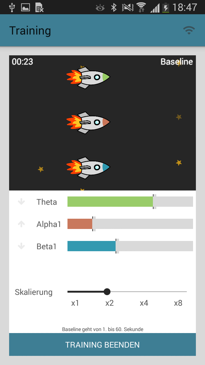WICHTIG: Diese App erfordert zur Nutzung ein EEG Headset von NeuroSky (z.B. das MindWave Mobile)! BrainExpress – Technologie für Sie! Verbessern Sie Ihre mentalen Fähigkeiten dauerhaft mit unseren maßgeschneiderten Trainings. HoA BrainExpress ist unsere neueste Neurofeedback Software, die unsere erfolgreiche Brain Starter App erweitert. Verbessern, protokollieren und analysieren Sie die Aktivität Ihres Gehirns so wie Sie wünschen – Individuelle Trainings, vorgefertigte Trainings, Aufzeichnung und Export von Rohdaten, Training mit drei Spielen, Verwaltung der Trainingsdaten - all das und mehr ist mit BrainExpress möglich! Zusätzlich zur Software benötigen Sie noch ein EEG Headset von NeuroSky mit jeweils einen Sensor an der Stirn und am Ohr, mit deren Hilfe die EEG Daten d.h. Ihre elektrischen Gehirnaktivitäten ermittelt werden können. Sie können verschiedene Trainingsoptionen nutzen, um gezielt Ihre Konzentrations-, Aufmerksamkeits- und Entspannungsfähigkeit zu trainieren. Je nachdem ob Sie ein Entspannungs-oder Konzentrationstraining durchführen wollen, können Sie noch zusätzlich auswählen, ob Sie Ihr Training in visueller (Video) oder akustischer (Musik) oder interaktiver (3 Spiele) Form durchführen möchten. An Hand von Balkendiagrammen und Pfeilen gibt Ihnen die Software vor, welche EEG Frequenzen Sie während Ihres Trainings mit Ihren Gedanken nach oben oder unten steuern müssen, um Ihr Training erfolgreich absolvieren zu können. Die Trainingsdauer sowie der Trainingserfolg werden Ihnen in Echtzeit direkt auf dem Display angezeigt. Eine ausführliche Auswertung zur genauen Trainingsanalyse verschiedener Nutzer und Sessions ist selbstverständlich jederzeit möglich. Mit BrainExpress können Sie eigene Video- oder Musikdateien einbinden und Ihre Training selbst gestalten und variieren. Sie lernen mit HoA ihre mentalen Fähigkeiten mit wenig Zeit und Aufwand positiv zu beeinflussen. Alltagssituationen meistern Sie stressfreier und halten somit Ihr Leben im Gleichgewicht. BrainExpress bietet Ihnen: - Aufzeichnung und Export von EEG Rohdaten, organisiert nach Sessions und Nutzerprofilen - Die Möglichkeit ihre Entspannungs- und Konzentrationsfähigkeit zu trainieren - Freie Auswahl an eigenen Trainings. Es können bis zu drei Parameter aus den acht Frequenzbändern ausgewählt und frei miteinander kombiniert werden. Therapeuten können diese Trainings auch festlegen und passwortgeschützt verwalten. - Zusätzlich vier Preset Trainings für häufige Trainingsziele - Option für mehrere Benutzer: jeder Benutzer kann durch eine eigene ID identifiziert werden und die Trainingsdaten zugeordnet werden. - Die kompletten Daten können nach dem Training auf einen Dropbox Account oder ein iCloud Konto hochgeladen werden