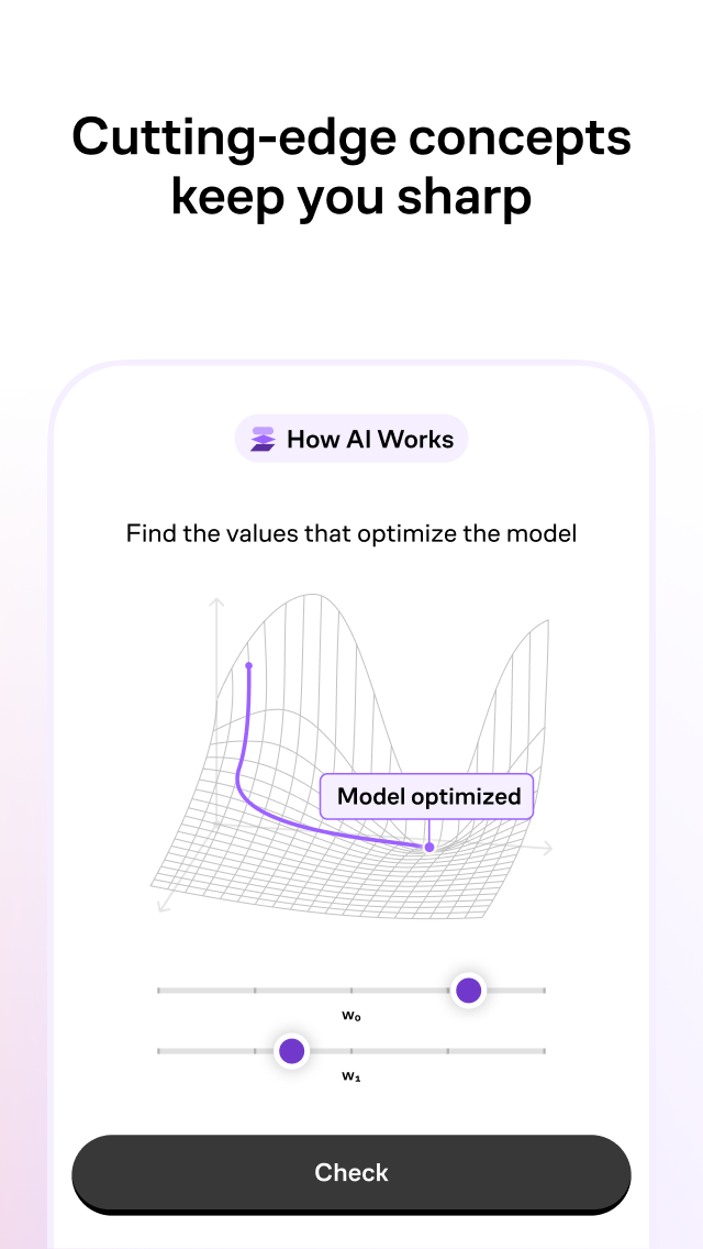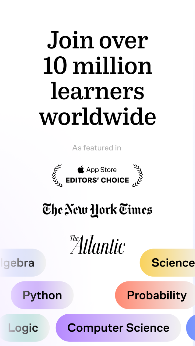 Professionisti, studenti e studenti per tutta la vita allo stesso modo possono affinare le abilità dormienti o apprenderne di nuove. Progredisci attraverso lezioni e sfide su misura per il tuo livello. Esplora l'introduzione ai corsi avanzati di algebra, geometria, calcolo, logica, statistica e probabilità, pensiero scientifico, fisica, meccanica quantistica, intelligenza artificiale, reti neurali, algoritmi, Python e oltre.
