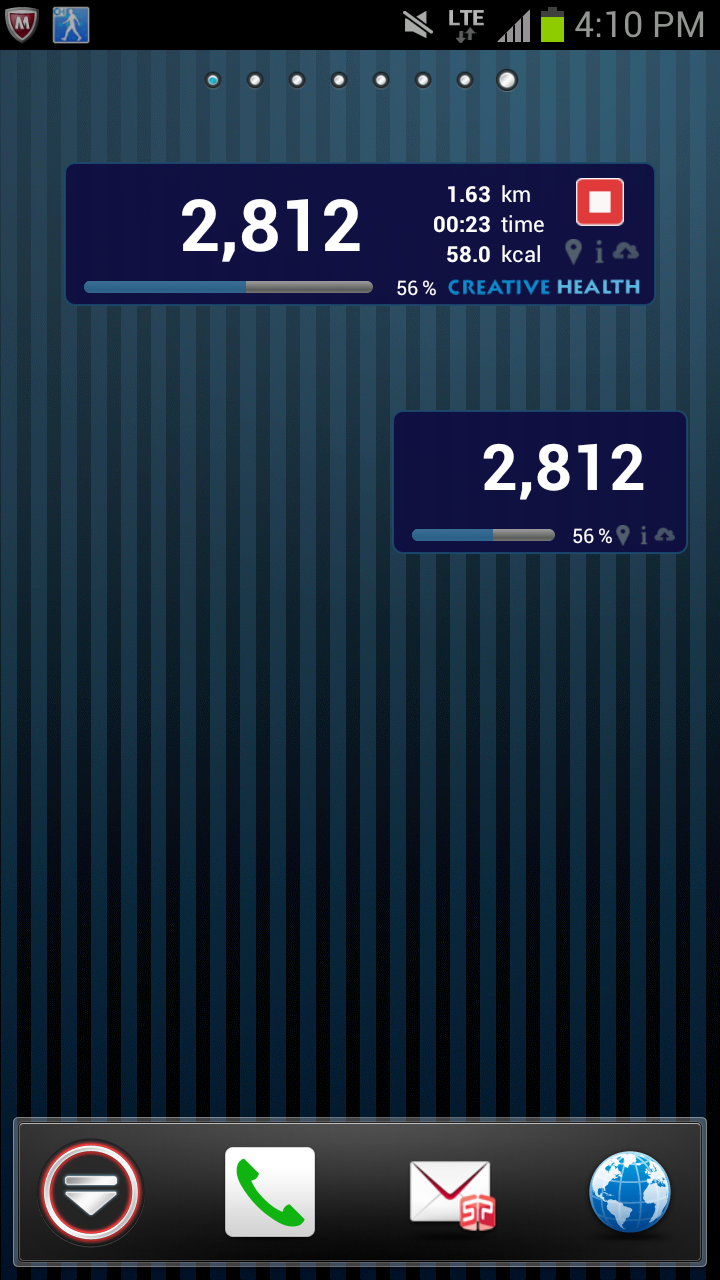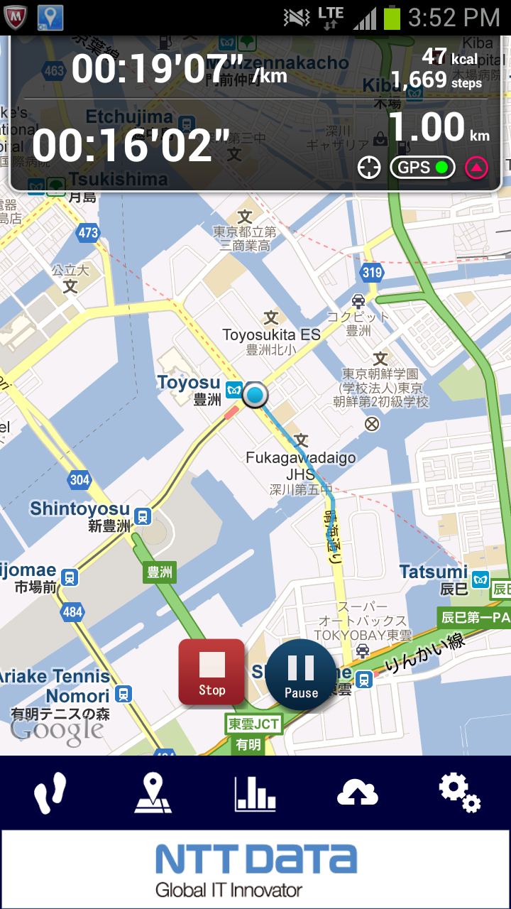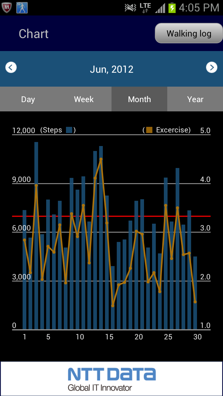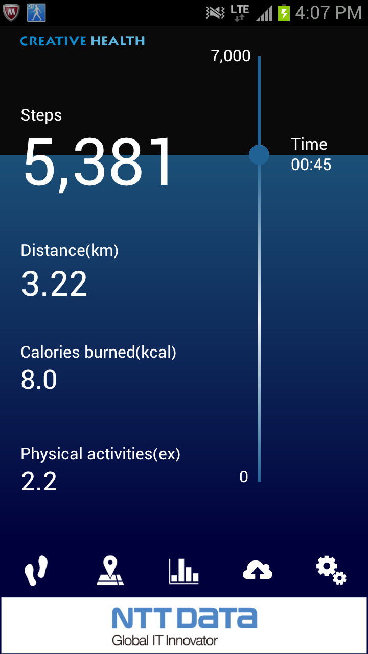 You can record the steps, distance, calorie consumption, and so on. 【Features】 ■You can use your smart phone as an pedometer. ■You can record your walking route with GPS. ■You can login to "Creative Health NEXT"(Members only website which offers you several services to help keep your health). Those who have resisterd to "Creative Health NEXT" can enjoy this App more by logging in to the website from this App. ・You can get "Health points" according to the steps you walked. With the "Health points", you can Apply for various goods. ・You can save your data(steps, distance etc) for a long period of time.(For now, unlimited) ・You can join the ranking for steps and distance. ※"Creative Health NEXT(Website)" is Japanese only. We can't support other languages. ※At present, to become a member of "Creative Health Next"(https://www.chealth.net/), the organization you belong to, such as corporations, HMOs and PPOs, should have enrolled to this service. About "Creative Health NEXT(Website)" ※You can use this App without registering to"Creative Health NEXT(Website)" ※"CH Pedometer App" is one of the "CH Healthcare Apps" provided by NTT DATA, Inc. 【Functions】 ・Measurement and record of steps, distance, and calorie consumption. ・Display of steps, distance, and calorie consumption in charts. ・Route recording with GPS. (Automatically distinguishes walking and running from traveling in vehicles) ・Route recording: You can record your time, distance, average pace, transition of pace, route, and calorie consumption. ・Power saving settings for steps couting, recording, and GPS. ・Display of widgets ・Choice of colors(6 colors) ・Linkage with "Creative Health NEXT(Website)". 【Notes】 ・You cannnot record route with GPS disabled. ・If you uninstall this App, the data will be erased and cannot be restored even if you install the App again. The data of steps and distance uploaded to "Creative Health NEXT" will be saved on the website. ・Please record route outside buildins, because GPS signals cannot be received indoors. ・You cannnot record route while the signal of route recording screen is red or yellow. Please use the function while the signal is green. ・You can use this App only with the time settings of your smart phone is set to "automatic". 【Supported devices】 Android OS 2.2~4.4 ※ This application does not work properly on some devices.
