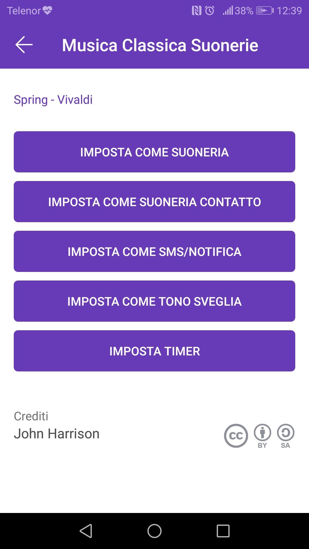 INFO LEGALE E LICENZASuoni e toni usati in Musica Classica Suonerie sono sotto licenza Creative Commons (CC 1.0, CC PD 1.0, CC BY 3.0, CC BY-SA 3.0), accreditato in app, se del caso. Per eventuali domande o dubbi riguardanti la licenza, contattaci all'indirizzo