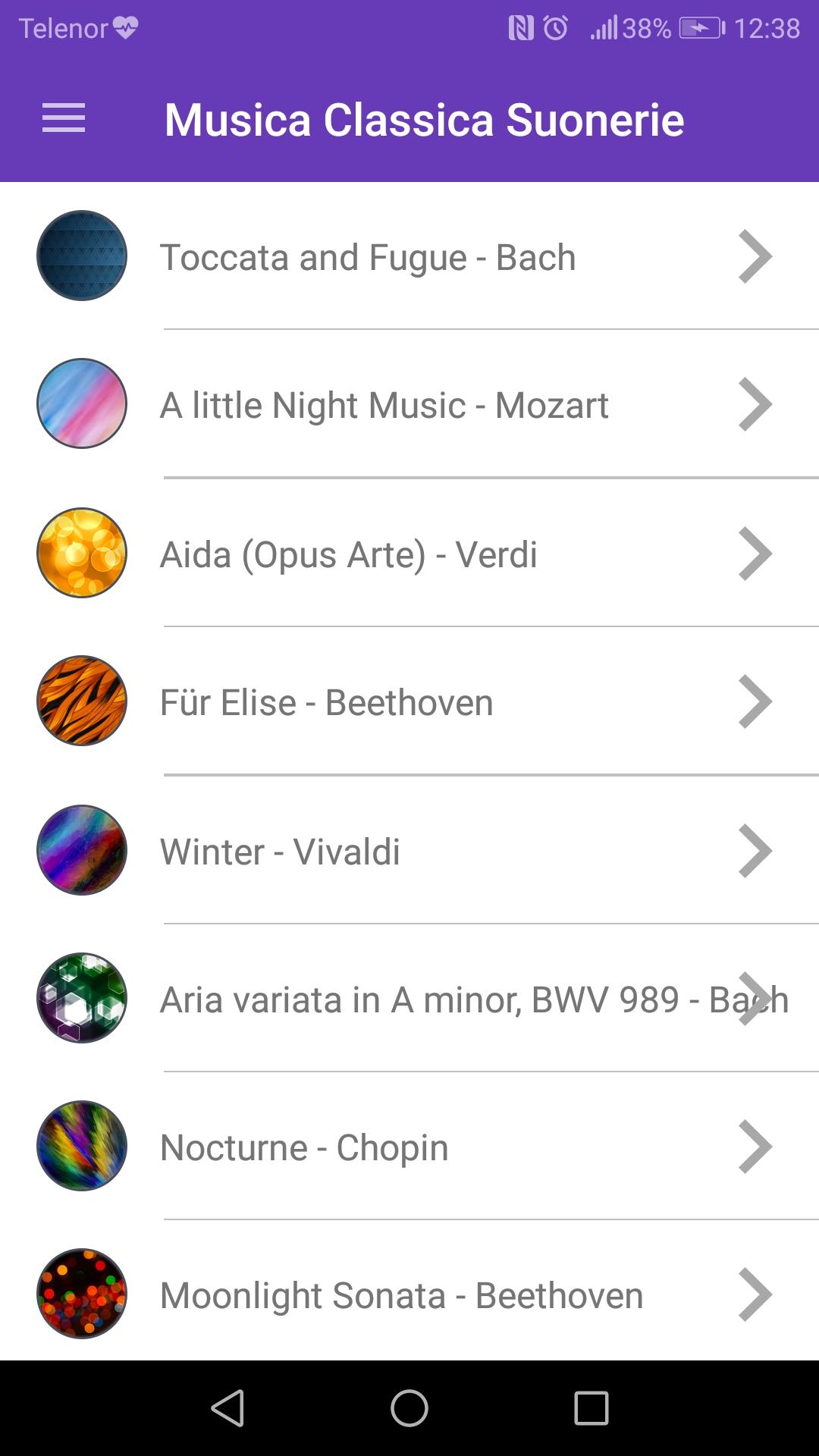 Musica Classica Suonerie può essere il tuo assistente spirituale di ogni giorno. Chiudi gli occhi, immagina di essere in un bel posto e goditi la musica classica famosa ogni volta che qualcuno ti chiama. Scegli tra le varie composizioni conosciute in tutto il mondo Per Elisa, Inno alla gioia, Le Quattro Stagioni, Moonlight Sonata e A Little Night Music. Se ti piacciono le sinfonie, le opere liriche e le sonate, Musica Classica Suonerie è l'applicazione perfetta per te! Questa applicazione ha anche musica classica rilassante e pianoforte classico. Lasciati emozionare ogni volta che senti queste suonerie classiche. Ti senti già meglio, non è vero? Ora apri gli occhi e senti la magia della musica classica.