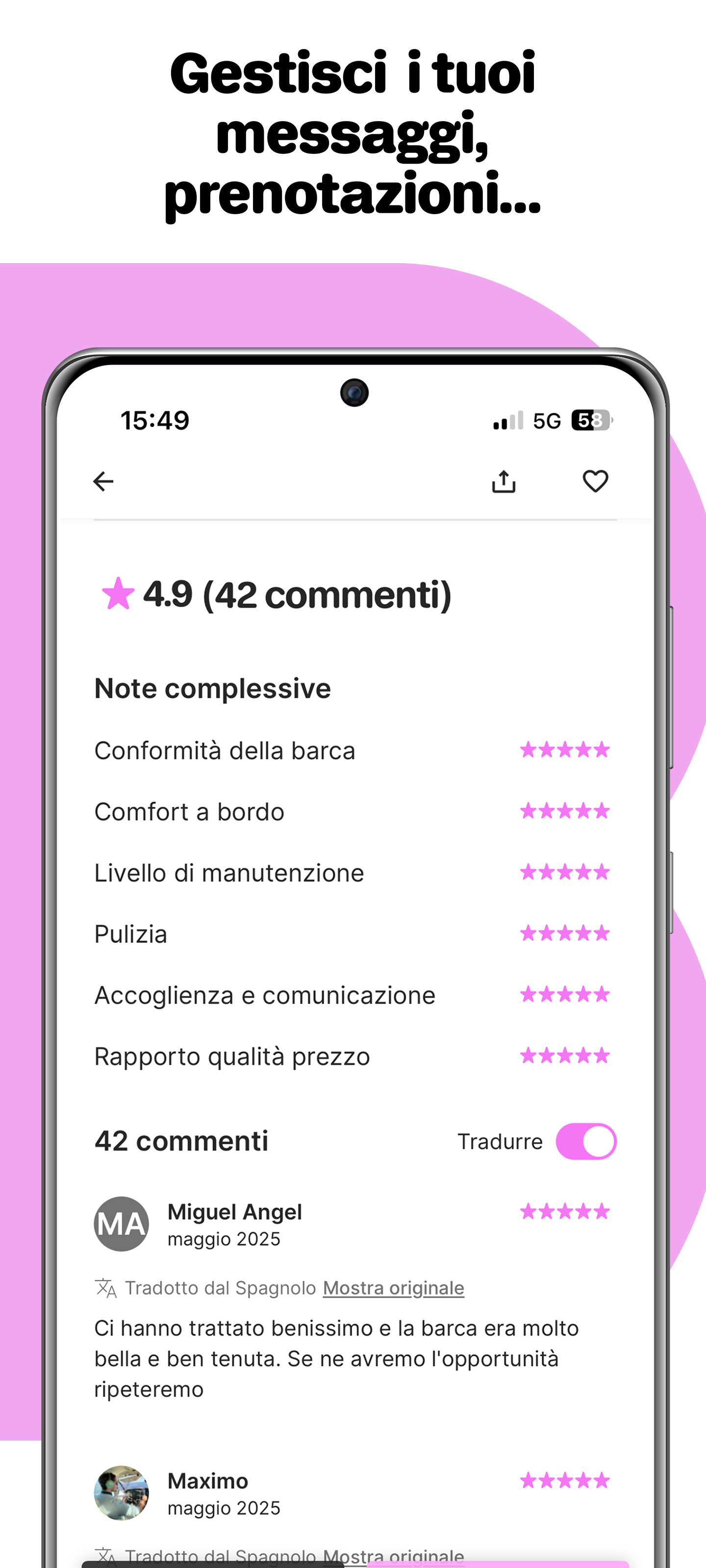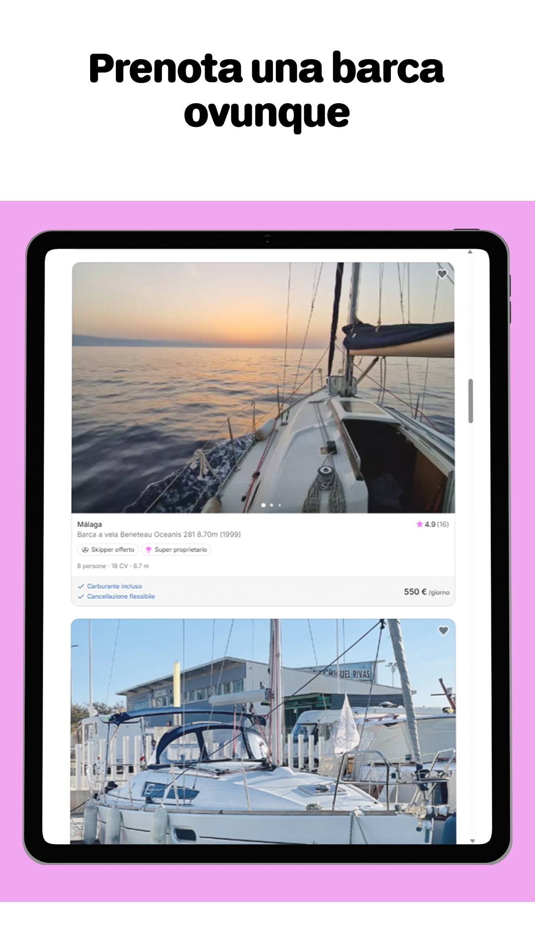 Click&Boat è il leader del noleggio barche, che permette a tutti gli appassionati di nautica di vivere avventure uniche sull’acqua, con amici o in famiglia. Con oltre 55.000 barche disponibili in più di 100 paesi, puoi confrontare e prenotare facilmente l’imbarcazione ideale: barca a vela, catamarano, yacht, barca a motore e altro ancora. Che sia per un giorno o una vacanza completa, con o senza skipper, vivi un’esperienza su misura. Anche senza patente nautica, potrai trovare l’imbarcazione perfetta per la tua fuga in mare e goderti attività come pesca, sci nautico, snorkeling o un rilassante giro in barca. ➤ Esperienze uniche a bordo Con Click&Boat puoi creare ricordi duraturi con esperienze personalizzate sull’acqua. Regalati una crociera al tramonto, organizza un addio al celibato o nubilato a bordo di una barca privata, oppure partecipa a una battuta di pesca in mare con i tuoi cari. Vuoi imparare a navigare? Approfitta di una lezione di vela con uno skipper esperto. Qualunque sia il tuo piano, la nostra app ti aiuterà a trasformare il tuo noleggio barca in una vera avventura in mare. ➤ Noleggio barche con o senza skipper Che tu sia un navigatore esperto o un principiante, l’app Click&Boat ha qualcosa per tutti, offrendo opzioni di affitto barche personalizzate in base alle tue esigenze. Noleggia una barca con skipper per goderti una crociera rilassante, oppure prendi tu stesso il timone se hai la patente necessaria. Barche a vela, catamarani, yacht, gommoni e barche a motore sono disponibili in base alle tue preferenze. Con opzioni flessibili, vivi un’esperienza su misura e salpa alla scoperta degli ancoraggi più belli. ➤ Noleggia la tua barca Sei proprietario di una barca? Rendila redditizia e copri i costi di manutenzione, rimessaggio e ormeggio noleggiandola ad altri privati. Inserisci gratuitamente il tuo annuncio e ricevi le prime richieste di noleggio. Aggiungi i dettagli della barca, il prezzo, la disponibilità e belle foto per attrarre i locatari. Sei libero di accettare o rifiutare le richieste in base al profilo nautico dell’utente o alle recensioni ricevute da altri proprietari. ➤ Naviga in Italia e nel mondo Vuoi esplorare le regioni marittime più belle a bordo di una barca? Parti da Tropea, Palau o dalla costa della Sardegna per scoprire baie mozzafiato e acque cristalline. Noleggia un catamarano e naviga tra le isole del Lago di Garda o lungo le meraviglie costiere di Venezia e Napoli. Vivi l’atmosfera vivace e le spiagge soleggiate della Costiera Amalfitana o della Riviera Ligure. In ogni destinazione, il tuo noleggio barca ti porterà in luoghi indimenticabili lungo la costa, trasformando ogni uscita in barca in un viaggio unico ed emozionante. ➤ Prenotazione facile e veloce Trovare la tua barca a noleggio con Click&Boat è semplice! L’app ti consente di filtrare per tipo di barca, destinazione, date e attività acquatiche. Comunica direttamente con i proprietari per organizzare la tua uscita in barca o crociera nelle migliori condizioni. Approfitta di una piattaforma sicura, prezzi competitivi e un’ampia offerta per tutti i progetti nautici. Scopri il noleggio barche tra privati che fa per te. Contattaci: Sito web: https://www.clickandboat.com/it/ Facebook: https://www.facebook.com/clickandboat/ Instagram: https://www.instagram.com/clickandboat/