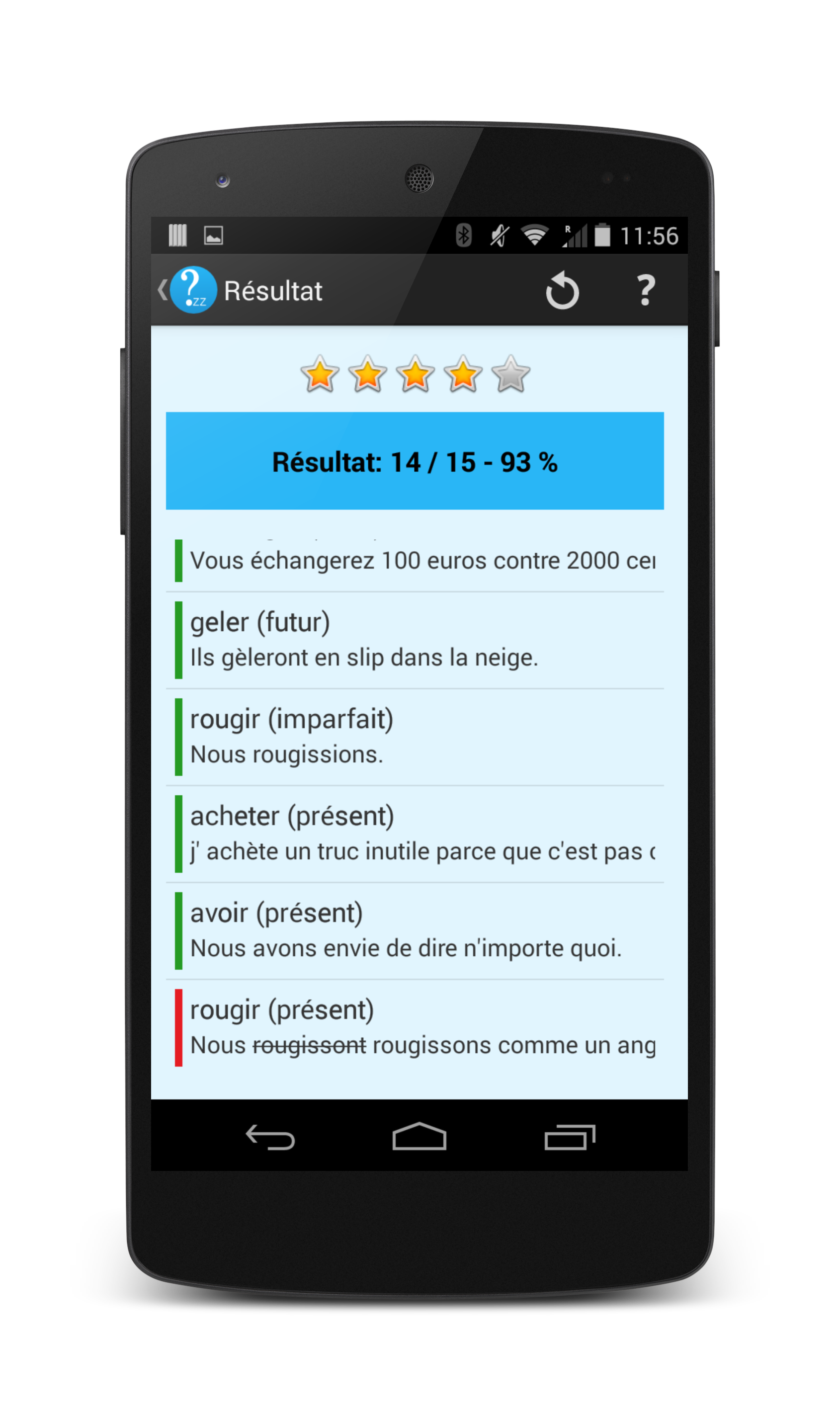 Risultato Alla fine del quiz, Conjuquizz presenta il risultato. Le domande risposte correttamente sono contrassegnate in verde. Le domande con risposta errata sono contrassegnate in rosso. Viene richiamata la risposta errata dell'utente e accanto ad essa viene contrassegnata la risposta corretta.
