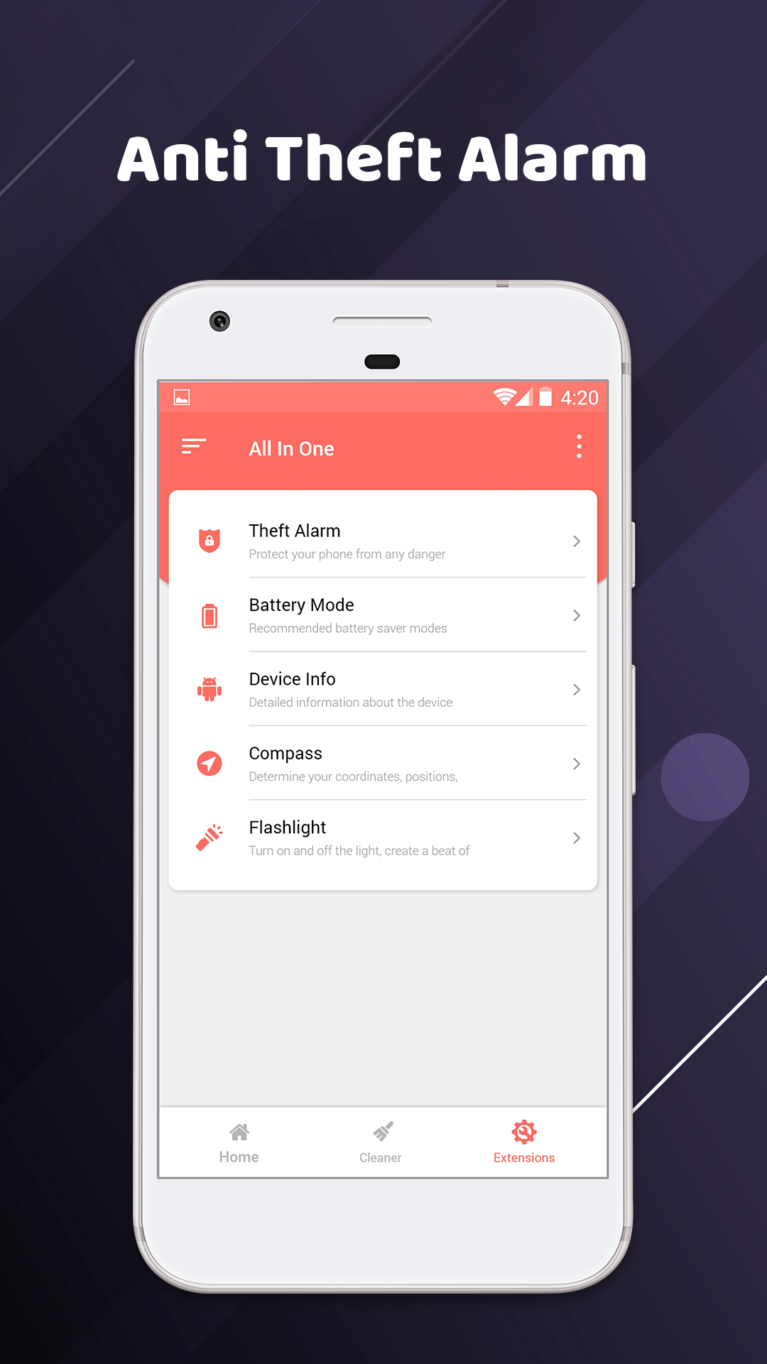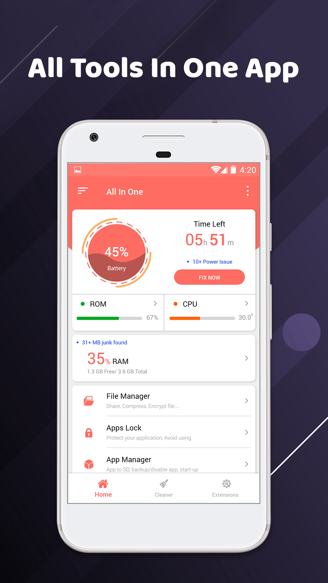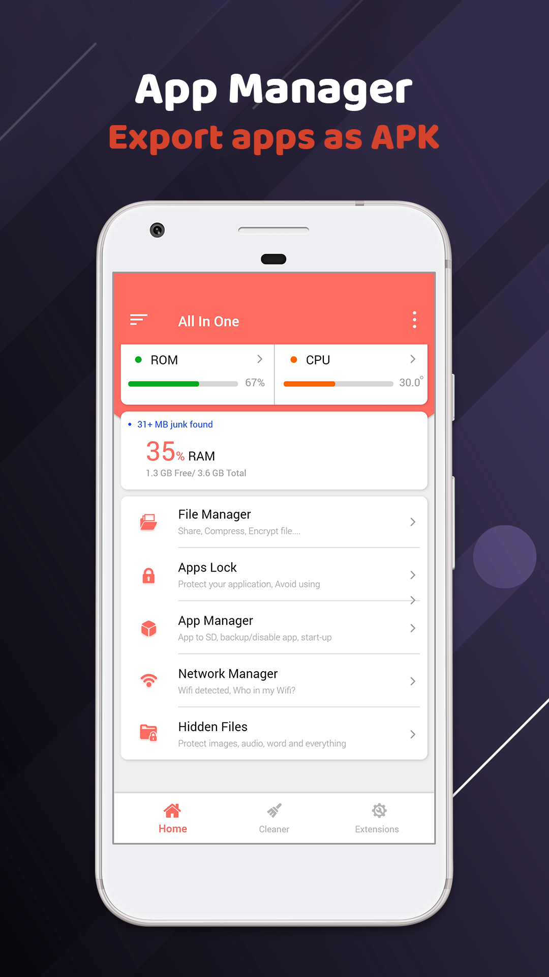 App Manager, Junk Cleaner, Speed Booster, Ottimizzatore di memoria, Ottimizzatore batteria, AppLock, Network Manager, Anti Theft Alarm, Flashlight, Compass che aiutano il tuo Android funziona al meglio. Tutti strumenti utili su un'unica app di piccole dimensioni.