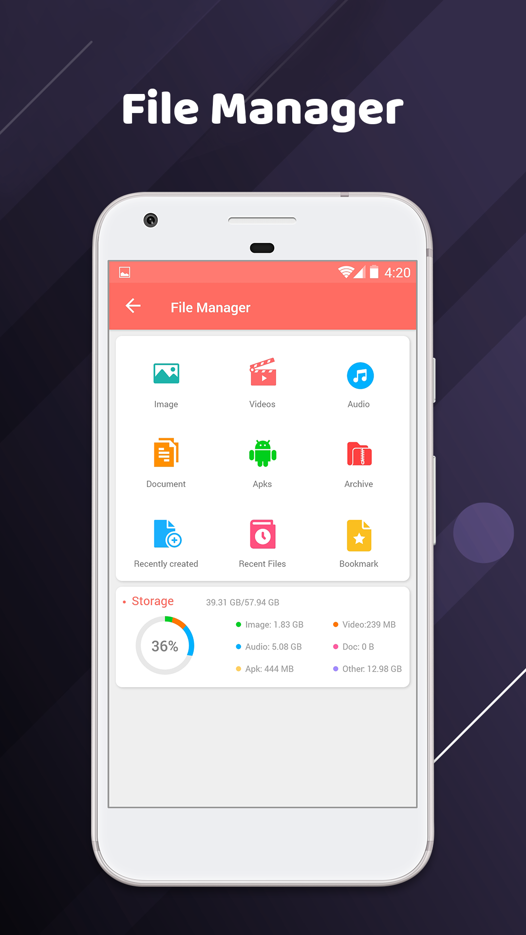 * File Manager • Consentire di esplorare file come immagini, musica, video, documenti, pacchetti apk, file scaricati memorizzati su scheda SD esterna.
