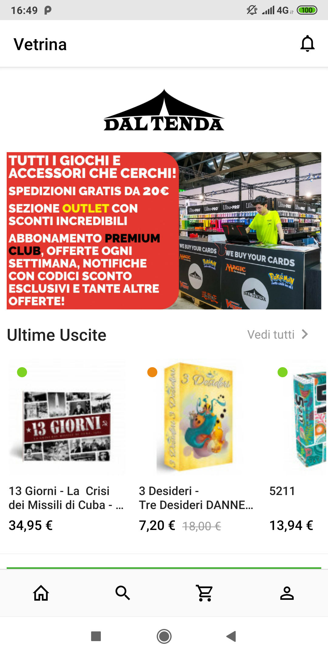 Migliaia di giochi, offerte esclusive In-App, gestione Ordini veloce con l’app Ufficiale Dal Tenda Shop! Scarica ora l’app e esplora l’offerta più conveniente su Giochi da tavolo, di carte, di ruolo, bustine, dadi e accessori e tanto altro. I motivi per scaricare e fare shopping con l’app sono tantissimi: • È intuitiva: A portata di click potrai consultare in tempo reale la disponibilità e le informazioni di tutti i prodotti, i prezzi, gli ordini. Appena completato un ordine potrai essere aggiornato sul Pagamento, la Spedizione, la Consegna e l’Annullamento. • Conviene: Solo tramite l’app potrete visualizzare gli esclusivi banner Offerta e ricevere le Notifiche con dei codici sconto pensati per voi. Oltre a ciò potrai utilizzare tutti gli altri codici sconto che diffondiamo nei pacchi, in fiera e nei social oltre a tutti i vantaggi del Premium Club. • È sicura: Potrai acquistare online e pagare in tutta comodità con la certezza che faremo di tutto per farvi arrivare direttamente a casa l’ordine nel minor tempo possibile. • È per voi: Abbiamo implementato l’app a seguito di numerosissime richieste da parte della nostra community di clienti. Entra a farne parte anche tu! Con l’app Dal Tenda Shop potrai acquistare: - Giochi da tavolo - Giochi di Ruolo - Giochi di Carte - Bustine e Accessori - Dadi - Outlet di tutte le sezioni precedenti e altre sezioni stanno per arrivare a brevissimo! Scarica ora l’App e entra nella community Dal Tenda.