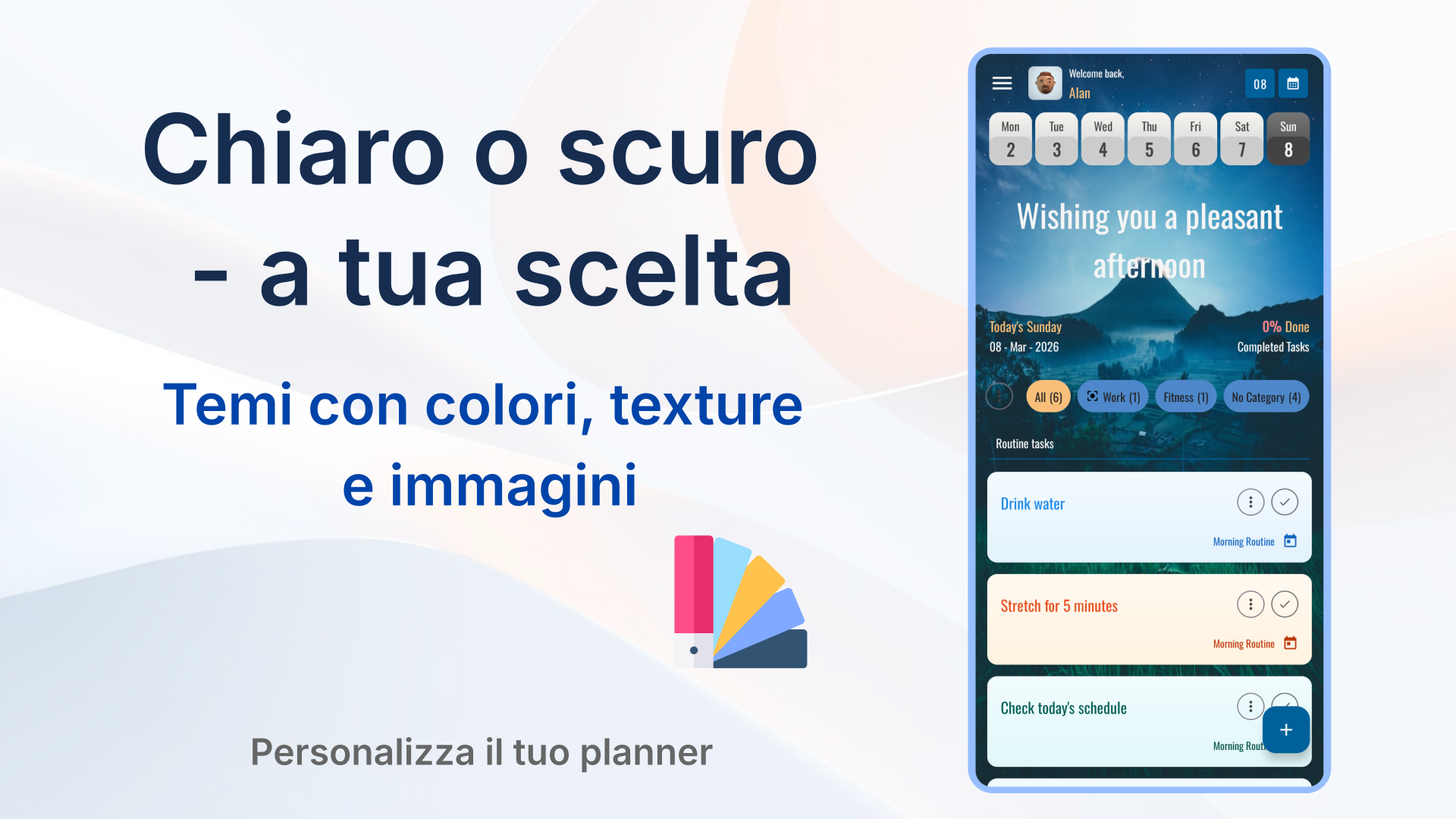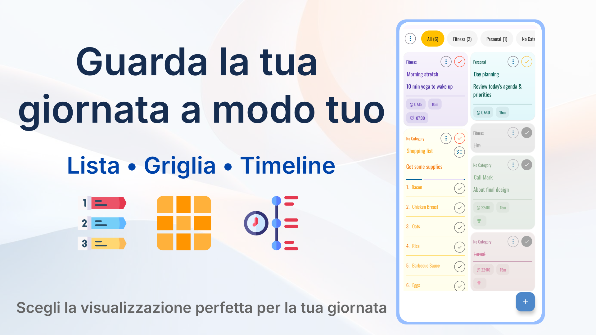 🚀 Inizia la tua mattina con un planner di routine gratuito. Aggiungi attività per lavoro, fitness, casa o scuola. Crea una lista della spesa. Pianifica la tua giornata dall'inizio alla fine e monitora le tue abitudini con un planner facile da usare.