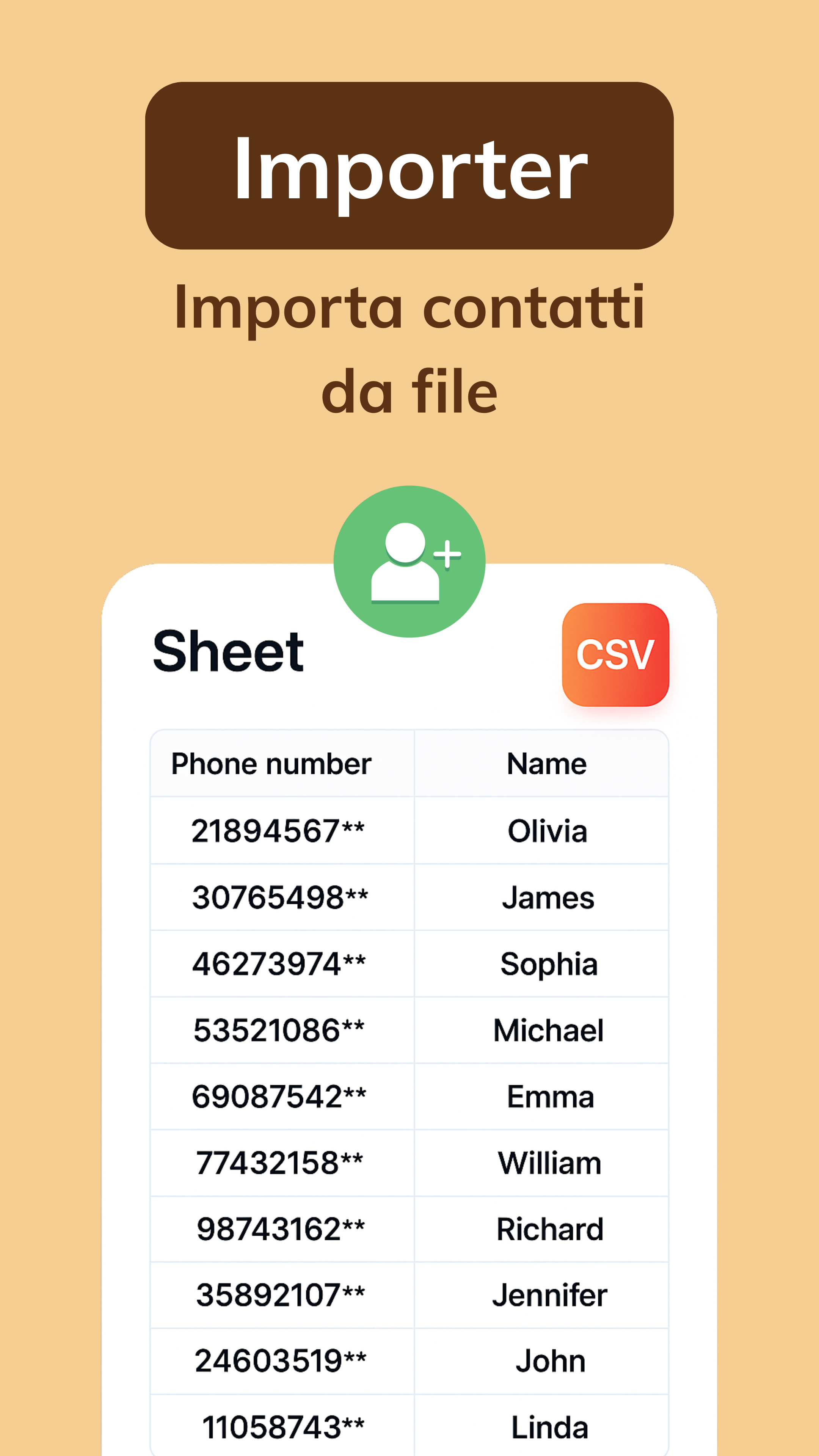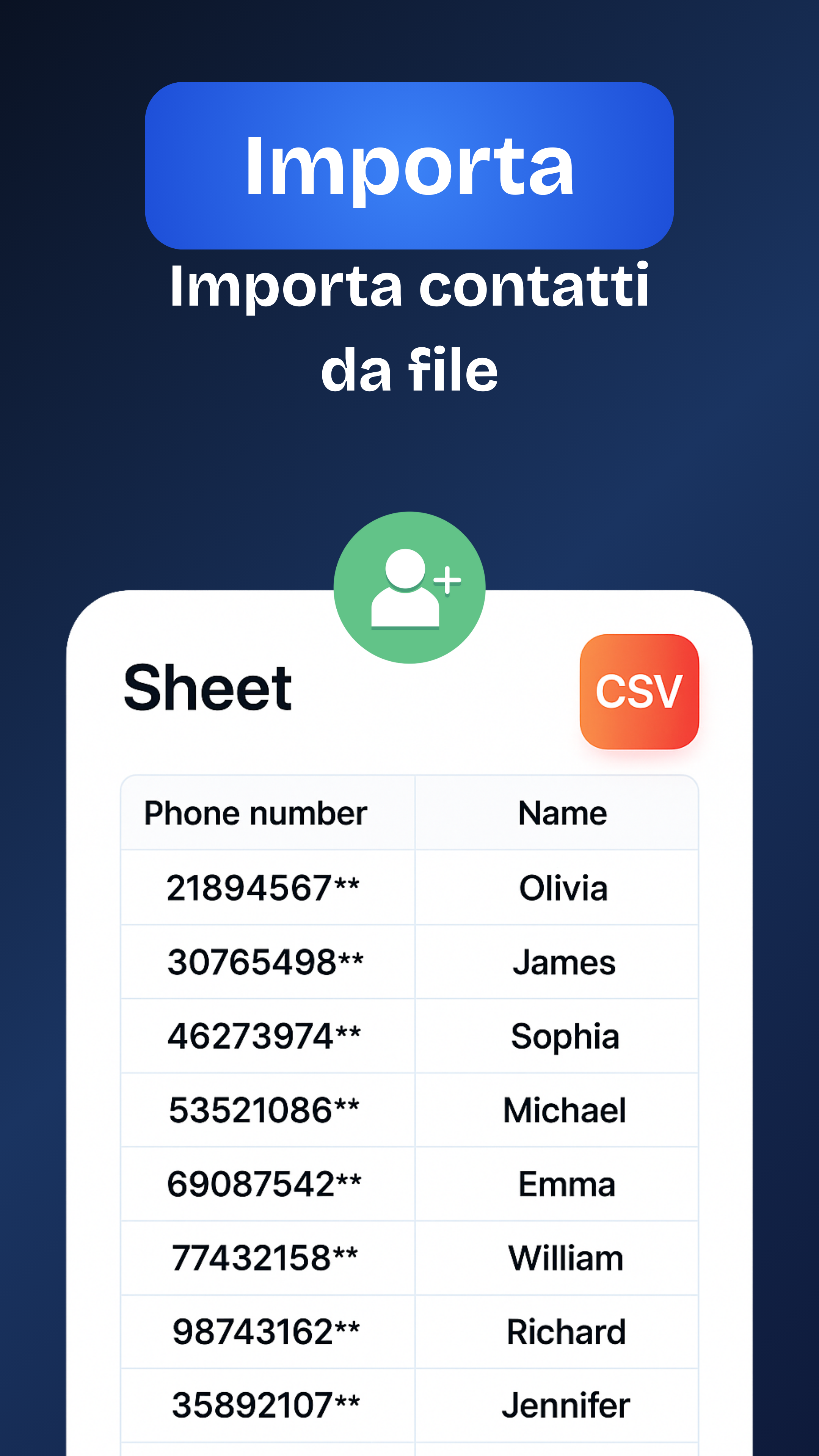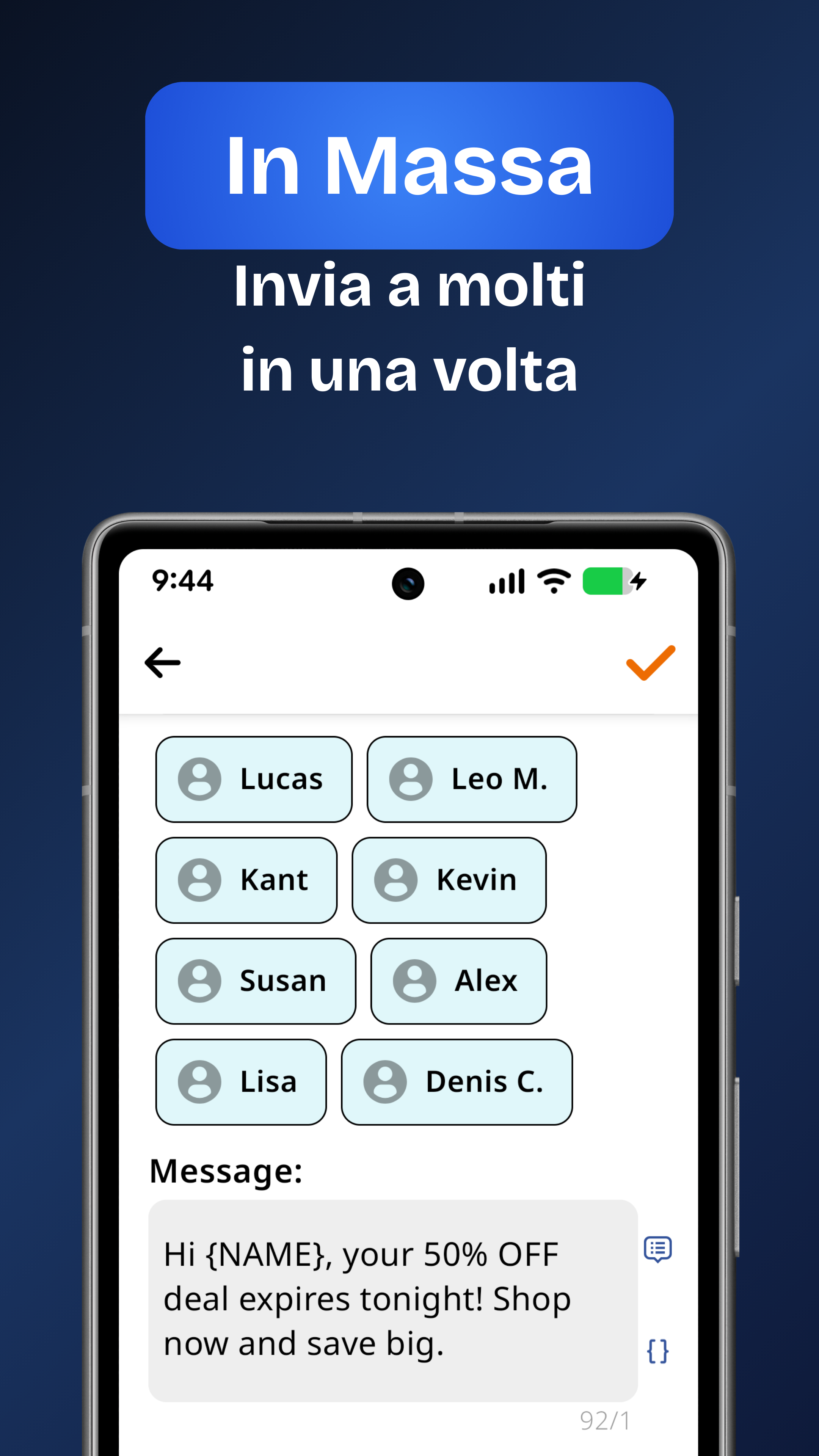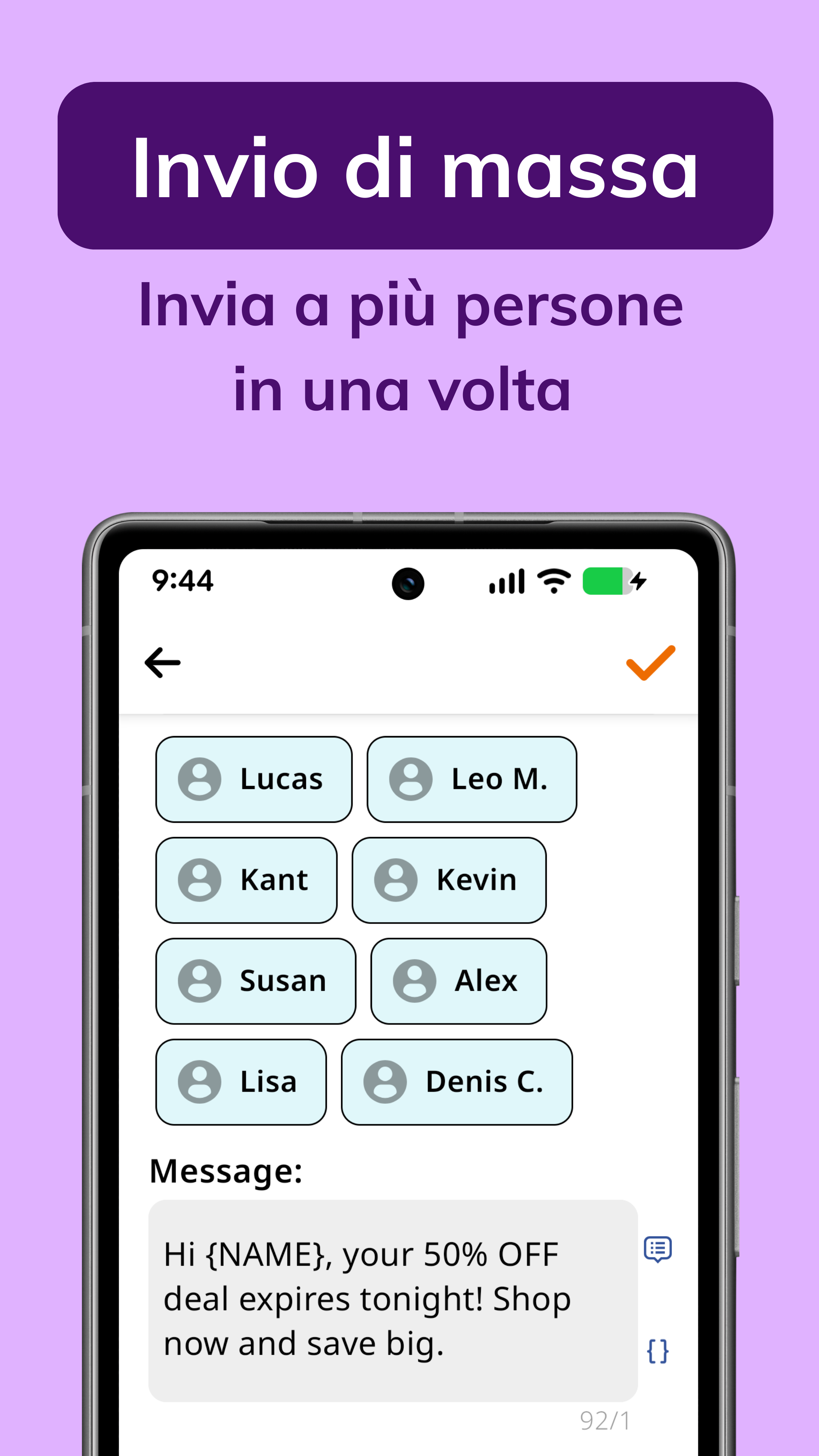 - Personalizzazione intelligente: Inserisci i nomi dei contatti usando segnaposto come {NOME}, {NOME_PROPRIO} o {COGNOME}.