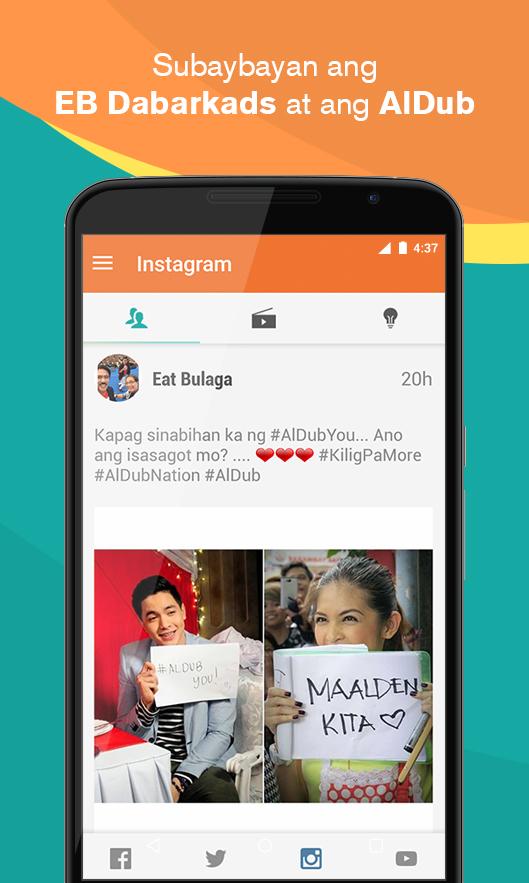 All the latest happening from Eat Bulaga Dabarkads including the kalye-serye “AlDub” of Yaya Dub and Alden is here. View EB’s posts on their social media accounts - Facebook, Twitter, Instagram and YouTube.
