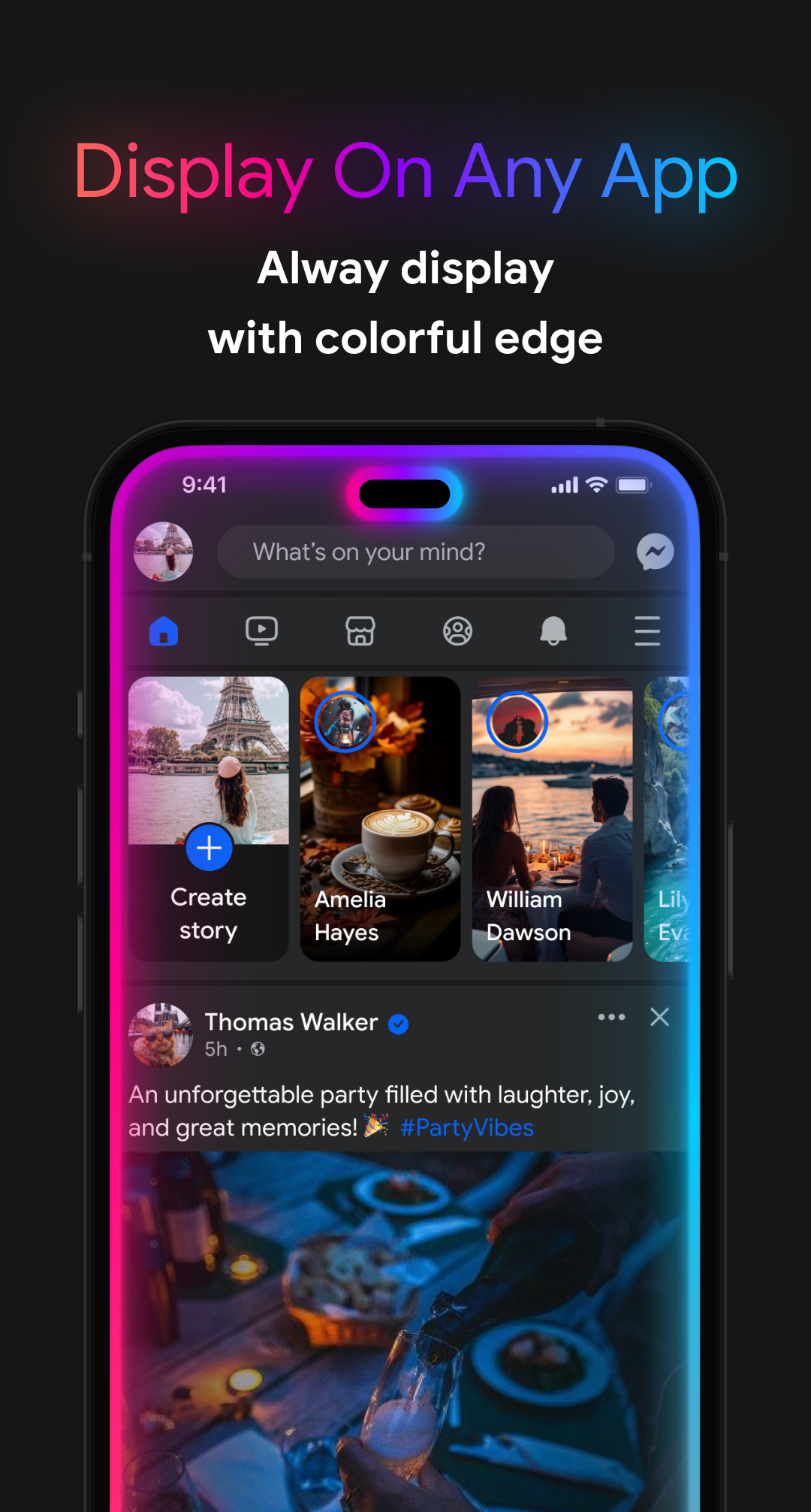 Funzioni di illuminazione laterale:- Imposta il bordo dello schermo multicolore sullo sfondo animato.