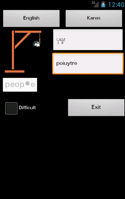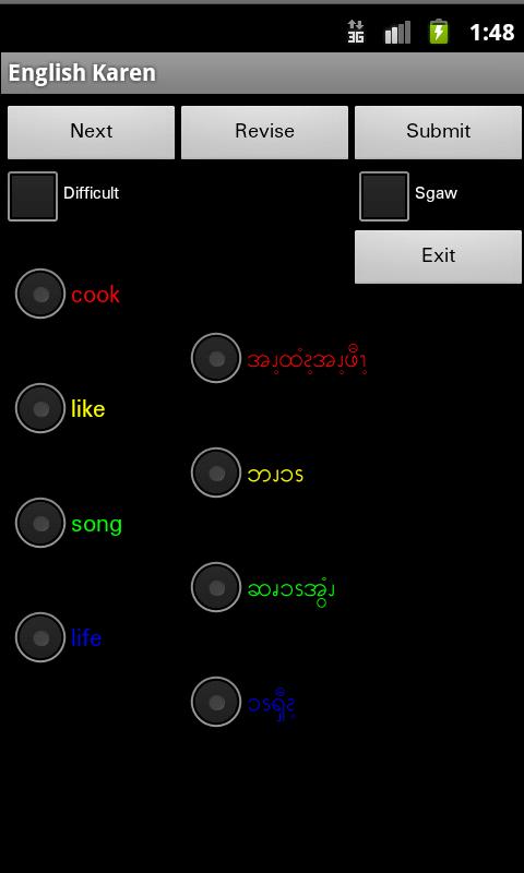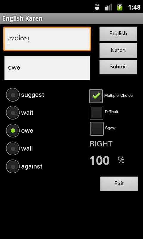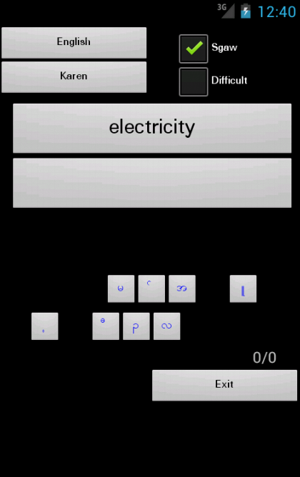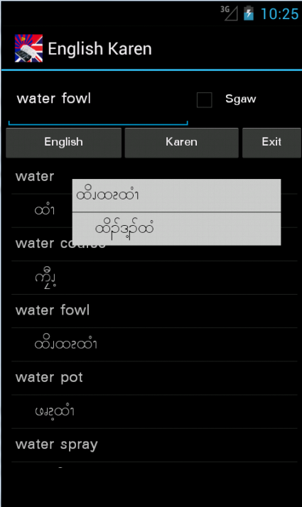 English Karen Dictionary – travel dictionary to translate English to Karen displaying a list of words in Karen (Sgaw or Pwo). The dictionary also translates from Karen to English. Copying a word from the translated list for a reverse translation can be used to find synonyms and to understand the broader use of the Karen word in the English language. Although the English Karen dictionary does not provide definitions or examples, the use of the translation software in this way provides you with a mechanism to better understand Karen words in the English context without the need for definitions. 15K references. Learning games help to build vocabulary, using flashcard, multiple choice, spelling and word matching. Play the classic Hangman game. The word to guess is represented by a row of dashes, giving the number of letters. If the suggested letter occurs in the word, it is displayed in the correct position. If the suggested letter does not occur in the word, one element of the man it drawn. The game is over when the word is complete, or the hanged man is fully drawn. View the history of words used in the games and click on the list to show synonyms. Ideal for travelers, business people or students. May require paid TTS voices. FAQ Q. How quick are the dictionary searches A. This app takes up a small amount of space on your device and is very quick Q. Are there definitions in the dictionary A. No, but if you touch on any of the found words synonyms are displayed helping to show its use in a broader context Q. How do I play the flashcard learning game A. Select the language for the head word and select the matching word from the list below and select Submit. Q. I am a more advanced learner can I play a harder set of words A. Yes, tick the Advanced box to play against the full dictionary or untick to play against the 1500 words needed for high school Q. Can I type an answer for the head word intead of having multiple choices, for the flashcard game A. Yes, this is for more advanced learners. Untick the Multiple Choice box, type your answer and select Submit. Q. How do I play the Word Match game A. Select New, then touch the head word in the left column and it's matching word in the right column. Its colour will change. Repeat this for all words and then select Submit to check the answers Q. Can I use the Word Match game as a revision aid or word of the day A. Yes, select Revise to see the left and right words in matching order Q. Can I see synonyms in the word games A. Yes, touch any word in the game, after you have submitted your answer, to see synonyms and the broader meanings for each word. Q. Can I see a list of words that have been used in the games A. Yes, select Review History from the main menu Q. Can I see synonyms in the History A. Yes, touch any word in the history list to display synoyms Q. Can I clear the game history A. Yes, use a long touch on the list of word to be prompted to clear the history