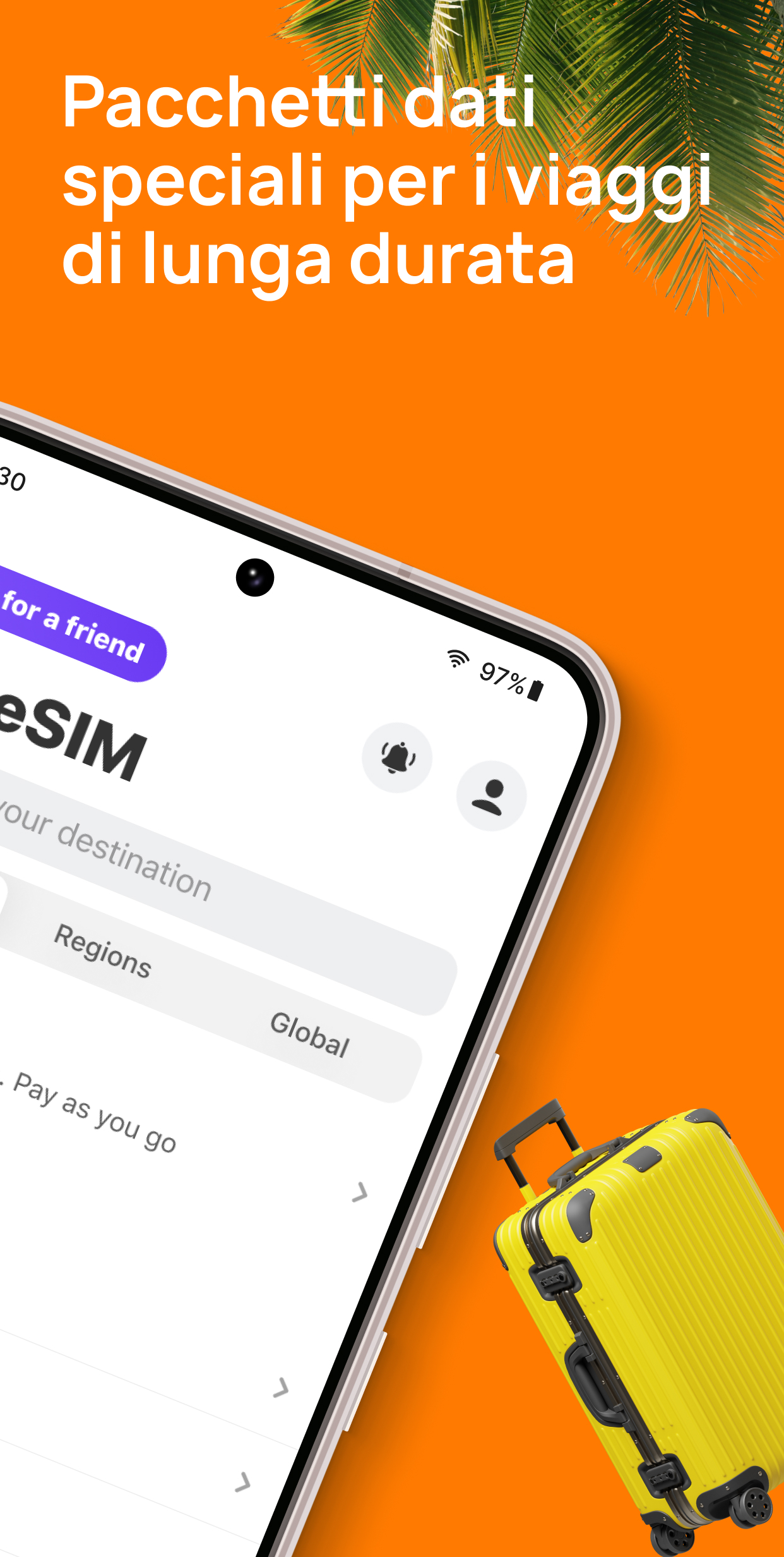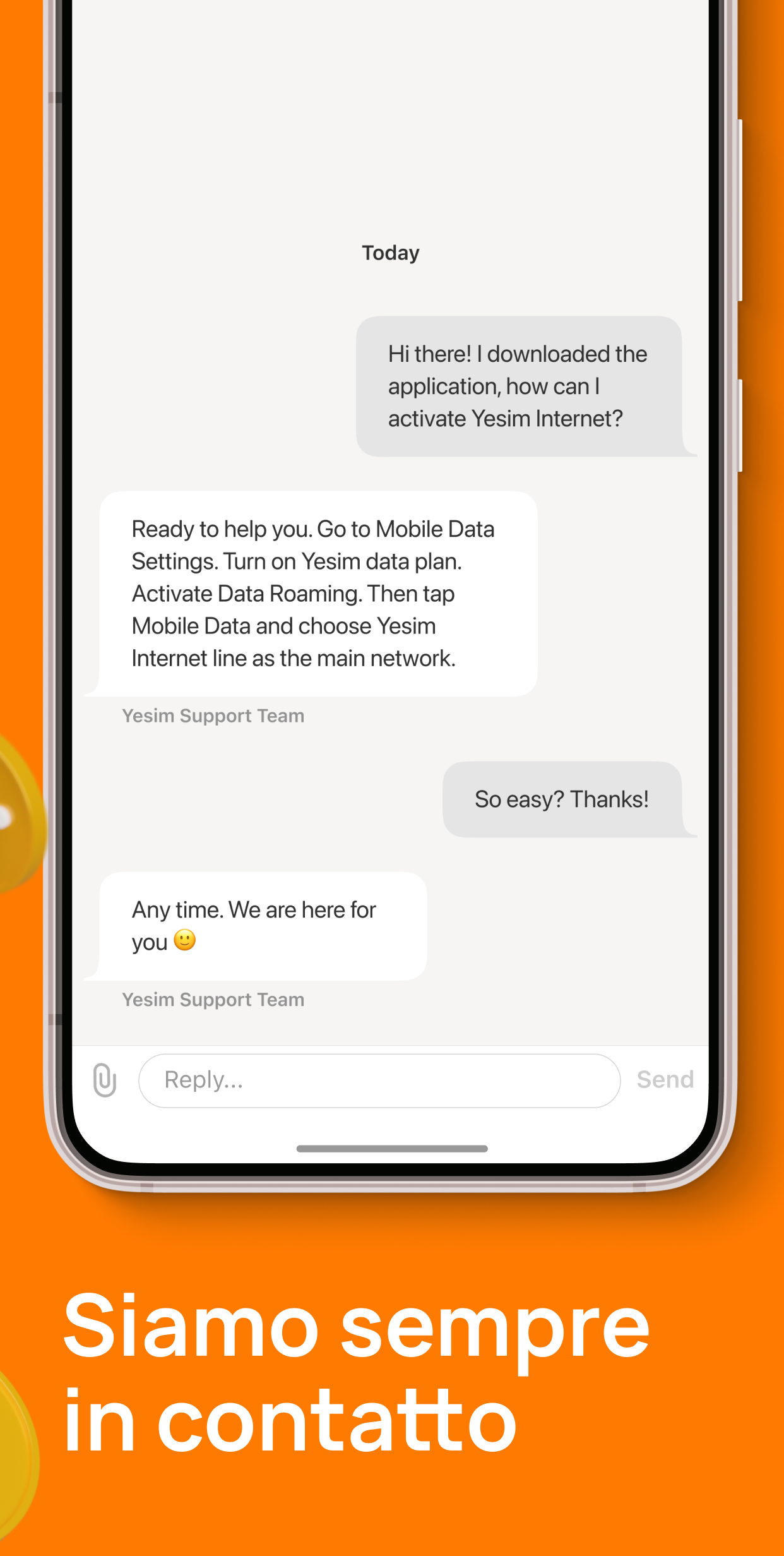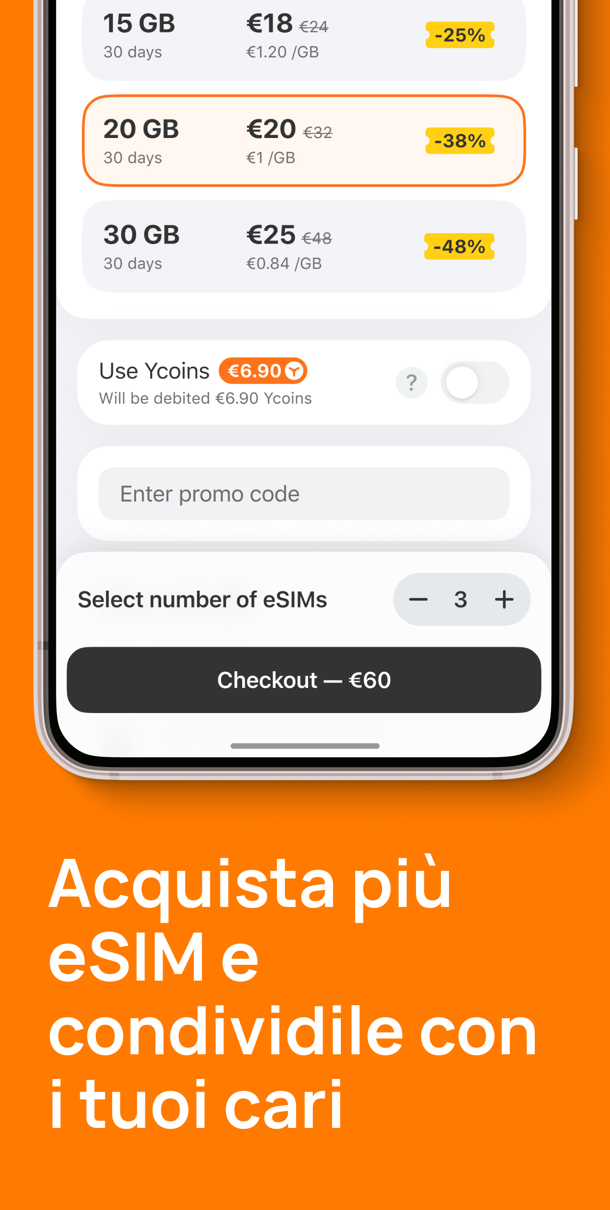 Rimani connesso senza sforzo 🌍 ovunque tu viaggi con Yesim eSIM. Yesim eSIM offre internet mobile affidabile 📱 in oltre 200 destinazioni, permettendoti di esplorare il mondo senza tariffe di roaming o Wi-Fi poco affidabili. Rimani connesso con internet veloce, sicuro e conveniente per ogni viaggio ✈️. Perché scegliere Yesim eSIM? 🌐 Copertura globale: Yesim eSIM fornisce copertura internet in oltre 200 destinazioni, garantendo connettività affidabile nelle principali città e nelle aree remote. Rimani sicuro ovunque tu vada. 💡 Piani dati flessibili: Scegli tra piani fissi o internet illimitato fino a 365 giorni. Yesim eSIM offre opzioni per ogni tipo di viaggio. 💰 Opzioni convenienti: Goditi tariffe locali per destinazioni selezionate, insieme a sconti regolari e offerte speciali. Yesim eSIM offre un modo conveniente per rimanere connessi con tariffe competitive che si adattano al tuo budget. 🌟 Piani illimitati: Con Yesim eSIM, i dati illimitati significano copertura internet continua durante il tuo viaggio. Rimani connesso e naviga con facilità, esplorando senza limiti. 💳 Opzioni di pagamento flessibili: Gestisci facilmente il tuo Yesim eSIM con opzioni di pagamento flessibili, comprese le criptovalute. L'app Yesim ti consente di selezionare rapidamente un piano e fare pagamenti sicuri per una connessione senza interruzioni. 📱 Compatibilità universale: Yesim eSIM funziona con qualsiasi dispositivo compatibile con eSIM, inclusi gli smartphone e i tablet più recenti. ⚡ Attivazione e configurazione istantanea: Dimentica le SIM fisiche con l'attivazione digitale di Yesim. Scarica l'app, scegli il tuo piano e attiva la tua eSIM in pochi secondi per una connessione immediata. 🌍 Piano internazionale: Rimani connesso ovunque tu vada con il Piano Internazionale di Yesim. Un eSIM copre oltre 140 paesi, fornendo accesso a internet senza bisogno di cambiare SIM. Perfetto per i viaggiatori e i viaggi multi-destinazione! 🛠️ Supporto 24/7: Il nostro team di supporto dedicato è disponibile 24/7 tramite chat dal vivo, aiutandoti con la configurazione del tuo Yesim eSIM o risolvendo problemi di connessione quando necessario. Come funziona Yesim eSIM 📥 Scarica l'app Yesim: Scarica l'app per esplorare i piani e gestire facilmente la tua connessione. 🌍 Scegli il tuo piano eSIM: Scegli tra opzioni per più di 200 destinazioni, da dati minimi a internet illimitato. 🔗 Installa e connettiti istantaneamente: Acquista e attiva il tuo Yesim eSIM con un solo tocco. Una volta installato, ti connetterai istantaneamente a una rete locale, assicurando l'accesso ai dati non appena arrivi. Perché i viaggiatori scelgono Yesim eSIM? ⏰ Connessione immediata: Accedi a internet in pochi minuti utilizzando la nostra configurazione digitale eSIM. 🚫 Nessuna tariffa di roaming: Con Yesim eSIM, evita le alte tariffe di roaming scegliendo piani dati convenienti. 🆔 Attivazione SIM digitale: Non è necessaria una SIM fisica; goditi l'attivazione digitale per una connessione internet senza interruzioni. 🔧 Piani dati flessibili: Personalizza il tuo piano dati con una varietà di opzioni internet per adattarlo al tuo viaggio. 📊 Gestione senza interruzioni: Gestisci internet, dati e la tua SIM virtuale in un'app facile da usare. Vivi il futuro della connettività mobile per i viaggi con Yesim eSIM Viaggia senza problemi con Yesim eSIM, eliminando la necessità di SIM fisiche. Rimani connesso senza tariffe nascoste o interruzioni, gestisci il tuo internet senza sforzo e goditi l'accesso sicuro ovunque tu vada. Il tuo compagno di viaggio perfetto 🗺️. Scopri di più su Yesim eSIM Sito web: https://yesim.app/ Politica sulla privacy: https://yesim.app/privacy-policy/ Termini e condizioni: https://yesim.app/terms-of-service/