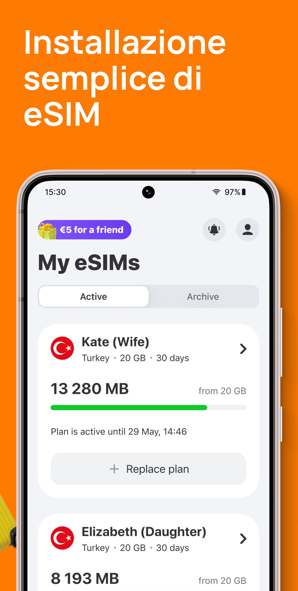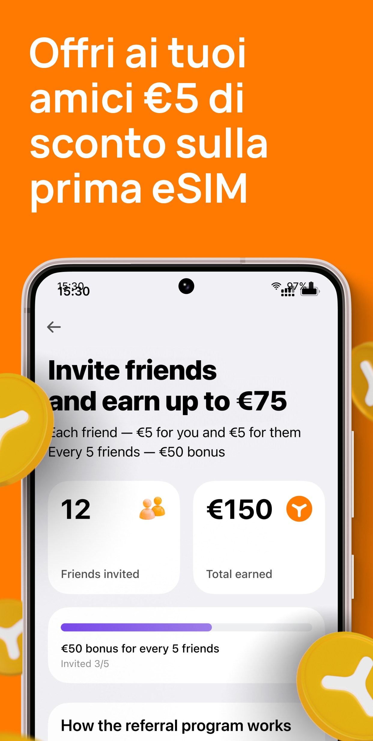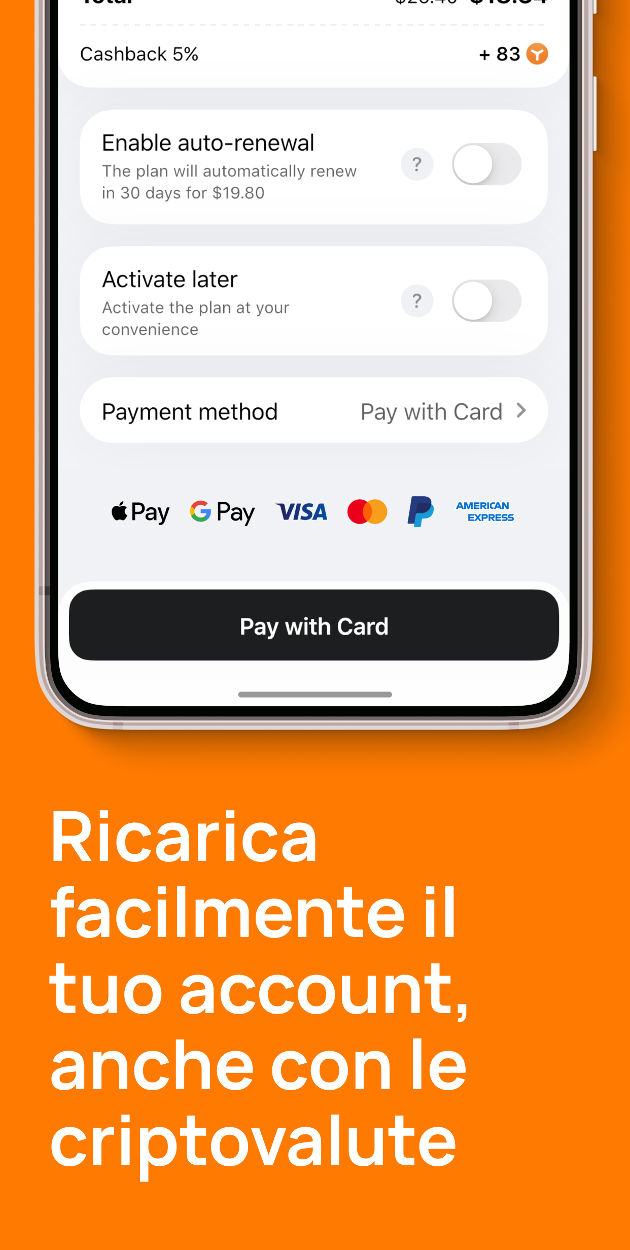 Rimani connesso senza sforzo 🌍 ovunque tu viaggi con Yesim eSIM. Yesim eSIM offre internet mobile affidabile 📱 in oltre 200 destinazioni, permettendoti di esplorare il mondo senza tariffe di roaming o Wi-Fi poco affidabili. Rimani connesso con internet veloce, sicuro e conveniente per ogni viaggio ✈️. Perché scegliere Yesim eSIM? 🌐 Copertura globale: Yesim eSIM fornisce copertura internet in oltre 200 destinazioni, garantendo connettività affidabile nelle principali città e nelle aree remote. Rimani sicuro ovunque tu vada. 💡 Piani dati flessibili: Scegli tra piani fissi o internet illimitato fino a 365 giorni. Yesim eSIM offre opzioni per ogni tipo di viaggio. 💰 Opzioni convenienti: Goditi tariffe locali per destinazioni selezionate, insieme a sconti regolari e offerte speciali. Yesim eSIM offre un modo conveniente per rimanere connessi con tariffe competitive che si adattano al tuo budget. 🌟 Piani illimitati: Con Yesim eSIM, i dati illimitati significano copertura internet continua durante il tuo viaggio. Rimani connesso e naviga con facilità, esplorando senza limiti. 💳 Opzioni di pagamento flessibili: Gestisci facilmente il tuo Yesim eSIM con opzioni di pagamento flessibili, comprese le criptovalute. L'app Yesim ti consente di selezionare rapidamente un piano e fare pagamenti sicuri per una connessione senza interruzioni. 📱 Compatibilità universale: Yesim eSIM funziona con qualsiasi dispositivo compatibile con eSIM, inclusi gli smartphone e i tablet più recenti. ⚡ Attivazione e configurazione istantanea: Dimentica le SIM fisiche con l'attivazione digitale di Yesim. Scarica l'app, scegli il tuo piano e attiva la tua eSIM in pochi secondi per una connessione immediata. 🌍 Piano internazionale: Rimani connesso ovunque tu vada con il Piano Internazionale di Yesim. Un eSIM copre oltre 140 paesi, fornendo accesso a internet senza bisogno di cambiare SIM. Perfetto per i viaggiatori e i viaggi multi-destinazione! 🛠️ Supporto 24/7: Il nostro team di supporto dedicato è disponibile 24/7 tramite chat dal vivo, aiutandoti con la configurazione del tuo Yesim eSIM o risolvendo problemi di connessione quando necessario. Come funziona Yesim eSIM 📥 Scarica l'app Yesim: Scarica l'app per esplorare i piani e gestire facilmente la tua connessione. 🌍 Scegli il tuo piano eSIM: Scegli tra opzioni per più di 200 destinazioni, da dati minimi a internet illimitato. 🔗 Installa e connettiti istantaneamente: Acquista e attiva il tuo Yesim eSIM con un solo tocco. Una volta installato, ti connetterai istantaneamente a una rete locale, assicurando l'accesso ai dati non appena arrivi. Perché i viaggiatori scelgono Yesim eSIM? ⏰ Connessione immediata: Accedi a internet in pochi minuti utilizzando la nostra configurazione digitale eSIM. 🚫 Nessuna tariffa di roaming: Con Yesim eSIM, evita le alte tariffe di roaming scegliendo piani dati convenienti. 🆔 Attivazione SIM digitale: Non è necessaria una SIM fisica; goditi l'attivazione digitale per una connessione internet senza interruzioni. 🔧 Piani dati flessibili: Personalizza il tuo piano dati con una varietà di opzioni internet per adattarlo al tuo viaggio. 📊 Gestione senza interruzioni: Gestisci internet, dati e la tua SIM virtuale in un'app facile da usare. Vivi il futuro della connettività mobile per i viaggi con Yesim eSIM Viaggia senza problemi con Yesim eSIM, eliminando la necessità di SIM fisiche. Rimani connesso senza tariffe nascoste o interruzioni, gestisci il tuo internet senza sforzo e goditi l'accesso sicuro ovunque tu vada. Il tuo compagno di viaggio perfetto 🗺️. Scopri di più su Yesim eSIM Sito web: https://yesim.app/ Politica sulla privacy: https://yesim.app/privacy-policy/ Termini e condizioni: https://yesim.app/terms-of-service/