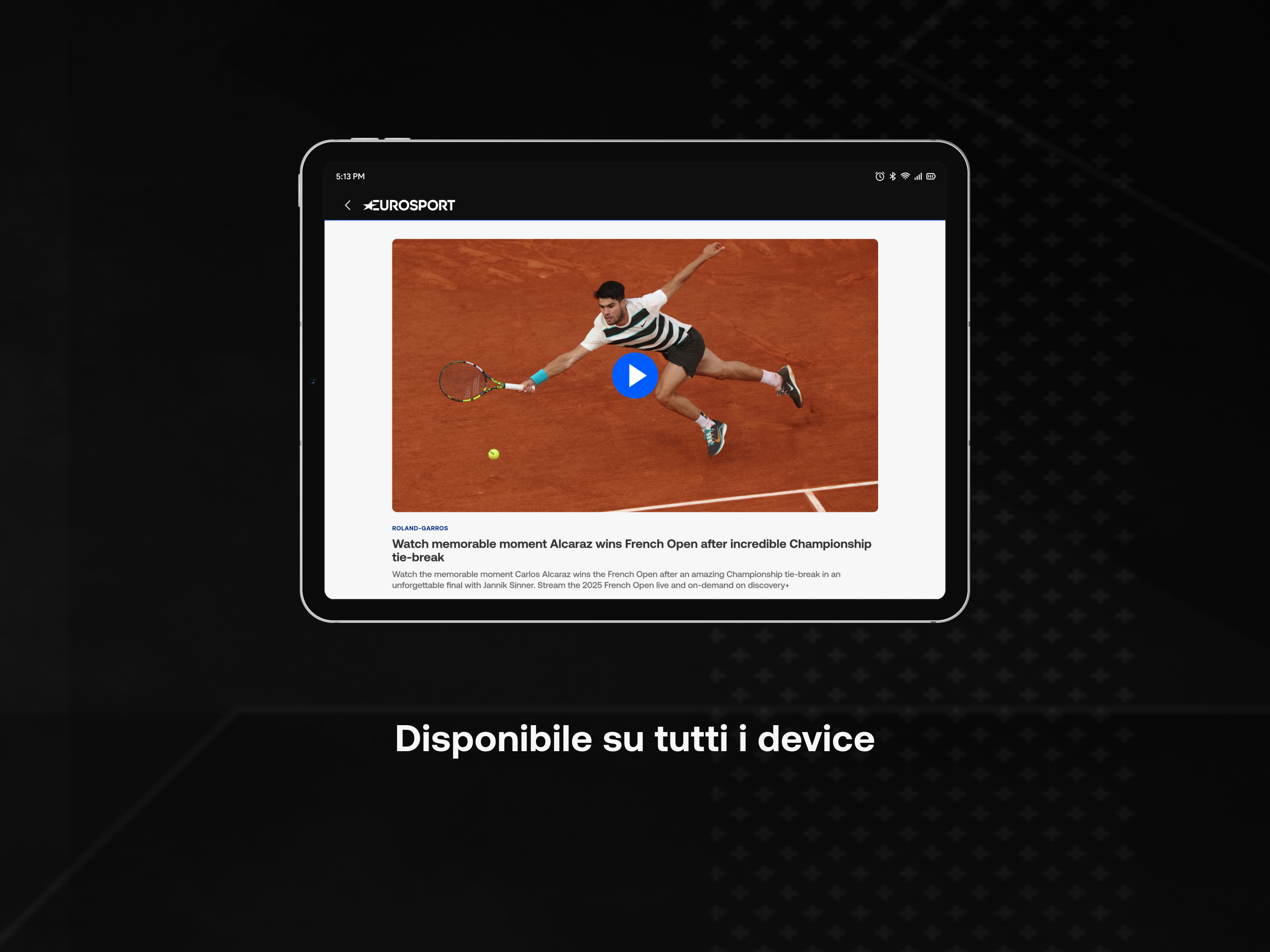 GUARDA SPORT IN DIRETTA: Accedi a Eurosport 1 & 2 con un abbonamento e guarda in live streaming gli eventi live esclusivi in HD sul tuo dispositivo. Registrati su [eurosport.com] per guardare ovunque su tutti i dispositivi