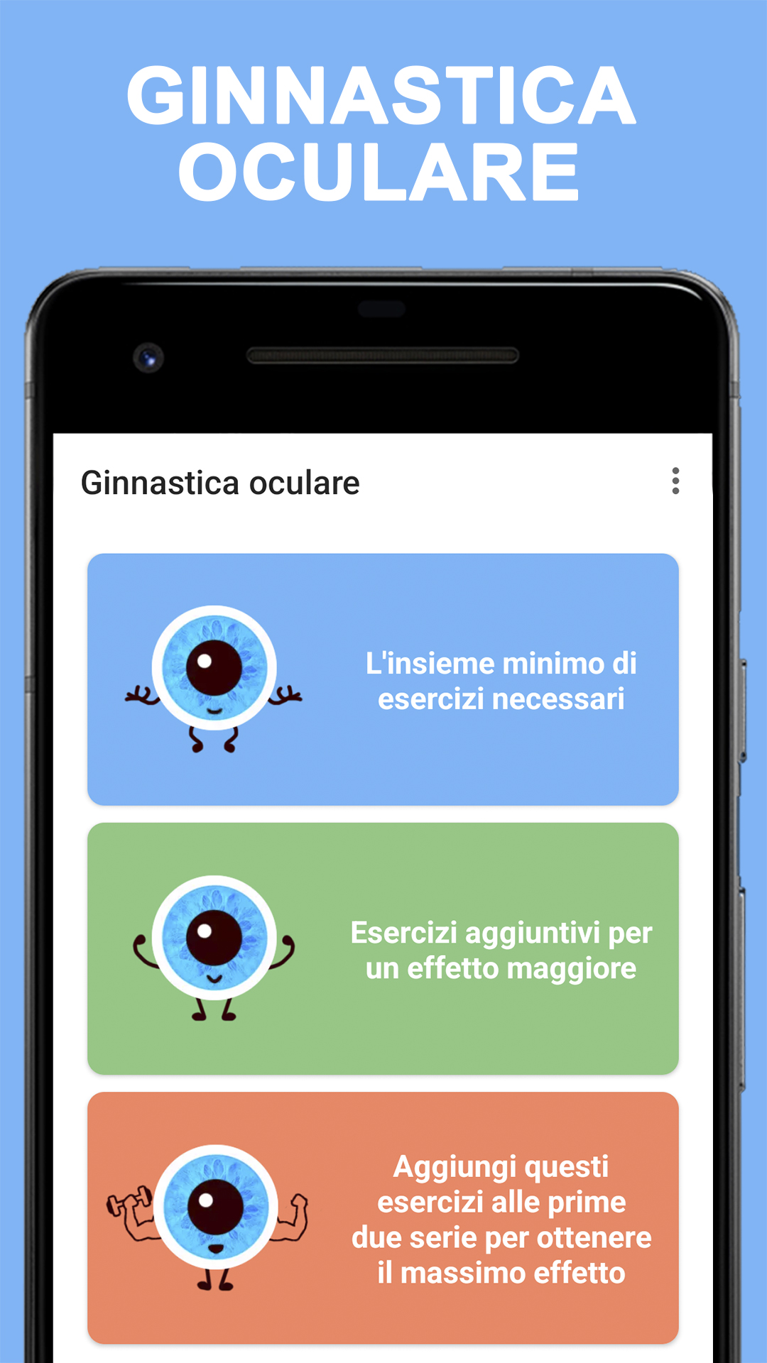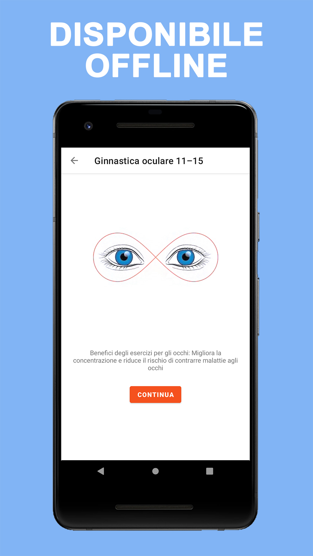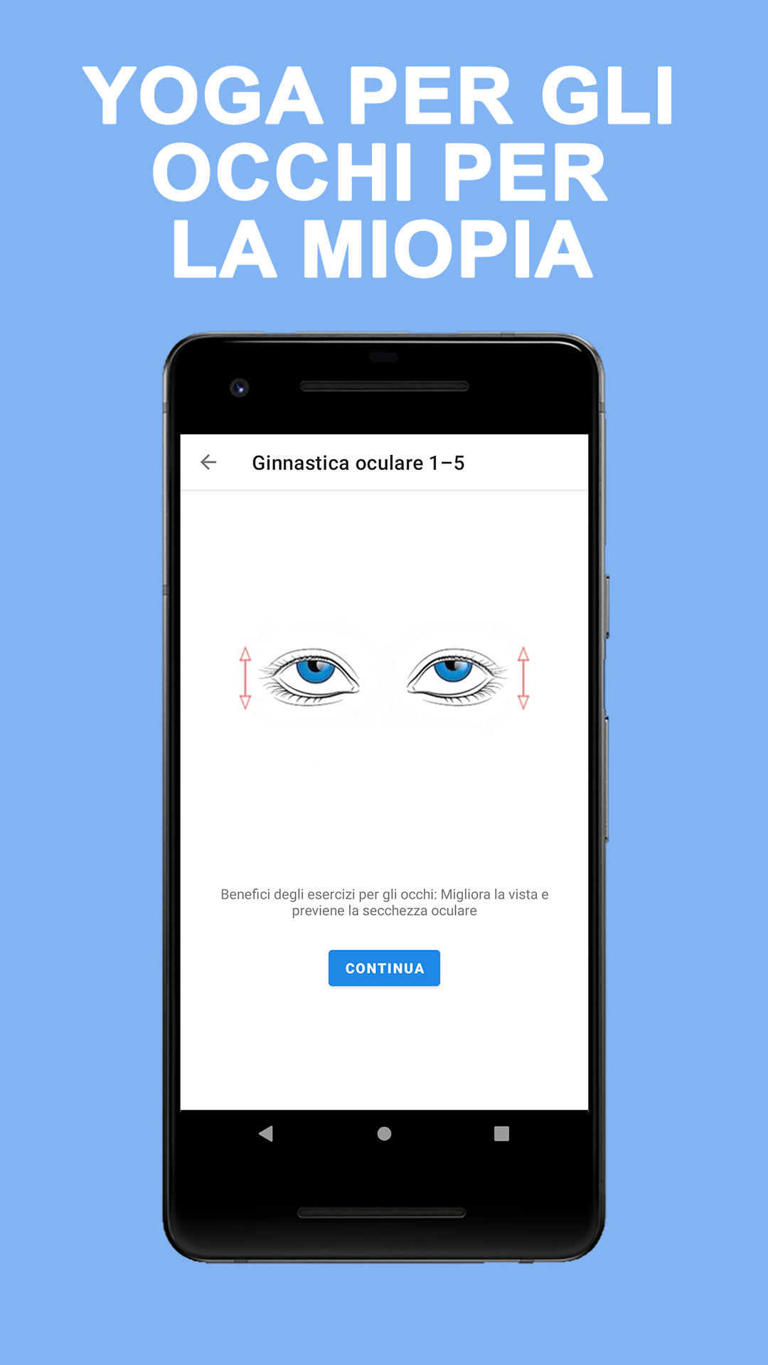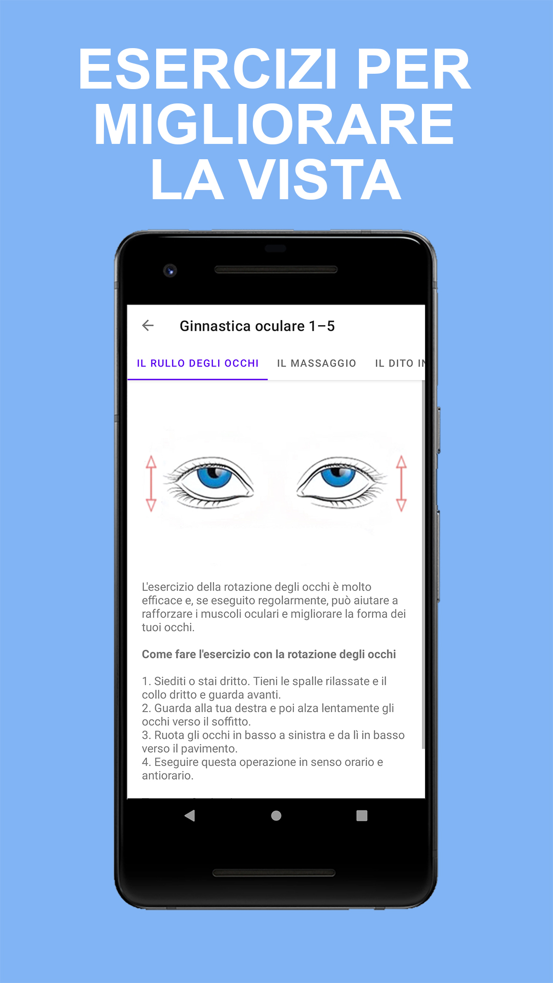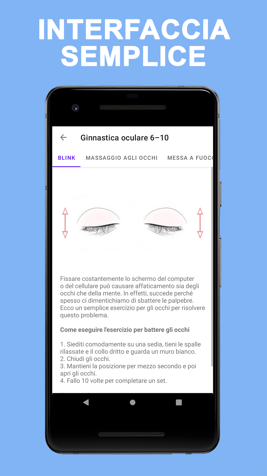 Esercitare gli occhi è come esercitare le braccia e le gambe. I tuoi muscoli diventeranno più forti, avrai più resistenza e avrai meno probabilità di sviluppare ulteriori problemi alla vista a causa dell'affaticamento degli occhi. Anche i nostri occhi hanno bisogno di esercizio regolare proprio come il resto del nostro corpo. Sappiamo che esercitare i muscoli fa bene alla salute. Che dire degli esercizi per gli occhi per migliorare la vista? Sebbene non ci siano esercizi oculari efficaci per l'astigmatismo, la miopia o l'ipermetropia, altrimenti noti come errori di rifrazione, gli esercizi oculari possono aiutare a ottimizzare le capacità visive. La terapia della vista, un tipo di terapia fisica per gli occhi, ha dimostrato di migliorare alcune condizioni che coinvolgono l'allineamento e la messa a fuoco degli occhi. Durante la terapia della vista, a un paziente viene prescritta una serie di esercizi oculari per l'occhio pigro, tra le altre condizioni. Mentre essere sotto le cure di un oculista può fornire maggiori indicazioni su come utilizzare gli esercizi per gli occhi, ci sono alcuni esercizi per i muscoli oculari che possono essere fatti a casa. Anche se non mi aspetto che questi esercizi per gli occhi migliorino rapidamente la vista, con diligenza, possono gradualmente aiutare con problemi di messa a fuoco e affaticamento della vista. Benefici degli esercizi per gli occhi L'esercizio per gli occhi, tradizionalmente sotto forma di terapia della vista, può aiutare a garantire che i due occhi lavorino insieme in modo efficace. Ci sono sintomi comuni che possono indicare che gli esercizi di rafforzamento degli occhi possono essere utili. Questi includono saltare righe o parole durante la lettura, chiudere un occhio, affaticamento degli occhi e mal di testa. La terapia della vista può affrontare i problemi con il giro degli occhi (strabismo) e l'occhio pigro (ambliopia), il tracciamento oculare (disfunzione saccadica) e l'eye teaming (insufficienza di convergenza). È stato dimostrato che gli esercizi per gli occhi pigri sono particolarmente utili per correggere questa condizione, specialmente quando viene rilevata in anticipo. L'applicazione contiene 15 esercizi per gli occhi che puoi fare a casa ogni giorno: ✓ Il rotolamento degli occhi ✓ Il massaggio ✓ Il dito in movimento ✓ La pressione degli occhi ✓ Flessione ✓ Lampeggia ✓ Massaggio agli occhi ✓ Messa a fuoco ✓ Il rimbalzo dell'occhio ✓ Palming ✓ Traccia-un-otto ✓ Lo sguardo obliquo ✓ Scrivere messaggi ✓ Il doppio pollice in su ✓ Trattare le palpebre Viviamo in un'epoca in cui fissiamo testi e immagini sugli schermi di computer, televisori e telefoni cellulari, il che porta ad affaticamento degli occhi e possibili disturbi agli occhi legati all'età. Esercizi oculistici regolari possono aiutarti a migliorare la vista e prevenire malattie oculari come miopia e ipermetropia. Richiedono solo un paio di minuti, possono essere eseguiti ovunque e in qualsiasi momento e possono anche aiutarti a concentrarti meglio quando lavori al computer. Nota: se stai riscontrando una visione offuscata o doppia, più mal di testa del solito o è passato più di un anno dall'ultima visita oculistica, visita il tuo optometrista.