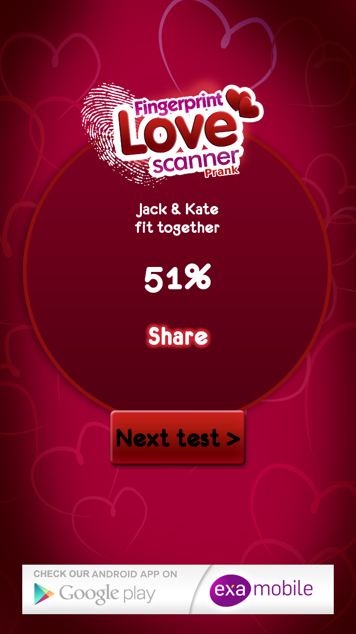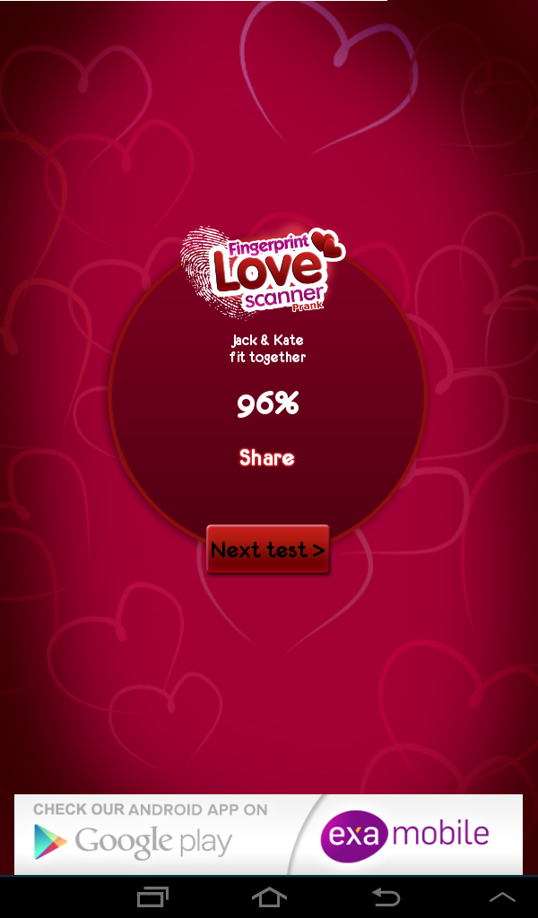 Dopo la scansione delle vostre impronte, riceverete un punteggio percentuale che potete condividere con i tuoi amici via email o Facebook. Il punteggio più alto è il 100% - se riuscite ad ottenere punteggio cosi alto, questo significa che avete superato il test di amore e che siete una coppia perfetta!