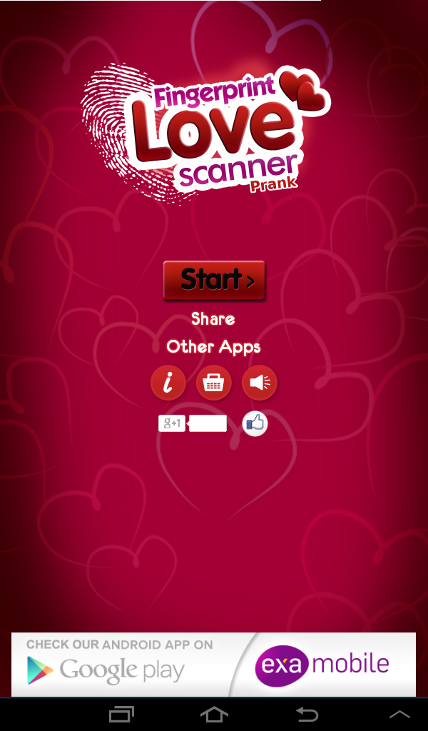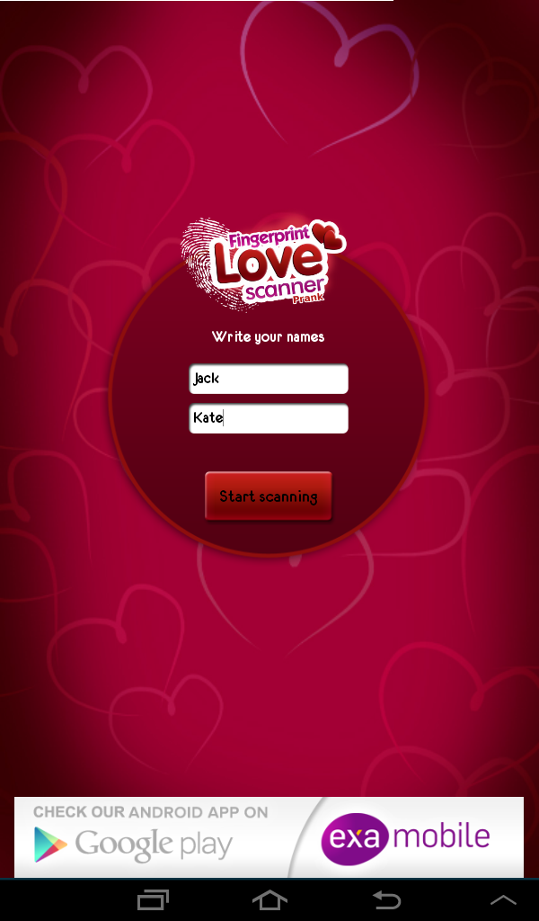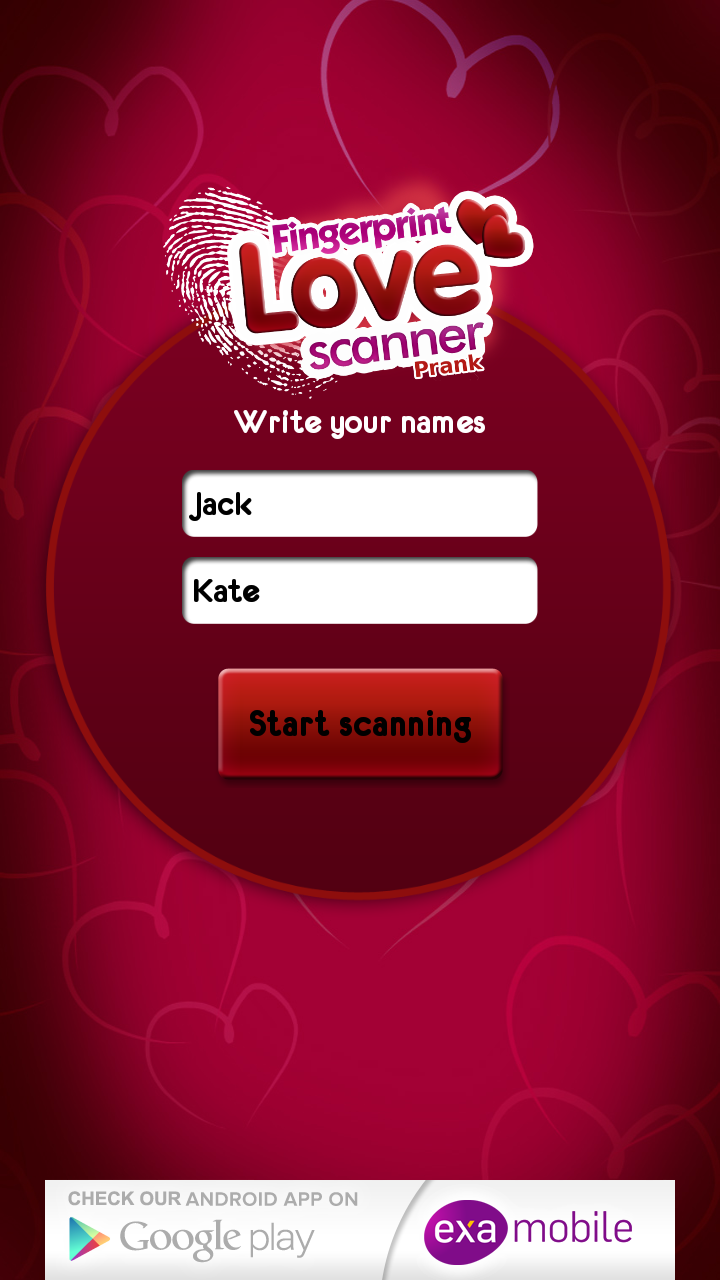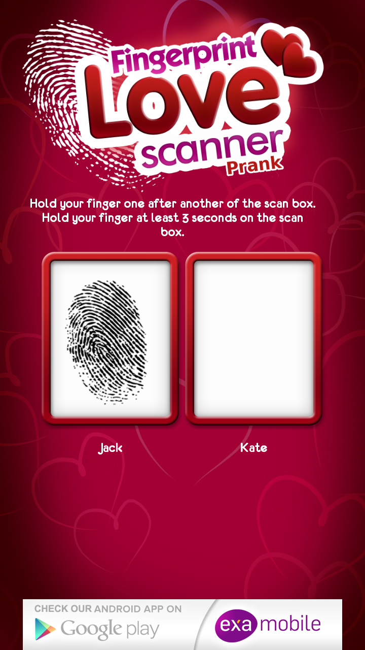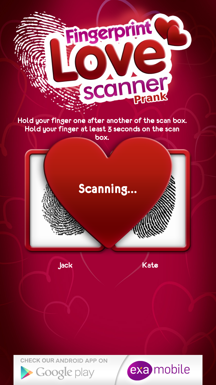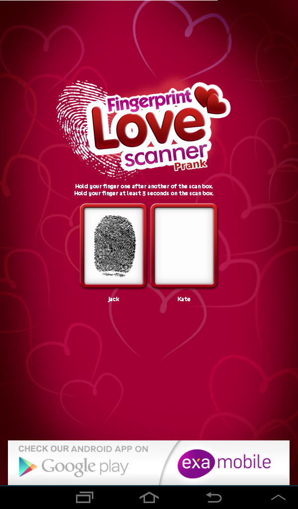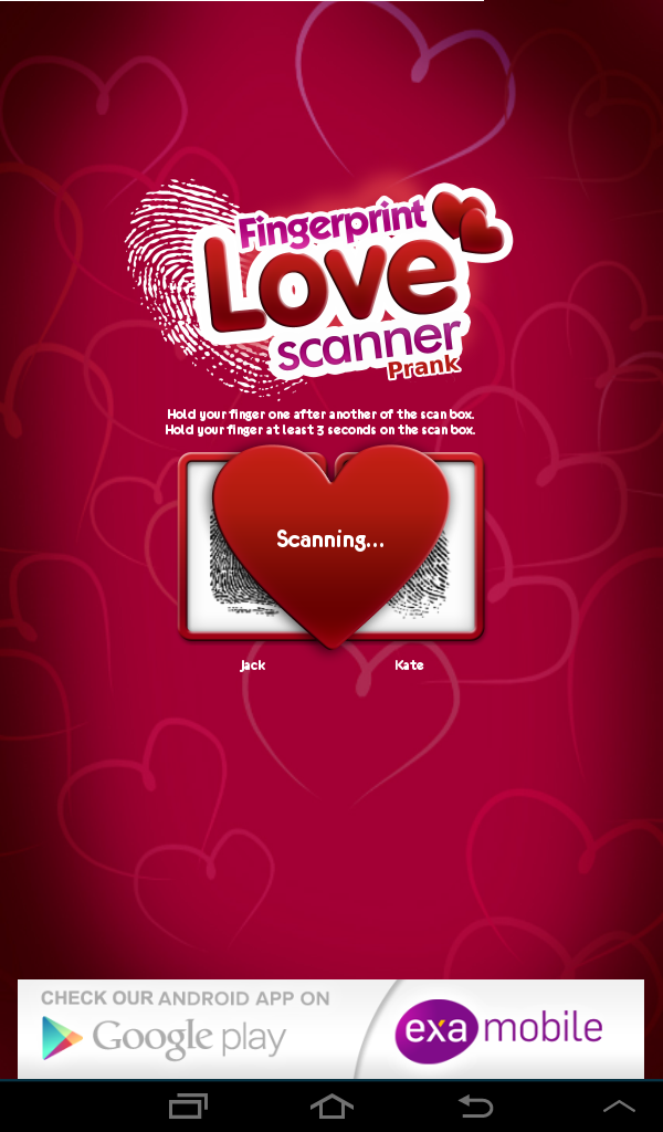 Fingerprint love scanner - un test di coppia. Con questa l'applicazione potete scannerizzare le impronte digitali per verificare l'affinità di coppia con il vostro partner. Basta toccare lo scanner con il dito, tenere premuto per circa 3 secondi per scoprire se siete fatti l'uno per l'altro!