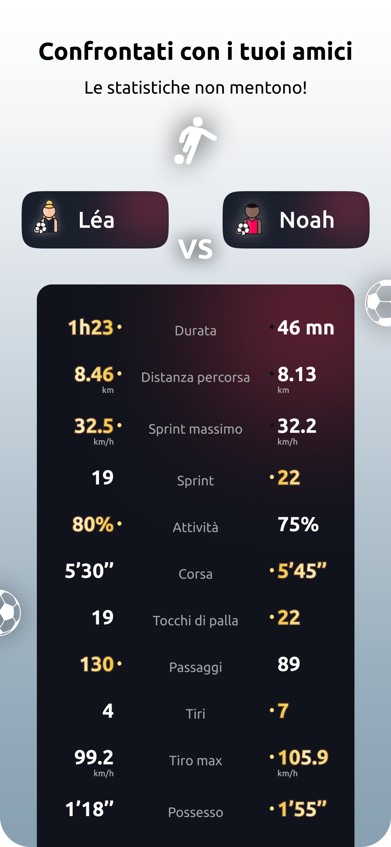 Ottenete le vostre statistiche dopo ogni sessione di calcio, confrontatevi con i giocatori professionisti e i vostri compagni di squadra.