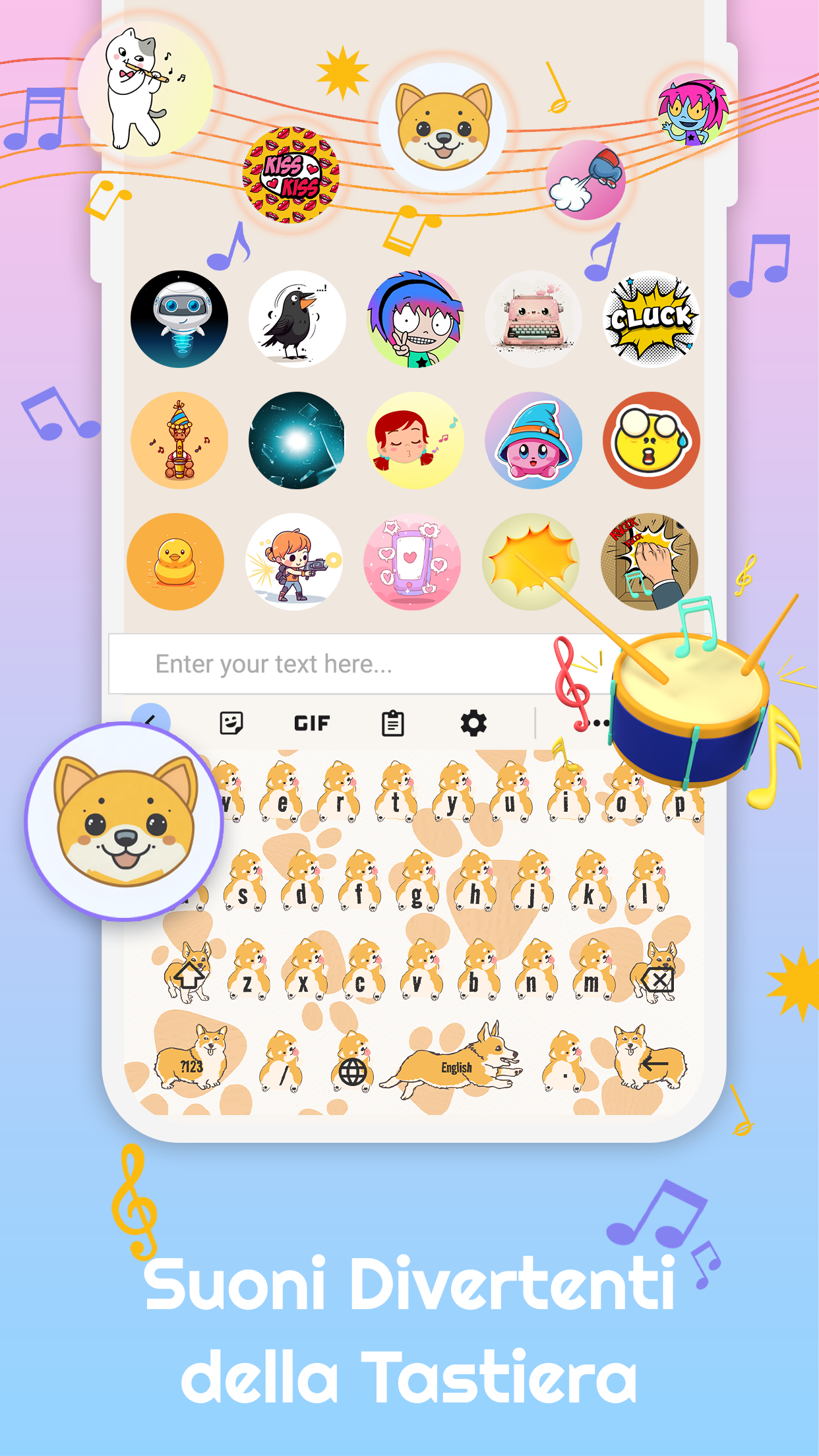- Tastiera fai-da-te come personalizzare i pulsanti della tastiera, i colori, i caratteri, gli effetti di tocco, i suoni di tocco (pianoforte 🎹, chitarra 🎸, cane che abbaia 🐶) per decorare la tua tastiera emoji.