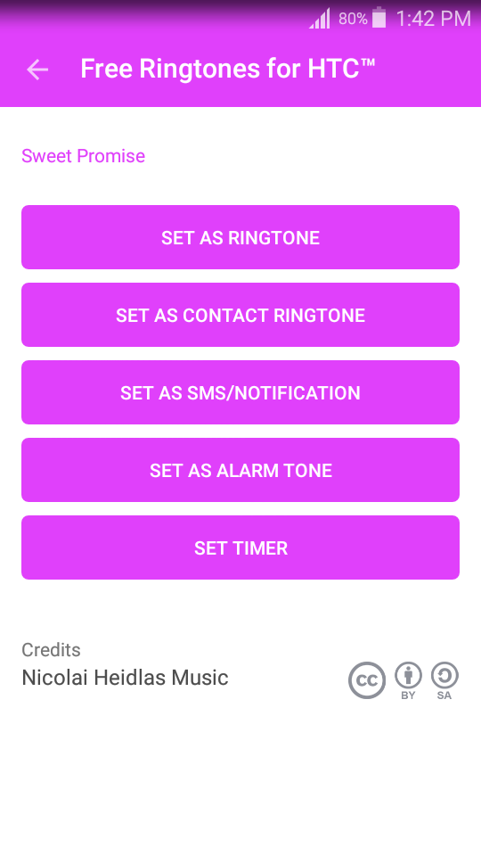 LEGAL INFO AND LICENSESounds and tones used in Free Ringtones for HTC™ are under Creative Commons license (CC0 1.0, CC Attribution 2.0, CC BY 2.5, CC BY 3.0, CC BY-SA 3.0, CC Attribution 3.0, Attribution 4.0 International, Public Domain), credited in the app, where appropriate. For any questions or concerns regarding license, please contact us at