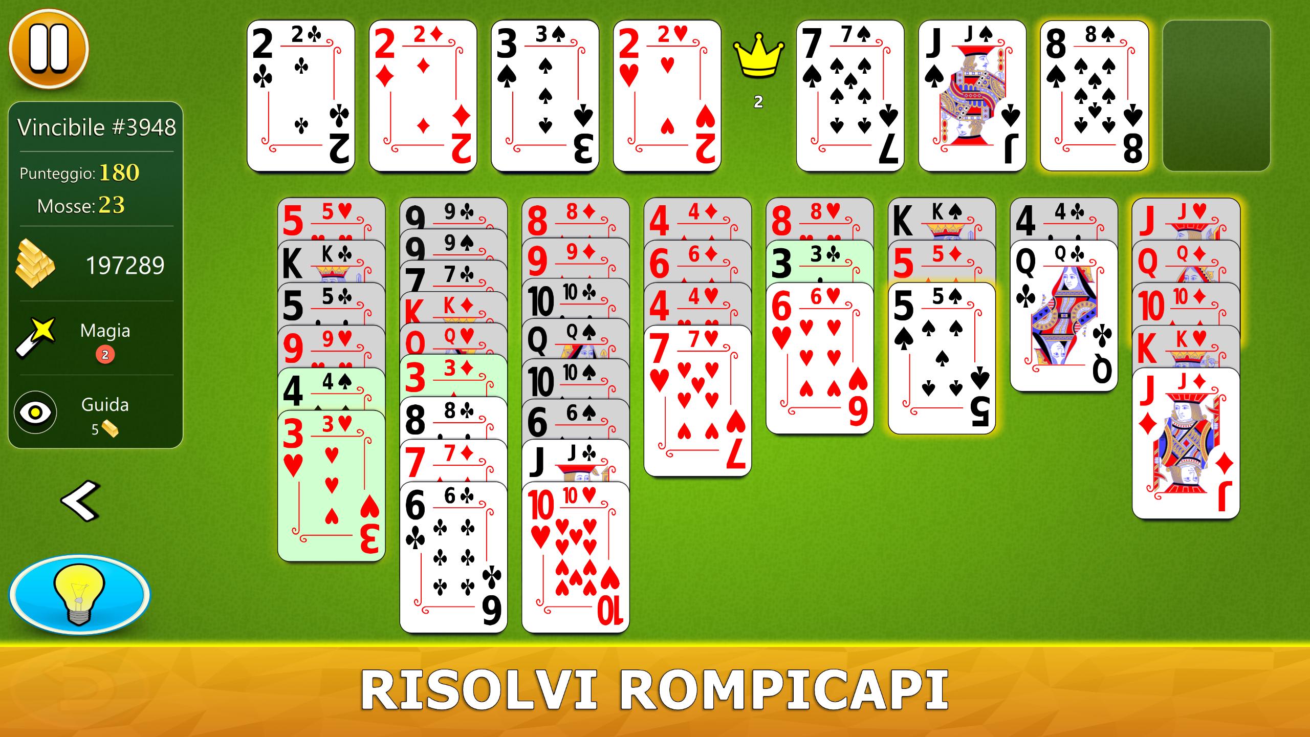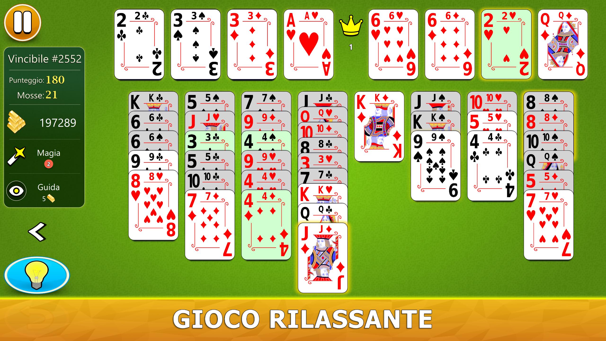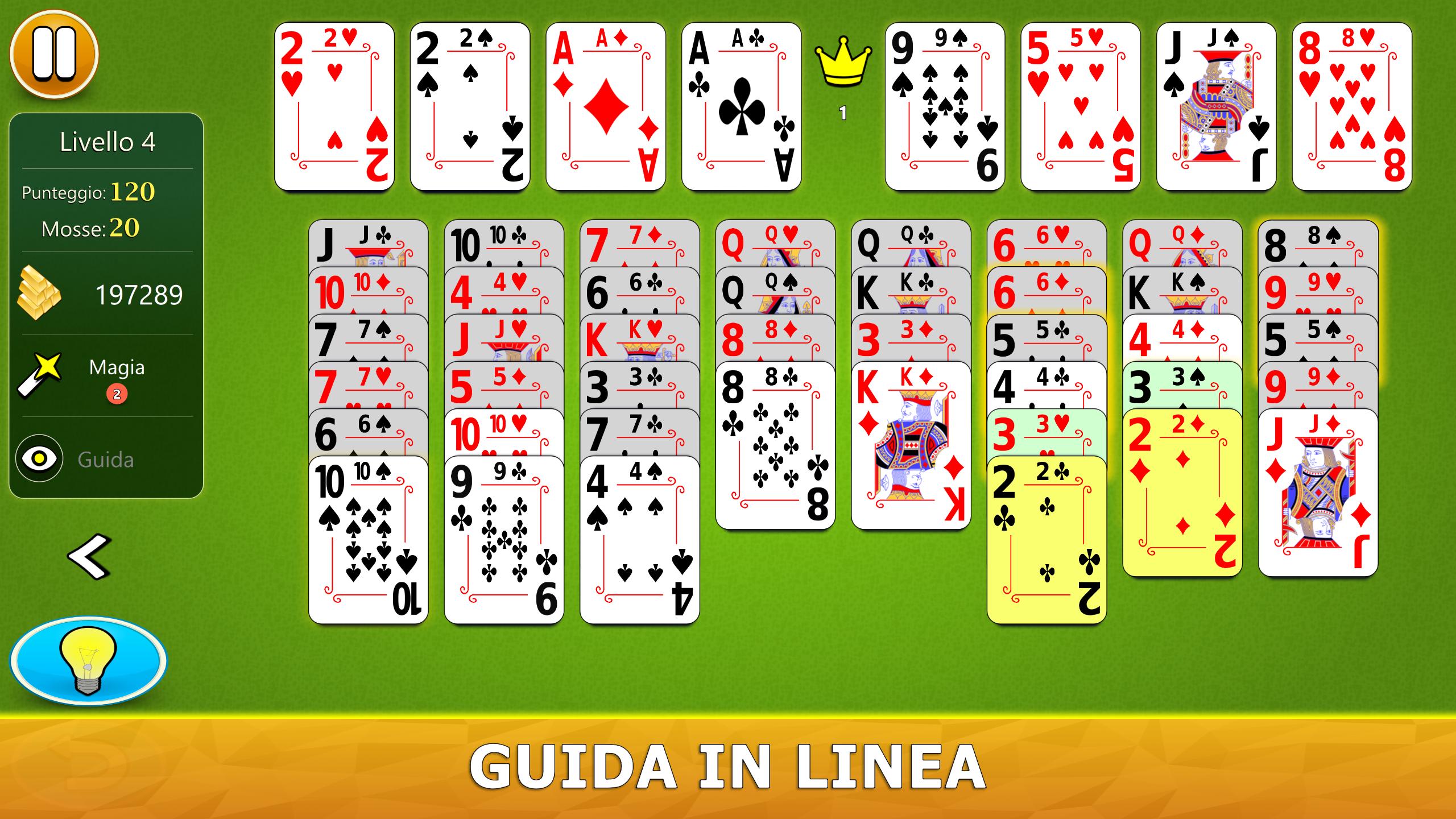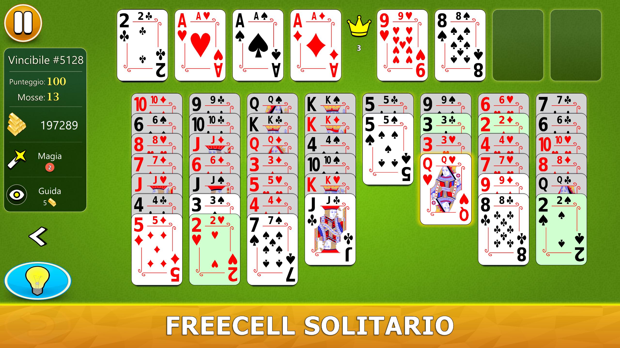 Il gioco ha un sistema di aiuto visivo intelligente. Ti darà suggerimenti utili in modo intuitivo. Se non hai mai giocato a FreeCell Solitaire prima, il nostro sistema di aiuto ti consiglierà, passo dopo passo, le mosse migliori da fare.