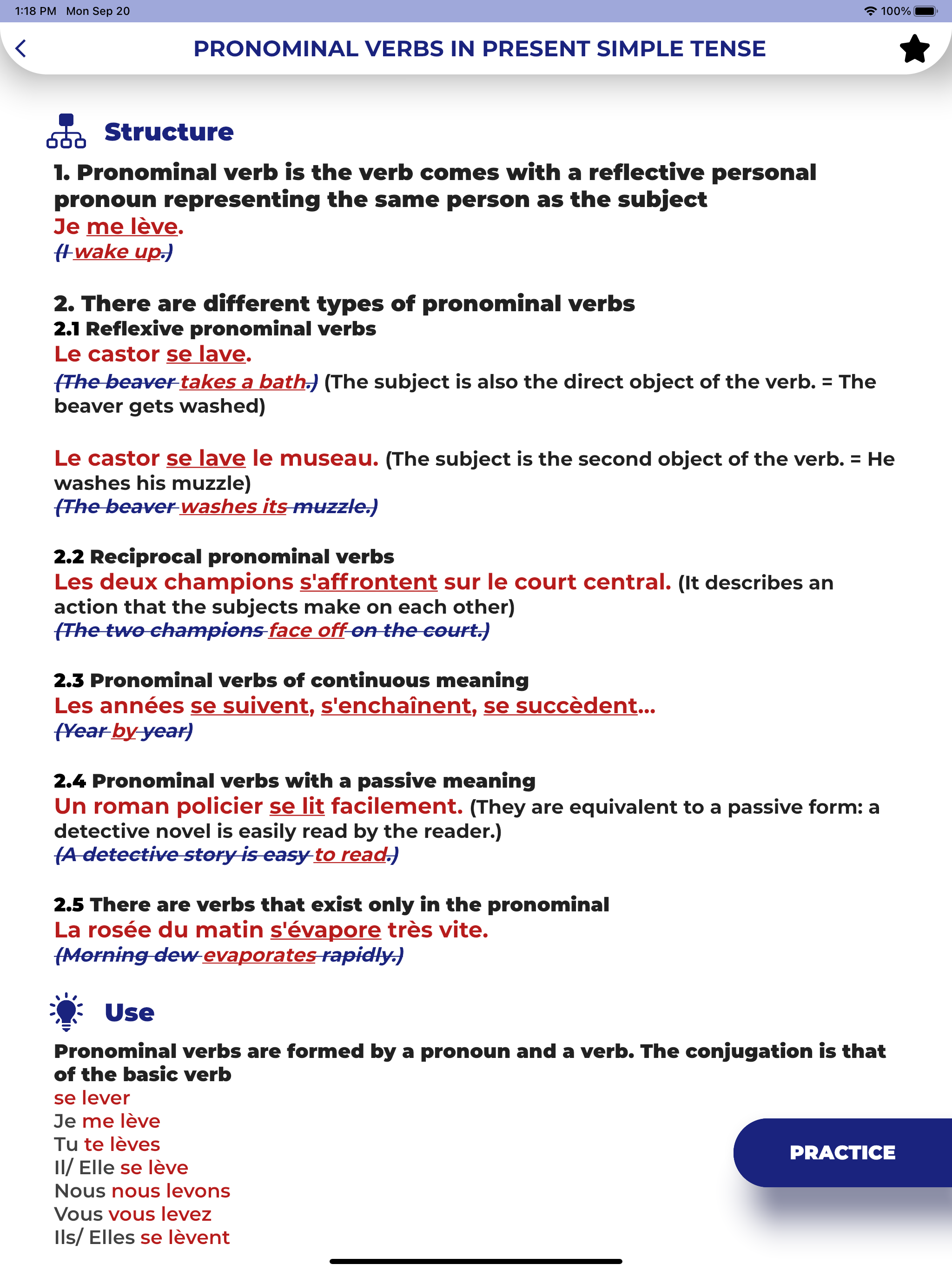 Questa app di grammatica francese comprende tutti i 163 temi grammaticali, con spiegazioni approfondite, esempi pratici e numerosi esami per aiutarLa a praticare la grammatica francese. Una caratteristica particolare di cui siamo orgogliosi è fornire molti suggerimenti per aiutarLa a riconoscere i temi grammaticali e a distinguere tra grammatiche simili e imparare il modo di usarle nelle situazioni pratica.