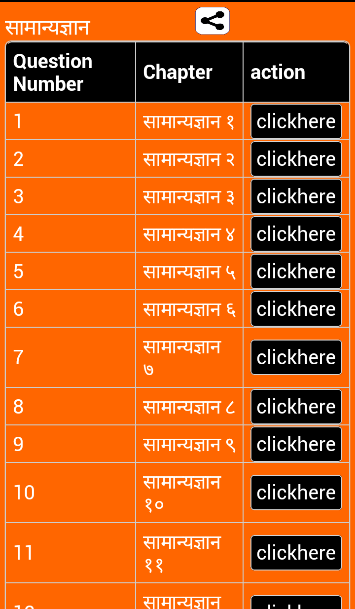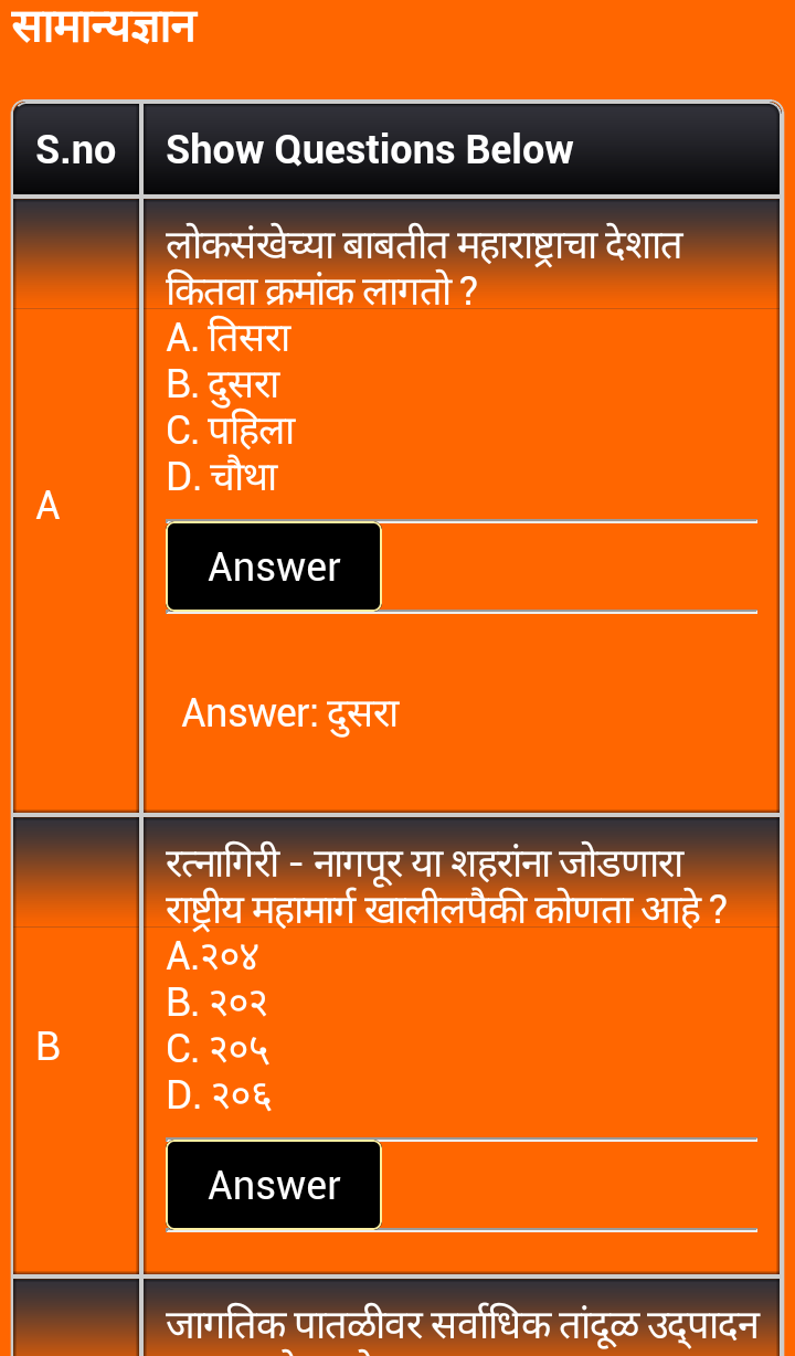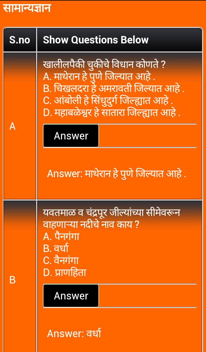 There are question answers, based on general knowledge and current affairs. These questions are in marathi language. These questions are on culture, politics, science, sports, history, systems in india etc. Question are in multiple choice format; Every question has its answer in hidden mode. users can see the answers after clicking on "answer" button.
