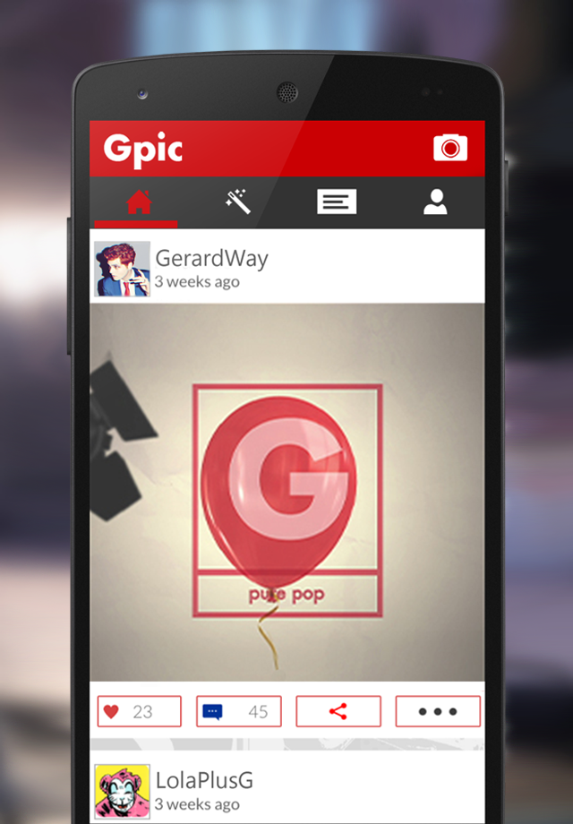 The first mobile app from Gerard Way. Get access to the world of Gerard Way and his traveling companion Lola Stay up to date with Gerard's latest clips, pictures and news. Create, customise and share your own G logo pictures and videos -Easily shoot beautiful multi-shot videos and Images -Customise your Content with filters, the G logo and your own text -Find, Follow and Interact with other Gerard Way Fans -Automatically follow Gerard's account for his latest posts in your feed -Instantly post your customized content to Twitter, Facebook and the Gpic website -Start your own Hashtag trends Check out amazing content from Gerard, Lola & Fans at: www.gerardwaygpic.com