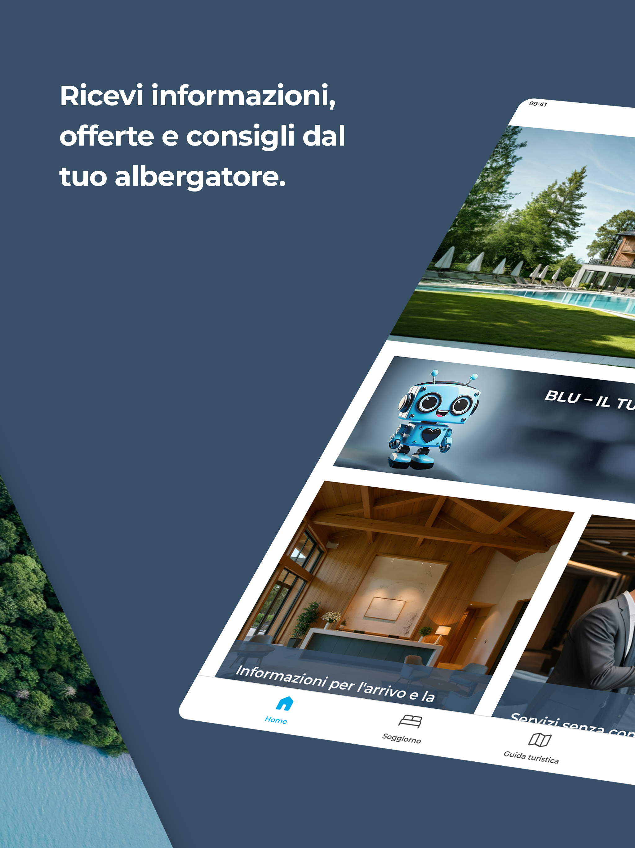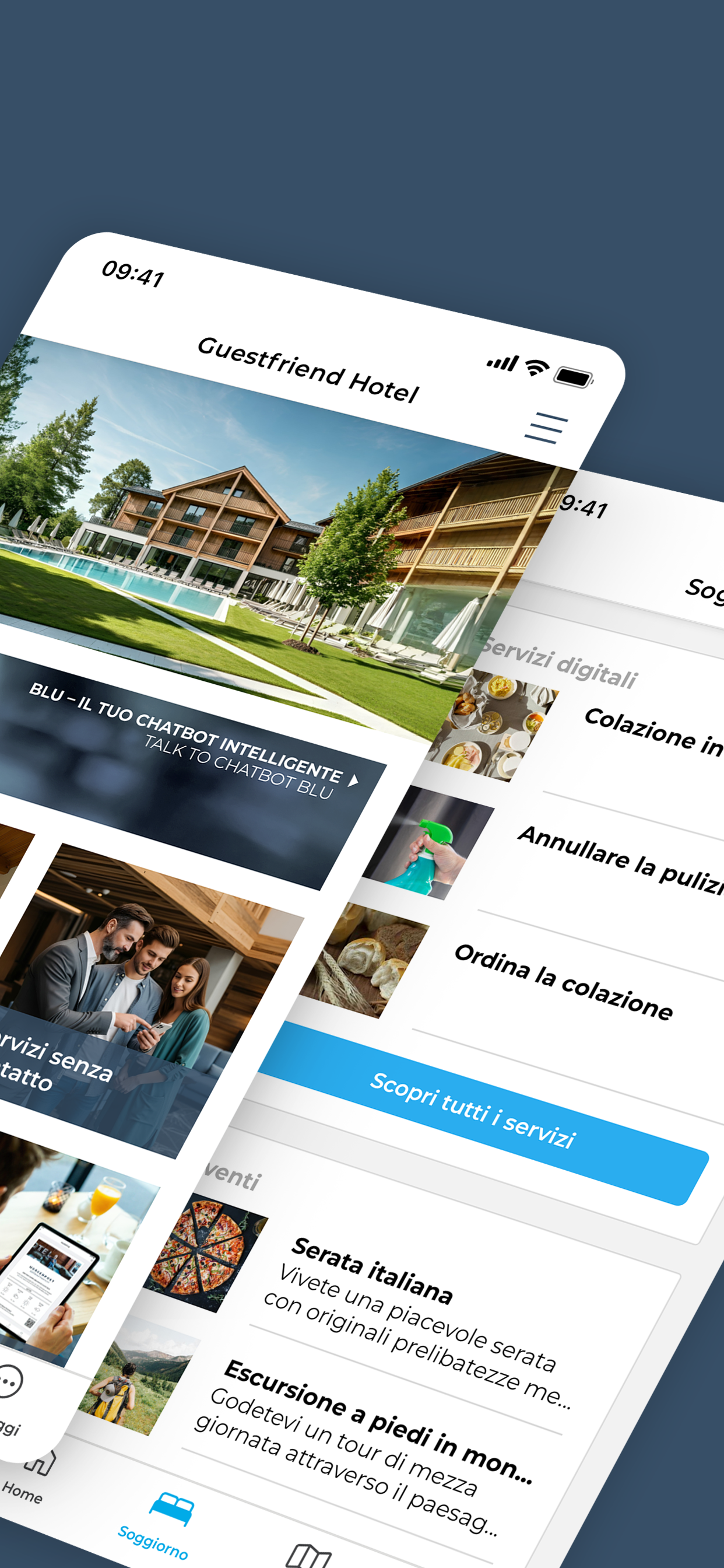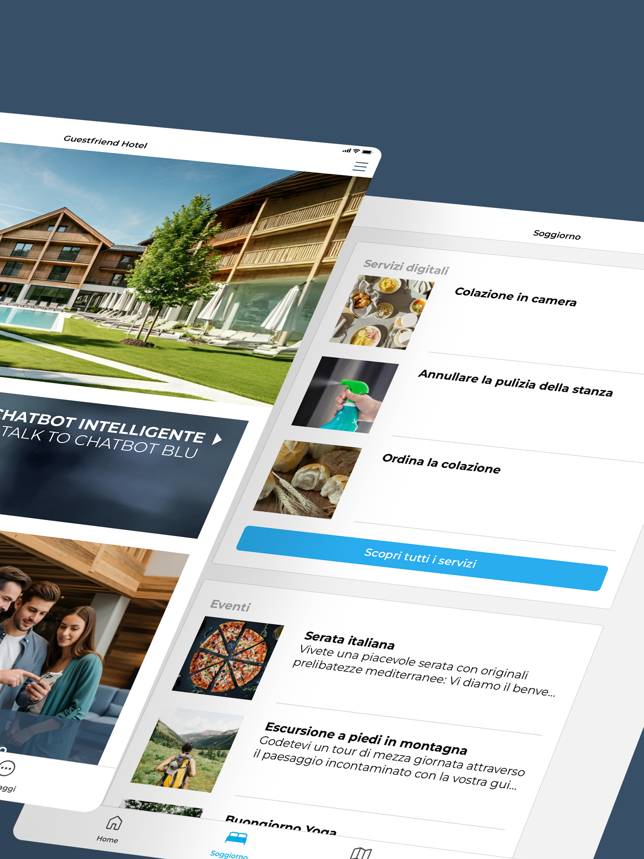 Nella Guida per gli ospiti digitale della tua struttura potrai trovare tutti i dettagli su arrivo e partenza, informazioni dalla A-Z per gli ospiti, i dati per accedere al Wi-Fi, i menù, utili consigli e molto altro ancora. Prenota direttamente tramite il tuo smartphone o tablet le offerte e i servizi proposti presso la tua struttura, come i trattamenti benessere, il servizio panini, il servizio in camera o il noleggio di biciclette.