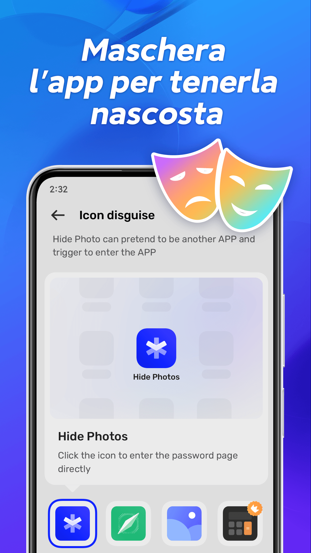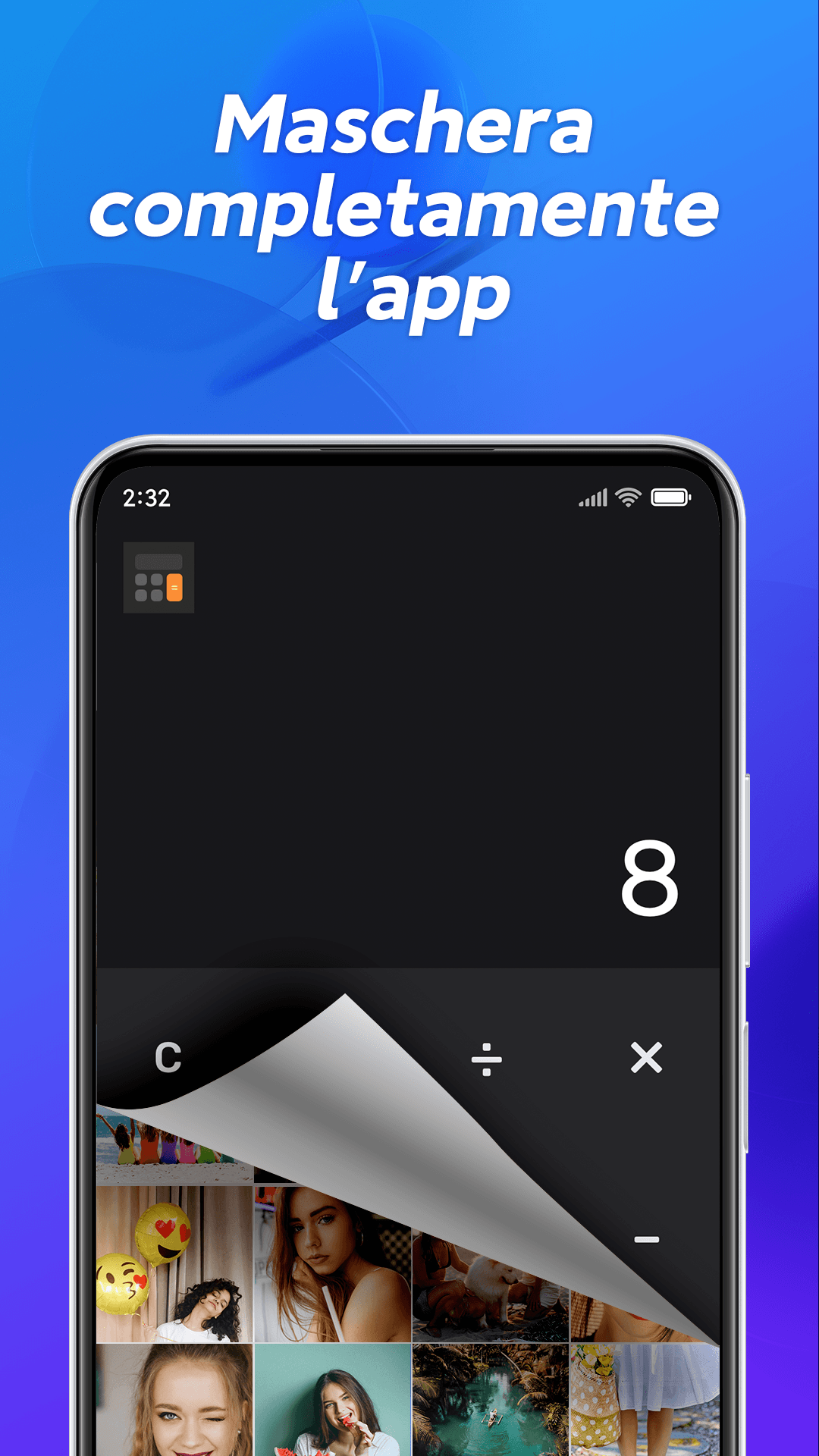 2. Maschera l'icona dell'appSe non vuoi che altre persone vedano "Nascondi foto", puoi modificare l'icona dell'app nelle Impostazioni. Nella schermata Home, verrà visualizzata come un'app Calcolatrice: solo tu saprai che è un archivio fotografico segreto.