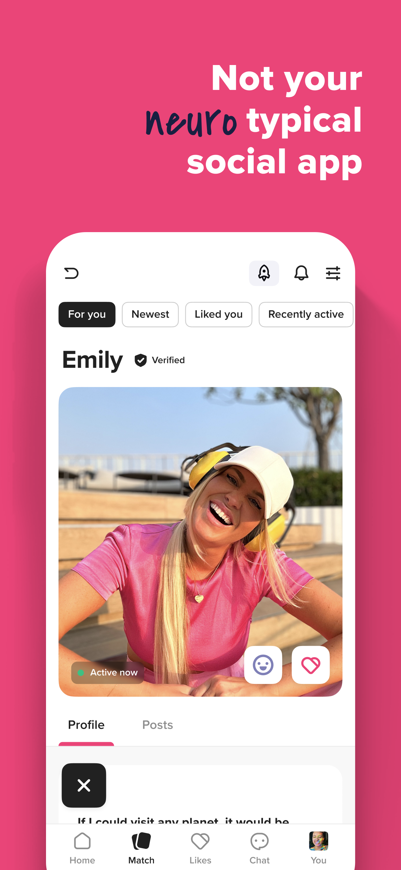 Qualunque sia il modo in cui scegli di identificarti, adoriamo vederlo. Autistico, ADHD, AuDHD, sindrome di Tourette, dislessia, qualsiasi altra neurodivergenza, LGBTQIA+, genere non conforme o non binario: tutti sono i benvenuti su Hiki. Il filtraggio discriminatorio non trova posto in Hiki. La nostra app è progettata su misura per aiutarti a trovare potenziali corrispondenze in base alle tue preferenze, interessi speciali e personalità.