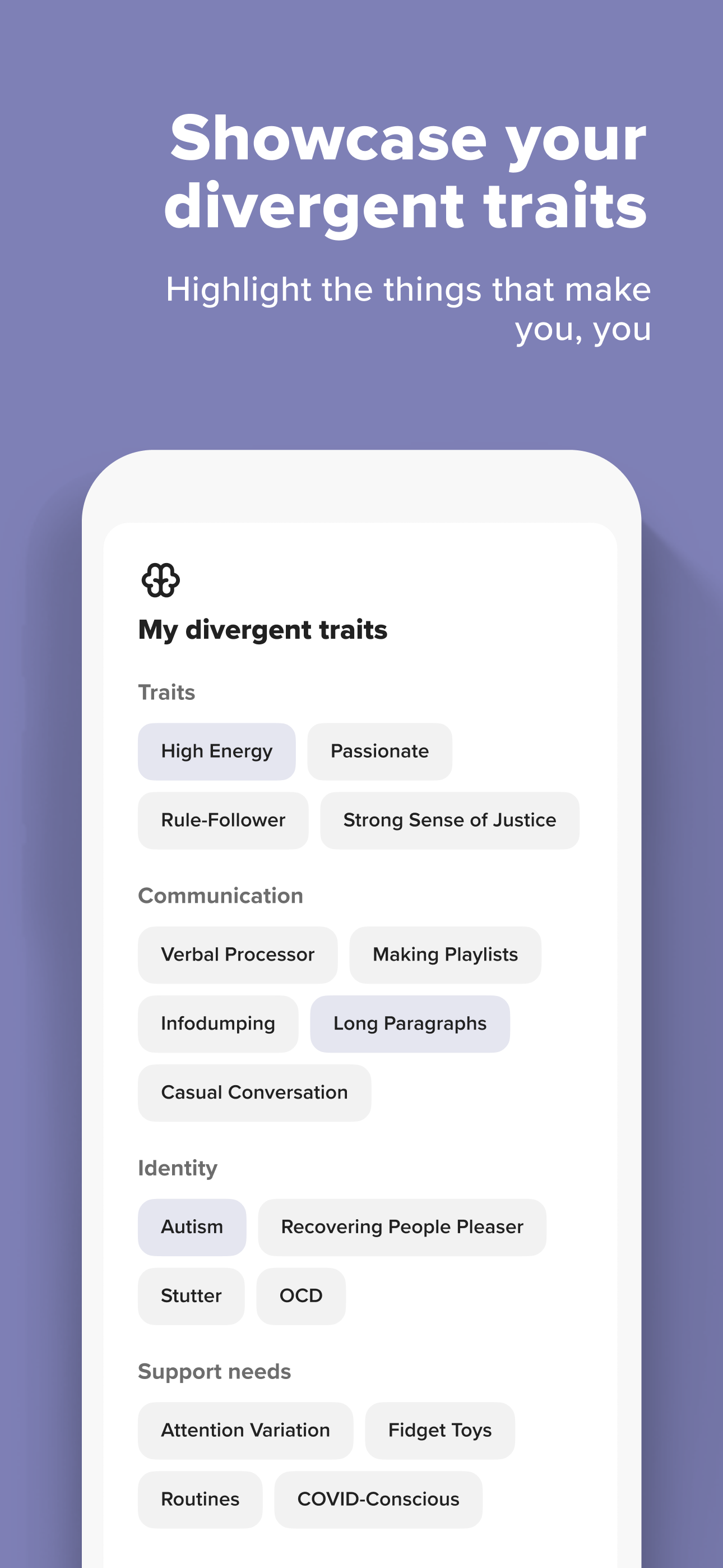 • Profili che ti consentono di definire i tuoi tratti neurodivergenti, i bisogni di supporto, le preferenze di comunicazione