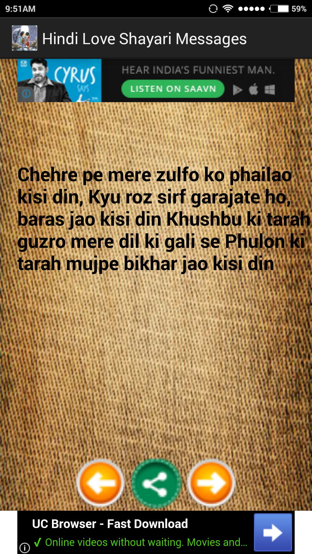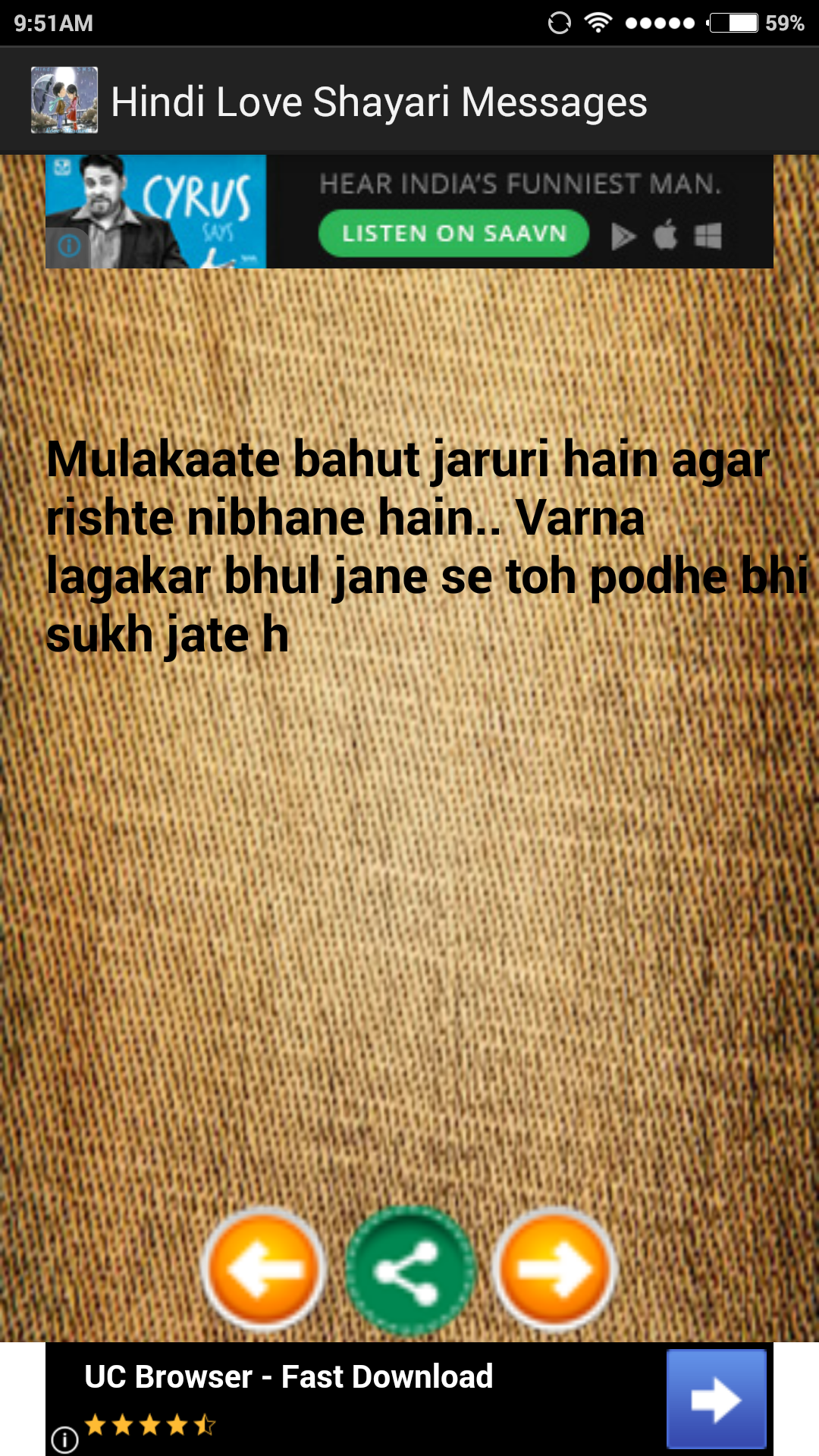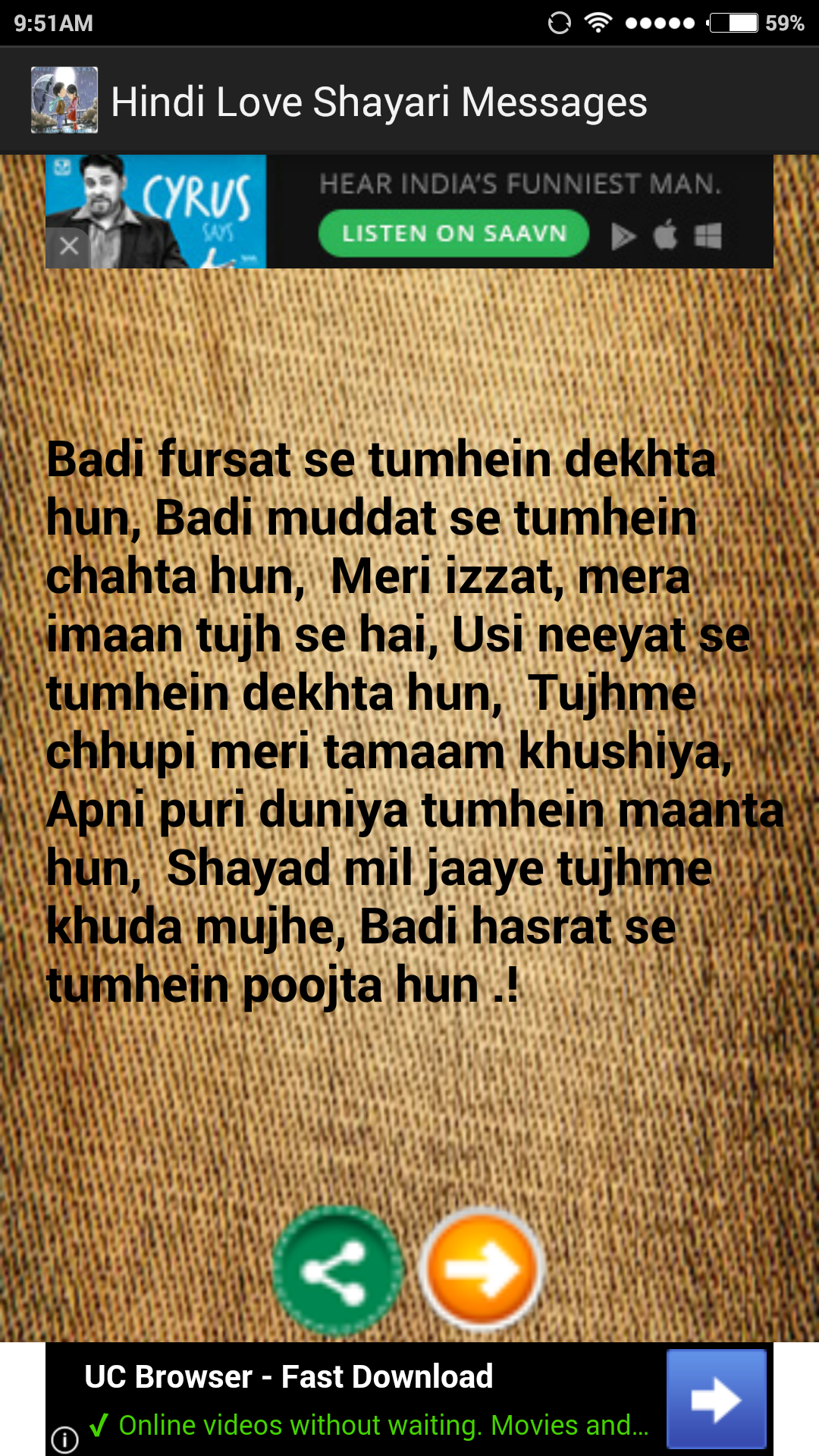 Hindi Love Shayari Messages Welcome to All new Hindi Love Shayari Andriod App ! Ultimate New & FREE online collection of Sher O Shayari across various categories. Under this app you can find well categorized collection of Shayari SMS and messages which you can share with your friends.Shayari lets you explain sentiments in all their forms through rhythmic words. Shayari is used to convey the sentiment of love. Beautifully written and narrated Shers makes it easy for a lover to pour his or her heart in front of the lover.Shayari collection categorized like Love Shayari-Quotes-Status-Sms-Messages,Bewafa shayari, or Patriotic shayari,Sed Shayari etc.. If you have been thinking of expressing your love and feelings in a different way, then Love Shayari is one of the most unique ways of effectively expressing yourself. It gives you the inner strength to express yourself whole heartedly. Shayari can say anything and everything in a beautiful way of its own. It makes it easier to express your love. There is a broad category of shayaris which ranges from love shayaris to broken heart to humorous shayaris. It is just words, words and words that fills your emotion into it and lets you to dedicate your love and affection. If you are in love then get ready to relive the nostalgia with Love Shayaris. Install the Love shayari widget to discover the most beautiful love shayaris that will fill your life with romance and give expression to the feelings in your heart. Make your sweetheart’s day special by setting the mood – read, recite and share love shayaris. Carry this romantic collection of verses in your mobile and send a beautiful love shayari whenever, wherever. Make your emotions sound even more special with our words and fill your life with the magic of love. Features: - Easy to copy and send or share it on WhatsApp,facebook, twitter etc. - Email or SMS share shayari to your friend. - You can share the App Link to your Friend & Family Members. - If you give any Suggestion so you can click on feedback. - User interactive and simple design Love Shayari , WhatsApp Status line, Pyar Bhari Shayari , GF BF Shayari, Flirting Shayari, Sad Shayari, Love Quotes, Pyari Shayari , Lovely Shayari , Best Shayari , Romance Shayari Missing you Shayari Dil Shayari The app is free, and supported by ads.