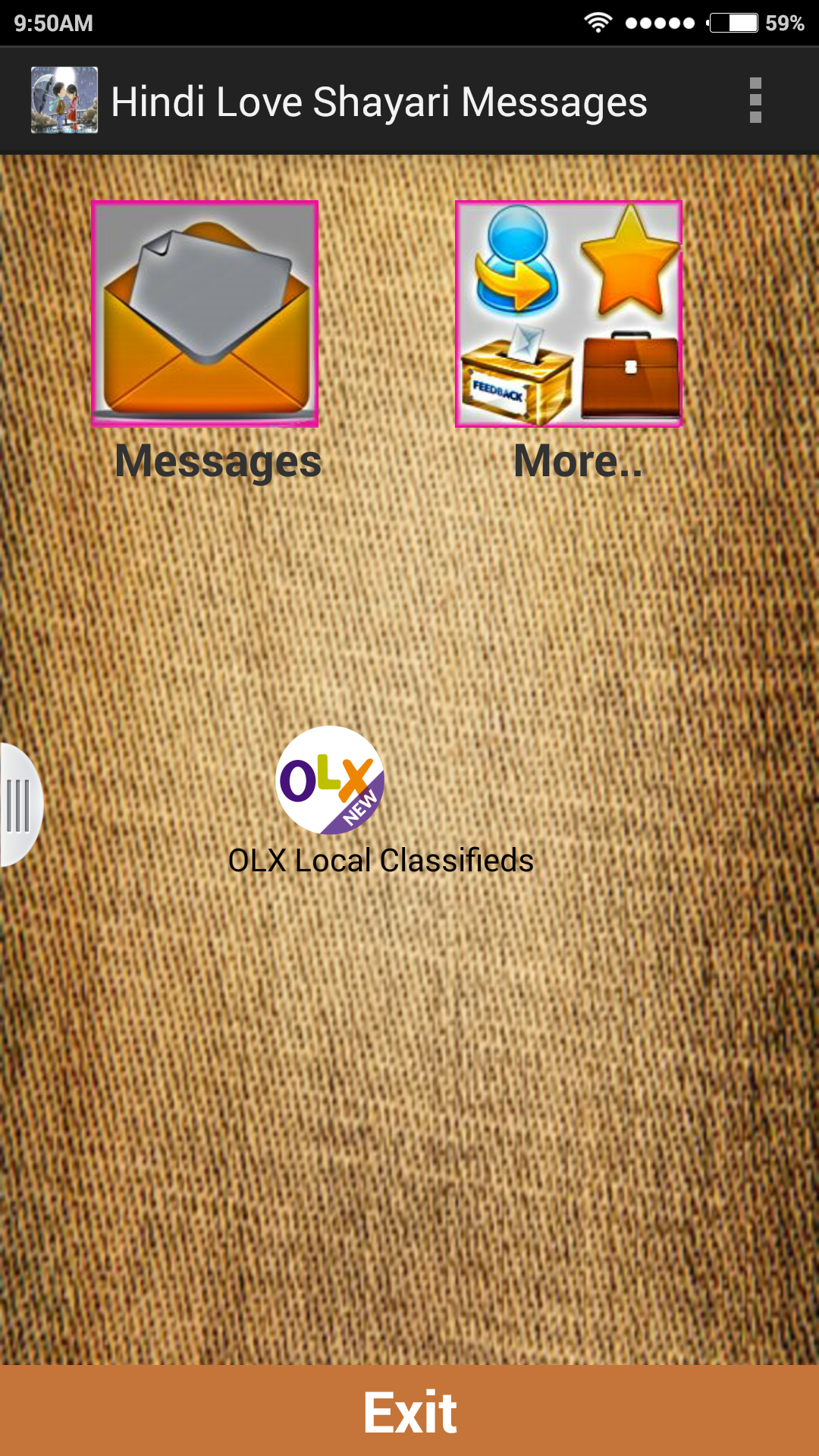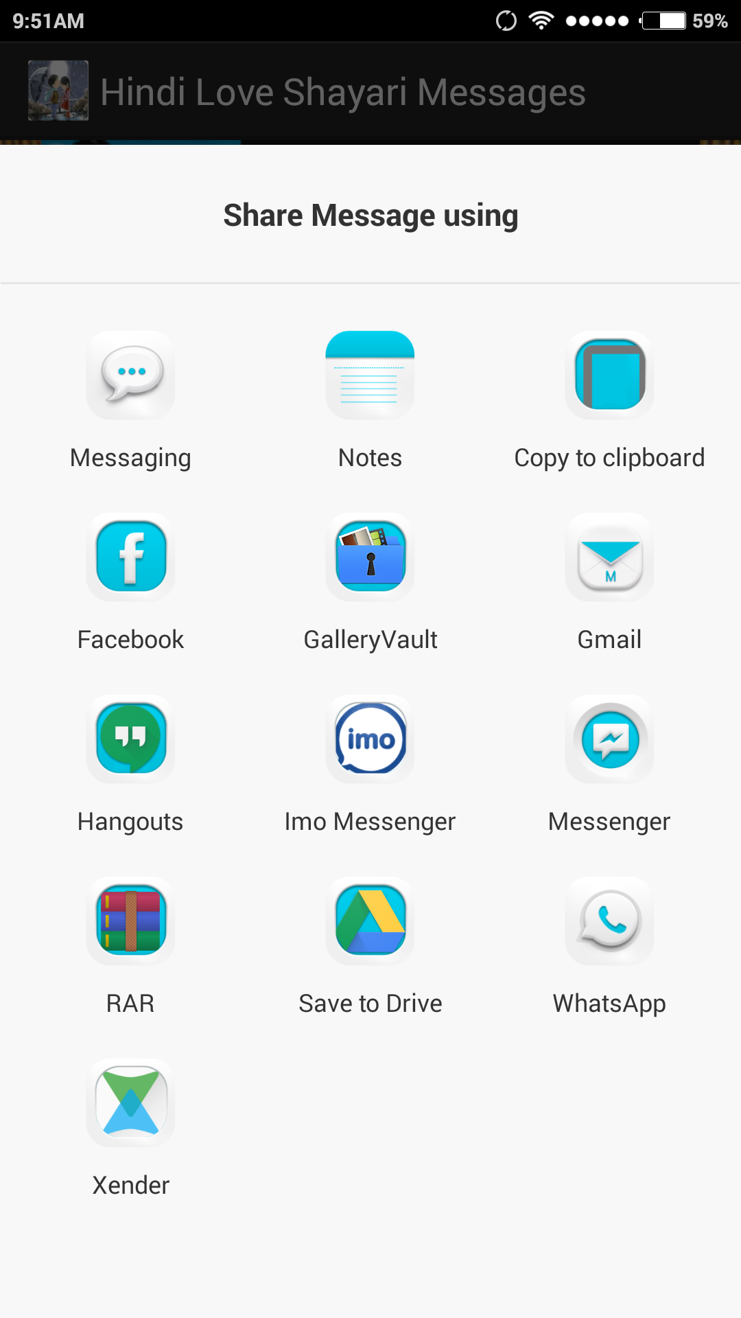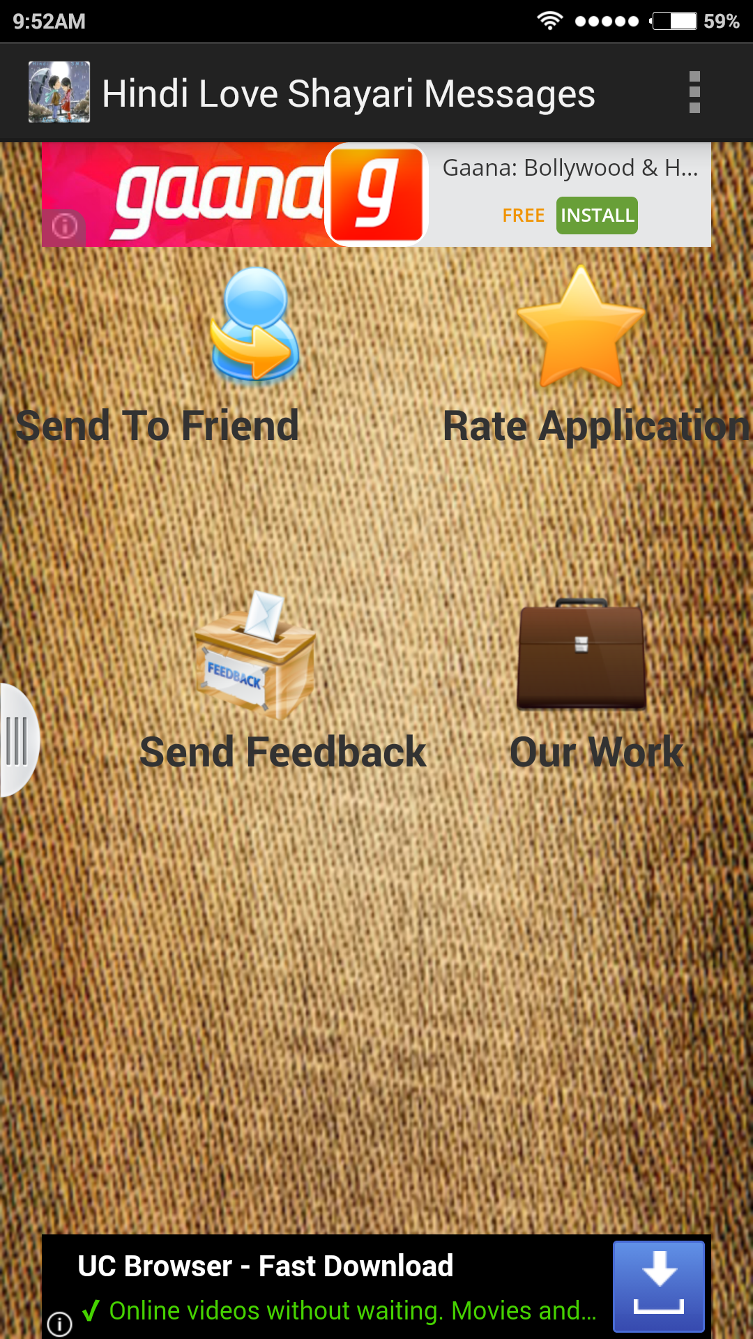 Hindi Love Shayari Messages Welcome to All new Hindi Love Shayari Andriod App ! Ultimate New & FREE online collection of Sher O Shayari across various categories. Under this app you can find well categorized collection of Shayari SMS and messages which you can share with your friends.Shayari lets you explain sentiments in all their forms through rhythmic words. Shayari is used to convey the sentiment of love. Beautifully written and narrated Shers makes it easy for a lover to pour his or her heart in front of the lover.Shayari collection categorized like Love Shayari-Quotes-Status-Sms-Messages,Bewafa shayari, or Patriotic shayari,Sed Shayari etc.. If you have been thinking of expressing your love and feelings in a different way, then Love Shayari is one of the most unique ways of effectively expressing yourself. It gives you the inner strength to express yourself whole heartedly. Shayari can say anything and everything in a beautiful way of its own. It makes it easier to express your love. There is a broad category of shayaris which ranges from love shayaris to broken heart to humorous shayaris. It is just words, words and words that fills your emotion into it and lets you to dedicate your love and affection. If you are in love then get ready to relive the nostalgia with Love Shayaris. Install the Love shayari widget to discover the most beautiful love shayaris that will fill your life with romance and give expression to the feelings in your heart. Make your sweetheart’s day special by setting the mood – read, recite and share love shayaris. Carry this romantic collection of verses in your mobile and send a beautiful love shayari whenever, wherever. Make your emotions sound even more special with our words and fill your life with the magic of love. Features: - Easy to copy and send or share it on WhatsApp,facebook, twitter etc. - Email or SMS share shayari to your friend. - You can share the App Link to your Friend & Family Members. - If you give any Suggestion so you can click on feedback. - User interactive and simple design Love Shayari , WhatsApp Status line, Pyar Bhari Shayari , GF BF Shayari, Flirting Shayari, Sad Shayari, Love Quotes, Pyari Shayari , Lovely Shayari , Best Shayari , Romance Shayari Missing you Shayari Dil Shayari The app is free, and supported by ads.