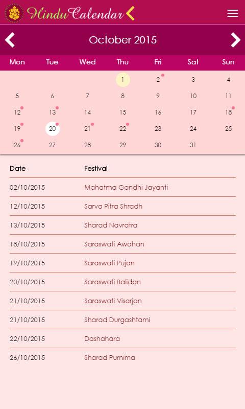 Now Hindu Calendar in your Language. Hindu Calendar is available in English, Hindi, Gujarati, Punjabi, Bengali and Oriya. And get the list of monthly/yearly Festivals, Muhurats, Purnima, Amavasya and Panchang details in an easy to understand way. The other features include getting notifications for daily festivals/panchang and any type of festival detail that you feel like sharing can also be shared. Bugs Fixed.