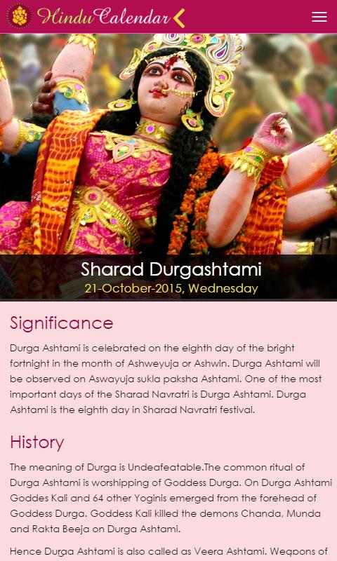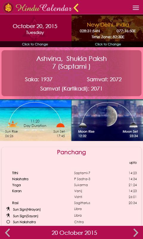 Un calendario è un sistema di organizzazione di giornate per scopi sociali, religiose, commerciali o amministrativi. Un calendario è anche un record fisica di un tale sistema. Un calendario può anche significare un elenco di eventi fissi o previste, come ad esempio un calendario Festival, Vrat Calendario e un calendario Muhurat. Il calendario indù serve con precisione e perfettamente questo scopo, come base di tutti questi calcoli è la matematica accurate della Panchang Futuro incorporati in questo calendario. Le caratteristiche notevoli di calendario indù sono i seguenti- • Dà mese l'elenco saggio di tutti i festival, Vrat e Muhurats con Quotidiano Panchang. • Nella sezione del festival non solo le date precise del festival piuttosto il significato, la storia e il metodo di celebrazione di ogni festa è stata anche descritta. • Oltre a quella delle prossime sezioni del festival dà la lista delle prossime feste modo che l'utente degli aggiornamenti delle applicazioni e si prepara di conseguenza. • Allo stesso modo nella sezione veloce (Vrat) sono state descritte l'elenco dei digiuni con importanza e metodo di osservazione digiuni. • Nella sezione Muhurat l'utente può ottenere Muhrat per importanti attività di buon auspicio come il matrimonio, fidanzamento, affari affermando, acquisto di veicolo, posa prima pietra, casa cerimonia di riscaldamento ecc • Nella sezione Panchang di The Hindu Calendario l'utente ottiene Panchang per qualsiasi giorno e in qualsiasi luogo con una precisione di secondo per 200 anni vale a dire 1900-2100. • Il Panchang si riferisce ai cinque membra del calendario: Tithi, Nakshatra, Yoga, Karana & Rasi. • Questa Panchangam comprende anche dettagli su Rahu Kaal, Panchak, Bhadra, Gandmool, Yamaghantak Kaal, Gulika Kaal, Hora, Chaugharia, Shubhashubh Yoga come Amrit Yog ecc e altre informazioni tra cui Paksha, Ritu, Gola e Ayan ecc • Il Panchangam presentata in questa applicazione contiene informazioni sufficienti per persone che seguono diversi Panchangam e sono disponibili per diversi luoghi del mondo. • In poche parole il Panchang segue unità tradizionali di cronometraggio indiano e presenta le date importanti e le loro calcoli in forma di tabella, poi utilizzato nel calcolo Muhurat.