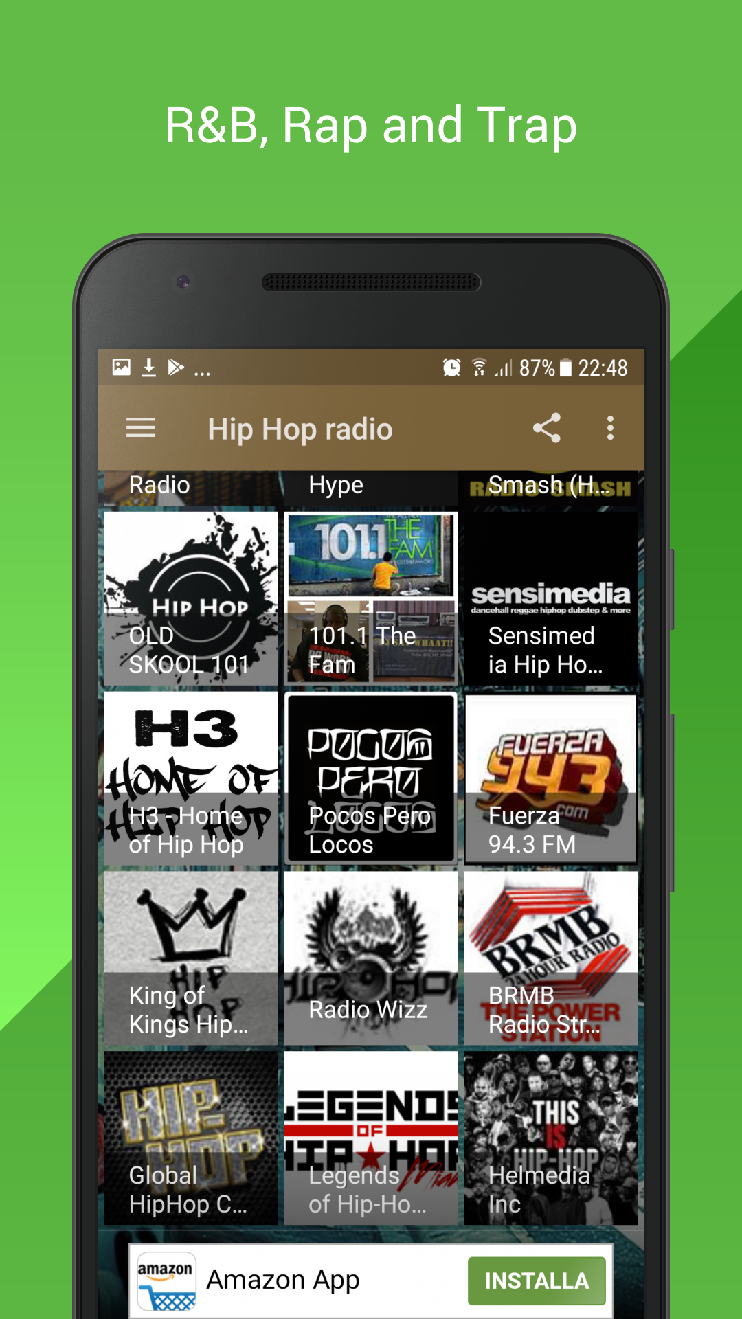 Musica Hip Hop, Rap, R&b, Old school, TRAP un app dedicate a tutti gli amanti del genere. Potrai sentire le migliori e le più seguite stazioni radio web dedicate alla musica Hip Hop direttamente sul tuo smartphone ogni volta che vuoi e in qualsiasi posto ti trovi! quando vai a correre, quando cucini, quando lavori, quando giochi al pc ecc.. HIP HOP RADIO 24 ti accompagna durante la giornata con la musica che ami. Le stazioni radio streaming Hip Hop , Rap, Old school, R&b , TRAP che potrai sempre ascoltare 24/24 : - HOT 108 JAMZ - POWERHITZ.COM - #1 FOR HITZ & HIP HOP - One love Hip Hop Radio - 181.FM - Old School Hip Hop & RNB - Urban Hitz Radio - R&B and HIP HOP - Culture.FM TrueHipHop Int. 160k - A Better Old School Classic Rap Station - CLASSIC RAP - Beat FM - Hip-Hop Request - 1.FM Jamz - HipHop / RnB radio stations - DEFJAY.COM - 100% R&B! (USAEurope) - BlackBeats.FM - finest in blackbeats - Dirty South Radio Online Thug Zone Radio - 2000FM - rnb & hip hop - It's a Trap Radio - Dutch Trap & Hip hop - Traphood.fm - Trap Fm Se ami anche tu la musica Hip Hop non puoi non installare questa fantastica app!
