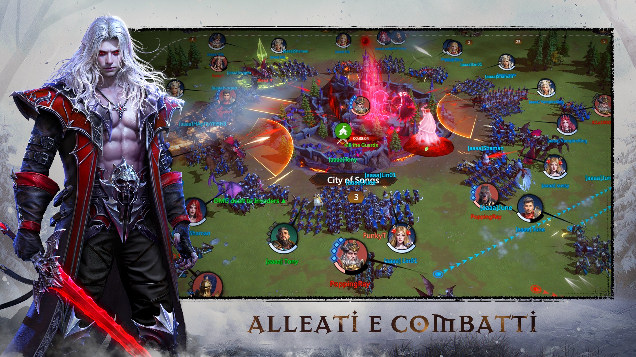 In una terra assediata dalle tenebre, vampiri, lupi mannari e cacciatori sono costantemente in lotta tra loro, e le invasioni di zombie e barbari minacciano la stabilità dell'impero. Solo i più forti riusciranno a sopravvivere! Potrai esplorare ed ereditare il castello di Dracula, assumere le sembianze di un vampiro, reclutare eroi, addestrare eserciti e conquistare città. Scala i ranghi della tua fazione, da membro comune a vassallo e infine a signore della fazione. Costruisci un grande impero con le tue gilde, intraprendi un magnifico viaggio e goditi vittorie senza fine! Caratteristiche del gioco: 1. Gestisci il castello - Vivi come un vero vampiro I giocatori esploreranno il castello di Dracula, impareranno i segreti dei vampiri e prenderanno a poco a poco il controllo del castello. Fai fronte alla tua sete di sangue, evita la luce del sole e diventa un vero conte! 2. Scegli tra diversi tipi di truppe - Usa la strategia per vincere Scegli tra truppe da mischia, a distanza o aeree, con un totale di 12 tipologie uniche. I lupi mannari, ad esempio, hanno talenti frenetici, mentre i vampiri hanno talenti rubavita: ogni creatura ha le sue caratteristiche. Le truppe da mischia forniscono la difesa primaria, la cavalleria fornisce mobilità, le truppe a distanza attaccano i nemici a distanza e le unità aeree sono eccellenti per tendere un'imboscata ai nemici. Il campo di battaglia tridimensionale crea scenari di combattimento realistici e mette alla prova le tue abilità di comando! 3. Forma la tua fazione - Costruisci il tuo impero I giocatori possono formare le proprie fazioni con le gilde, innalzare un paese e contribuire a plasmare il mondo del gioco. Puoi sopravvivere alla battaglia tra fazioni e scrivere il tuo nome nella storia se fai affidamento al tuo ingegno! 4. Scopri eroi misteriosi - Vivi nuove esperienze I giocatori possono ottenere misteriosi eroi vampiri e lupi mannari per accompagnarli nel loro viaggio alla ricerca di tesori magici. Cattura potenti mostri nel deserto, domali per attaccare le città o gestisci un maniero e crea regali per impressionare vari eroi.