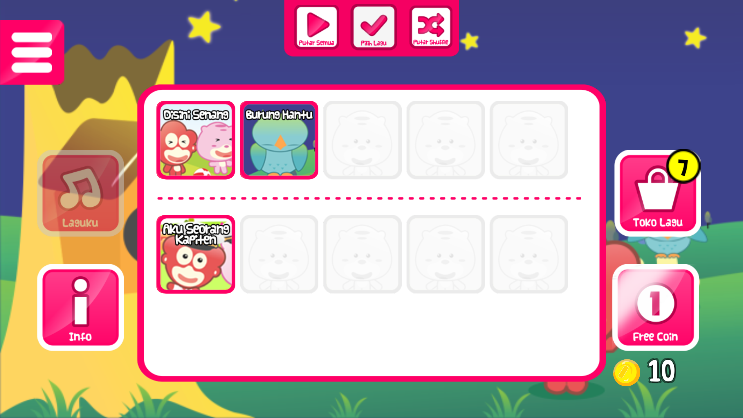 Diiringi aransemen musik pop progresif lagu anak Indonesia karya kak Dhion, kak Krisna, kak Lintang, disertai lirik lagu anak untuk memudahkan bernyanyi Lagu anak Indonesia, kami mewujudkan keceriaan anak anak masa kini lewat lagu anak populer ini. Dilengkapi fitur karaoke agar anak dapat bernyanyi bebas. Lagu anak Indonesia baru menjadi aplikasi lagu anak favorit orang tua dan anak anak Indonesia!