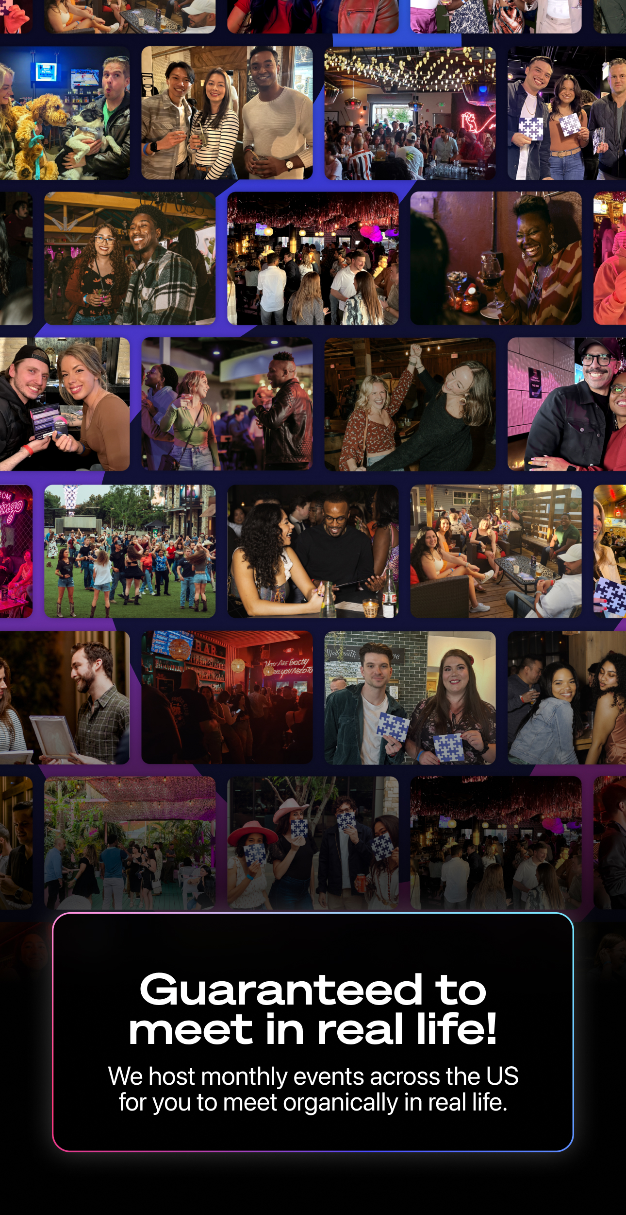 Offriamo la migliore esperienza di incontri online e offline organizzando ogni mese una varietà di eventi negli Stati Uniti e la nostra app è il compagno ideale per realizzarla. Ci espandiamo costantemente per aggiungere nuove città e diversi stili di eventi, dandoti la libertà di scegliere ciò che fa per te.