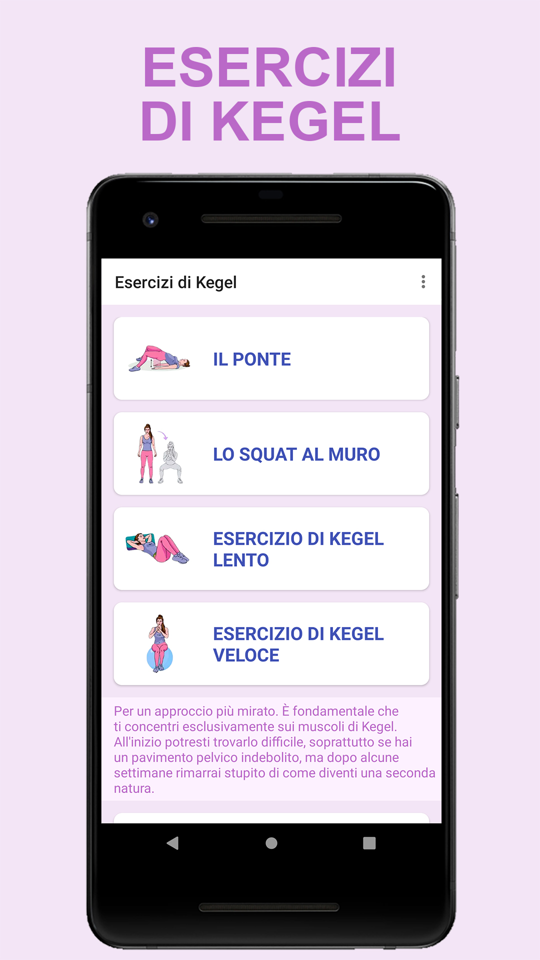 Gli esercizi di Kegel, di cui si sente spesso parlare, servono a rafforzare i muscoli del pavimento pelvico, cioè quelli che sostengono vescica, utero e retto. Eseguire con costanza e in maniera corretta questa ginnastica perineale consente di avere un pavimento pelvico tonico e di prevenire alcuni disturbi come: ✓ incontinenza urinaria da stress; ✓ perdite urinarie post parto; ✓ incontinenza da menopausa; ✓ disfunzione urinaria causata dal prolasso degli organi pelvici (situazione in cui i muscoli perineali perdono tono e risultano eccessivamente rilassati). Gli esercizi per rafforzare il pavimento pelvico, che prendono il nome dal loro ideatore, il ginecologo Arnold Kegel, consistono nel contrarre e rilassare i muscoli pubococcigei secondo determinate sequenze. Le prime volte sarebbe meglio eseguire la ginnastica di Kegel con l'aiuto di uno specialista, per individuare i muscoli da allenare e apprendere come eseguire correttamente i movimenti. In seguito, gli esercizi possono essere fatti tranquillamente anche a casa in qualsiasi momento della giornata: l'importante è essere costanti nel praticarli, in modo da poter vedere i primi risultati già dopo pochi mesi. Come trovare i muscoli giusti Un esercizio di Kegel è come fingere di dover urinare e poi tenerlo premuto. Ti rilassi e contrai i muscoli che controllano il flusso di urina. È importante trovare i muscoli giusti per stringere. La prossima volta che devi urinare, inizia ad andare e poi fermati. Senti i muscoli della vagina (per le donne), della vescica o dell'ano che si irrigidiscono e si sollevano. Questi sono i muscoli del pavimento pelvico. Se li senti stringere, hai eseguito correttamente l'esercizio. Le cosce, i muscoli dei glutei e l'addome dovrebbero rimanere rilassati. Quando fare i tuoi Kegel Rendi gli esercizi di Kegel parte della tua routine quotidiana. Puoi fare gli esercizi di Kegel con discrezione praticamente in qualsiasi momento, sia che tu sia seduto alla scrivania o che ti rilassi sul divano. Quando aspettarsi risultati Se fai regolarmente esercizi di Kegel, puoi aspettarti risultati, come perdite di urina meno frequenti, entro poche settimane o pochi mesi. Per benefici continui, rendi gli esercizi di Kegel una parte permanente della tua routine quotidiana. Nomi alternativi Esercizi di rafforzamento muscolare pelvico; Esercizi per il pavimento pelvico Caratteristiche dell'app: ✓ Interfaccia utente semplice ✓ I migliori esercizi di Kegel ✓ Nessuna funzionalità bloccata