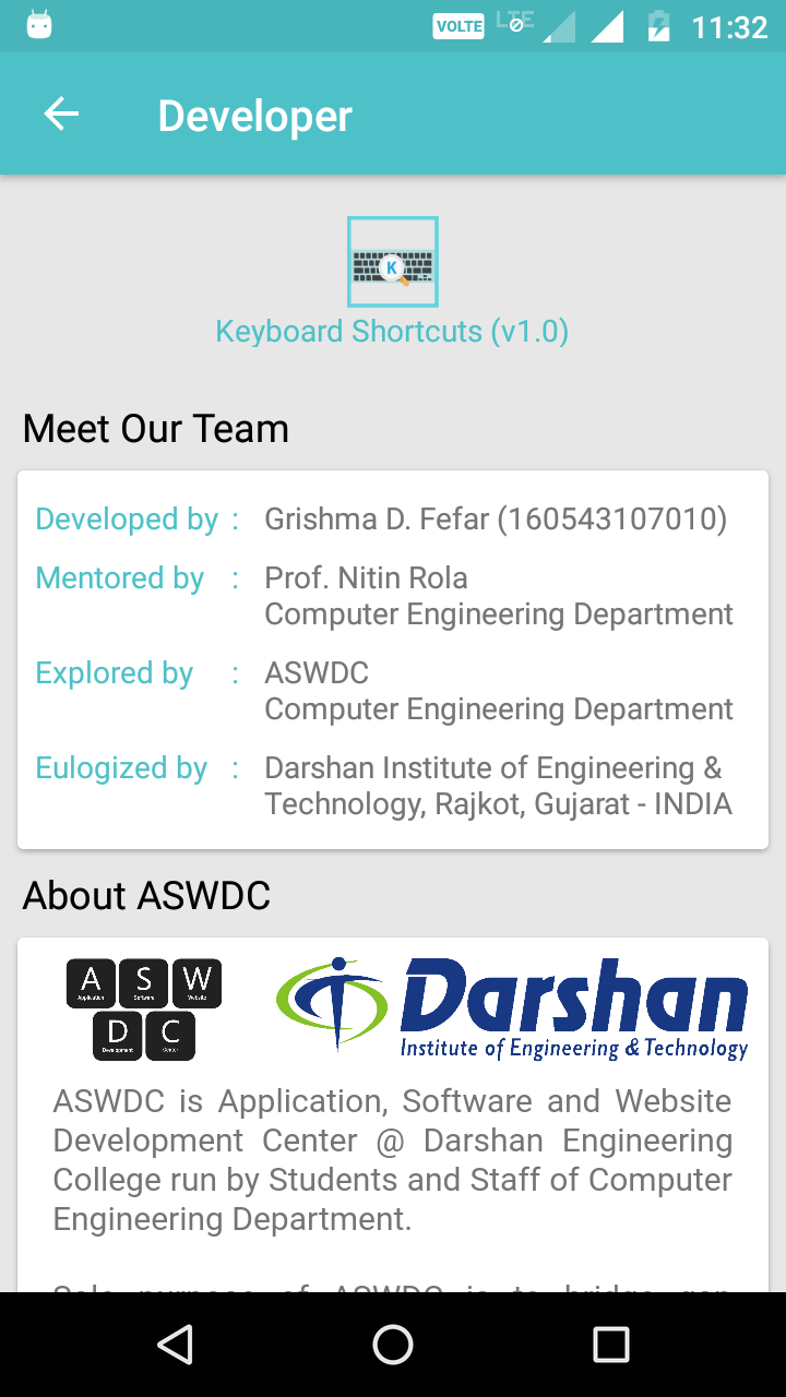 Questa app è sviluppata presso l'ASWDC da Grishma Fefar (160543107010), uno studente del quinto semestre CE. ASWDC è il centro di sviluppo di app, software e siti Web presso la Darshan University, Rajkot, gestito da studenti e personale del dipartimento di informatica e ingegneria.
