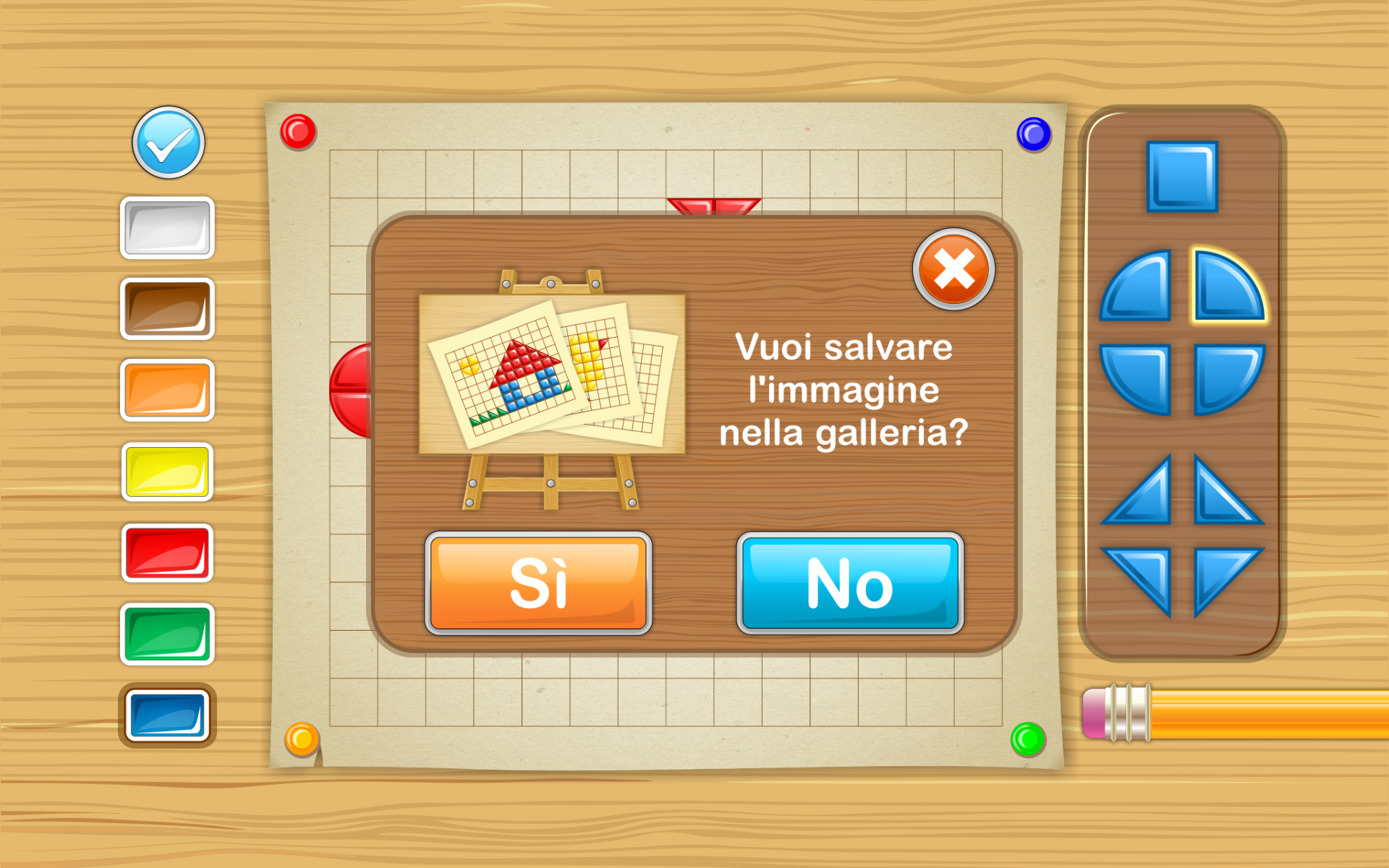 Il classico gioco con i mattoni con i quali tutti siamo cresciuti è stato trasformato in un'applicazione divertente per touch screen. Con l'app "Disegni con forme per bambini" i vostri figli possono realizzare disegni creativi composti da forme disponibili in diversi colori. I bambini possono disegnare liberamente o completare uno dei cinquanta modelli. Ci sono cinque modelli in ognuna di queste dieci categorie: - Aeromobili - Animali - Uccelli - Dessert - Cibo - Cucina - Piante - Navi - Trasporto - Mondo subacqueo I bambini possono salvare e visualizzare le loro opere nella Galleria dell'app. La versione lite contiene "Crea la tua attività" e una delle 10 categorie dell'attività "Ricrea un'immagine". La versione a pagamento contiene 9 categorie aggiuntive dell'attività "Ricrea un'immagine".