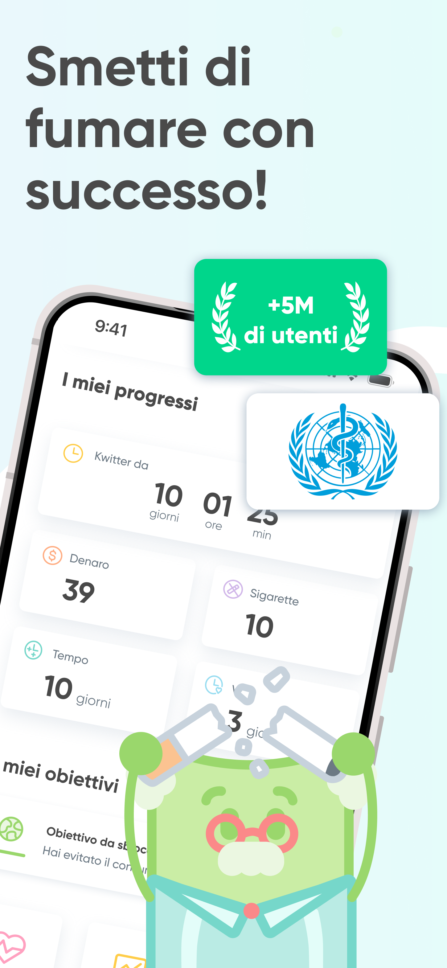 L'OMS ha esaminato l'applicazione digitale Kwit e l'ha ritenuta in linea con le migliori pratiche per la cessazione del fumo.