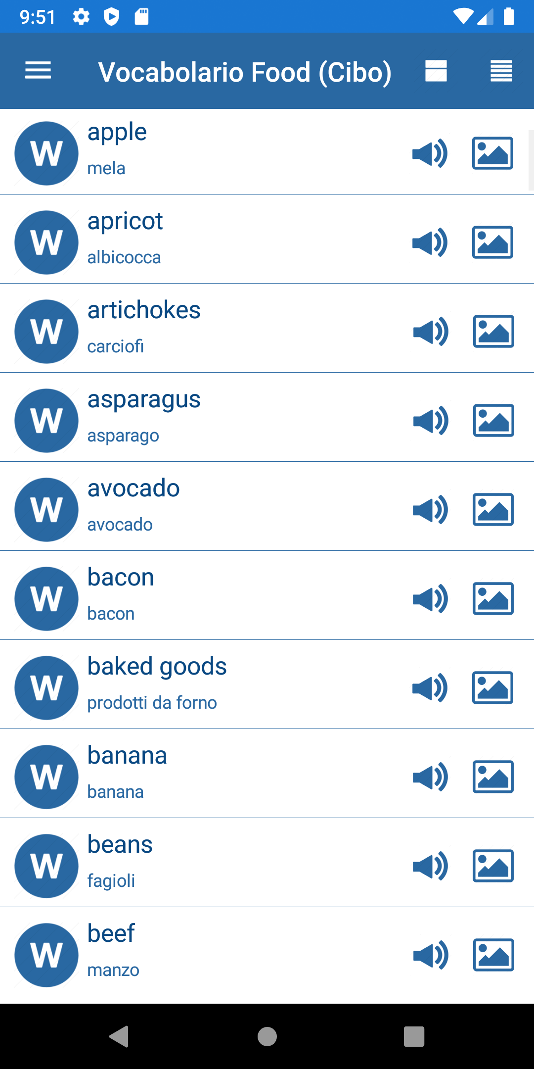 Impara l'inglese o semplicemente gioca! Migliora il tuo vocabolario in inglese con i nostri giochi. Partecipa ai nostri giochi a quiz per scoprire e imparare altre nuove parole inglesi. Puoi giocare gratuitamente e offline tutte le volte che vuoi. Questo è molto utile e divertente per ragazze, ragazzi, adulti e tutta la famiglia! Giocandoti metti alla prova le tue conoscenze, impara nuove parole inglesi, allena il tuo cervello e migliora anche il tuo vocabolario inglese. Più difficile è il gioco, più alto è il tuo punteggio e migliore inglese. Il vocabolario inglese può mostrare offline più di 2000 parole inglesi più popolari e immagini reali di alta qualità in 21 categorie Cibo, Cucina, Hotel / casa, Animali, Elementi essenziali, Colori, Natura, Corpo, Medicina, Sport, Dispositivi, Vestiti, Trasporti, Matematica , Edilizia, strumenti musicali, esercito, scuola, professioni, azioni, luoghi e altri. L'applicazione per imparare le parole inglesi per immagini include 4 giochi. Caratteristiche principali: - Vocabolario inglese con immagini; - Indovina la parola; - Indovina l'immagine; - Scrivi la parola; - Ascolta e indovina; - Più di 2000 parole inglesi più comuni e immagini reali di alta qualità; - Più di 21 categorie più comuni; - Apprendimento delle statistiche (punteggio complessivo, precisione, ecc.); - Salta la domanda difficile e ritorna più tardi; - Pronuncia di parole inglesi; Puoi saltare qualsiasi domanda difficile toccando la freccia destra e tornare indietro in seguito toccando la freccia sinistra. Puoi ascoltare la pronuncia della parola inglese dopo aver risposto toccando l'icona audio. Puoi vedere le statistiche. Le informazioni includono il punteggio complessivo, l'accuratezza, il conteggio delle risposte corrette e non corrette. Questa è una buona applicazione per imparare nuove parole inglesi. Puoi vedere le immagini collegate alle parole, ascoltare la pronuncia inglese e memorizzarle. Vedi le parole originali e tradotte. Lingue supportate: inglese, russo, spagnolo, hindi, portoghese, indonesiano, tedesco, bengalese, francese, italiano, vietnamita (Età 3+)