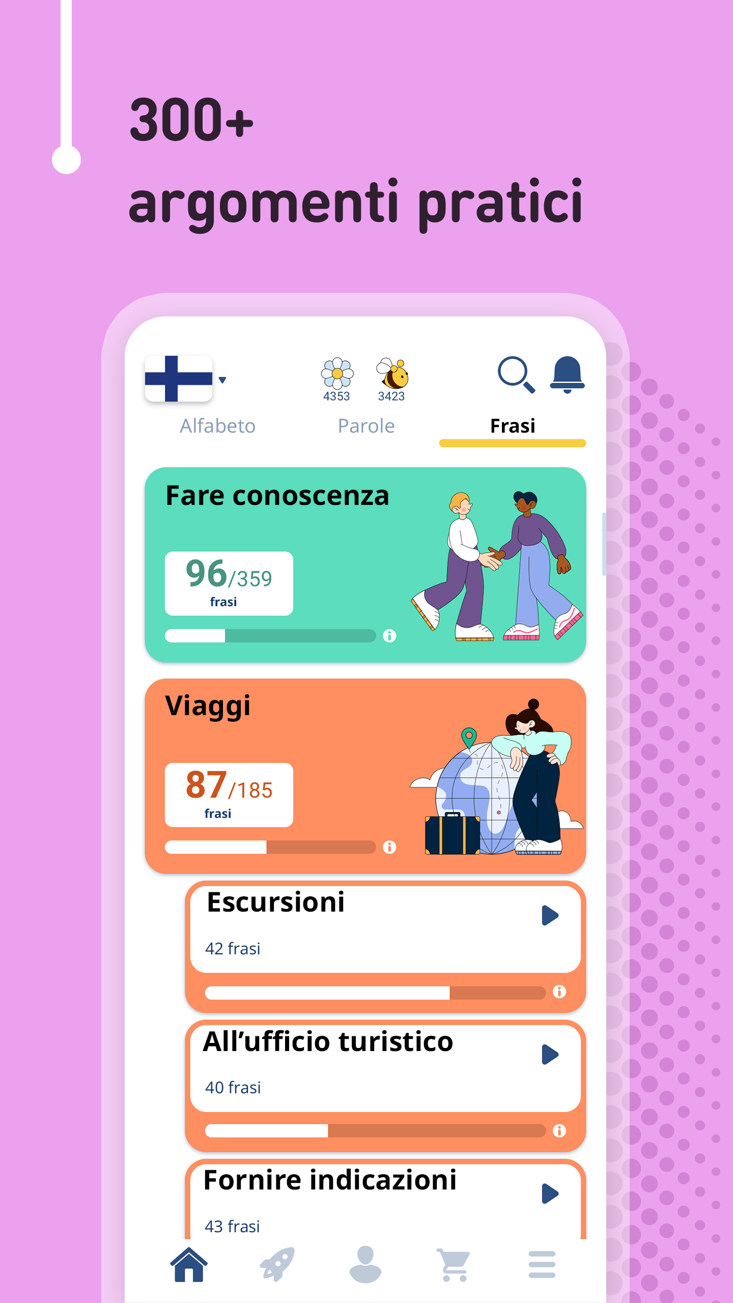 Impara il finlandese da 61 lingue native, gratis & offline, con FunEasyLearn. Impara a LEGGERE 📖 SCRIVERE✍ e PARLARE il finlandese 💬 Scopri il modo semplice & divertente per imparare tutte le regole di lettura, tutte le parole di cui avrai mai bisogno e tutte le frasi utili in lingua finlandese. 🚀 Contenuto • 6.000 parole finlandesi (in costante crescita): i nomi, i verbi, gli aggettivi, ecc. più comuni, classificati in 7 livelli e 200 argomenti; • 1.250 frasi finlandesi (usate frequentemente): le frasi più importanti per conversazioni e viaggi quotidiani, suddivise in 10 livelli e 120 argomenti. Espandi il tuo vocabolario imparando parole, frasi ed espressioni per studenti principianti, di livello intermedio e avanzato. 🔔 Perchè imparare il finlandese con FunEasyLearn? FunEasyLearn rivoluziona l'apprendimento delle lingue. Il nostro team di linguisti e insegnanti ha sviluppato una strategia unica di apprendimento delle lingue. Il segreto sta nel combinare un alfabeto con tutte le regole di lettura, tutte le parole necessarie e un pratico frasario in un'unica app. Ciò consente ai nostri utenti di leggere una parola o frase, pronunciarla correttamente, associarla a un'illustrazione e praticarla con giochi di ascolto, scrittura e conversazione. 🏆 Caratteristiche principali Illustrazioni disegnate a mano – memorizza il nuovo vocabolario più velocemente con illustrazioni intuitive; Registrazioni audio professionali – ascolta degli audio registrati da madrelingua; Statistiche dettagliate – analizza i tuoi risultati e traccia i tuoi progressi; Sistema di revisione – ripassa tutto ciò che impari; Ricerca complessa – trova rapidamente le parole e le frasi di cui hai bisogno; Nascondi ciò che sai Riconoscimento vocale – migliora la tua pronuncia; Offline – usa l'app in qualsiasi parte del mondo, senza connessione a Internet. 💼 Finlandese per lavoro Ottieni l'accesso a speciali lezioni di finlandese creati per il vostro business. Offriamo corsi specializzati per tassisti, personale di hotel & ristoranti, assistenti di volo, commessi, ecc. ✈ Finlandese per viaggiare Impara come prenotare una camera d'albergo, ordinare un pasto in un ristorante, chiedere indicazioni stradali, svolgere una conversazione e parlare in sicurezza con i madrelingua. 🙌 Finlandese per adulti Adattiamo i contenuti in base all'età dello studente. Sia tu che tuo figlio potete imparare il finlandese e divertirvi. Abbonamento Gratuito a FunEasyLearn Iscriviti GRATIS, con i fiori che guadagni giocando ai giochi di apprendimento delle lingue. Impara il finlandese, gioca gratis! È veloce & facile. 📴 📥 Scarica subito il corso di finlandese FunEasyLearn! Raccomanda l'app ai tuoi amici e ottieni una ricompensa! Valutaci e scrivi una recensione ⭐⭐⭐⭐⭐ Significherebbe molto per il nostro team! Contattaci: https://www.FunEasyLearn.com/