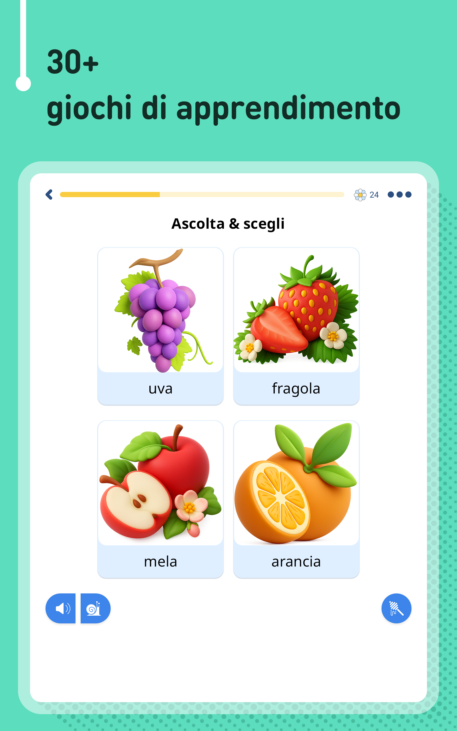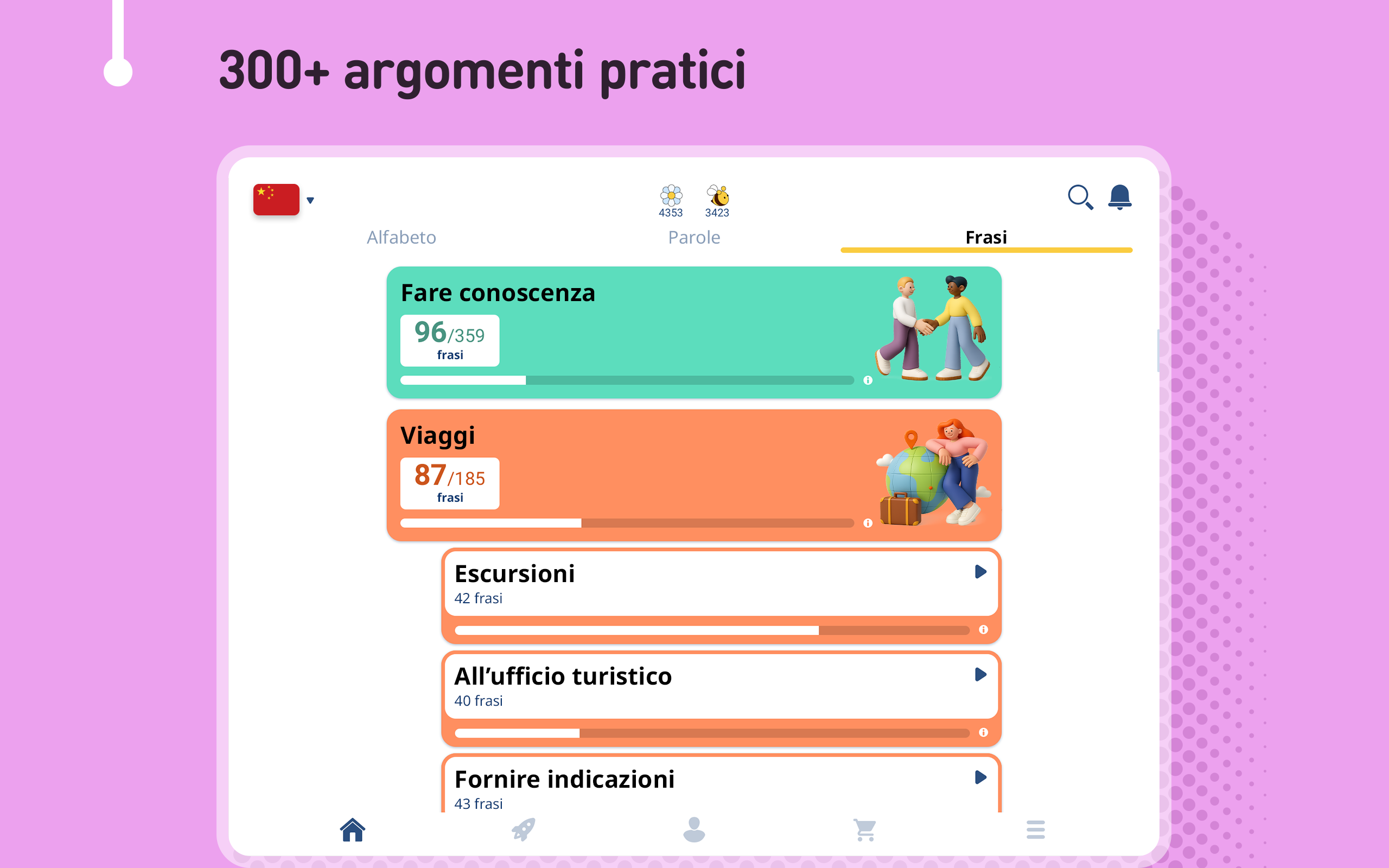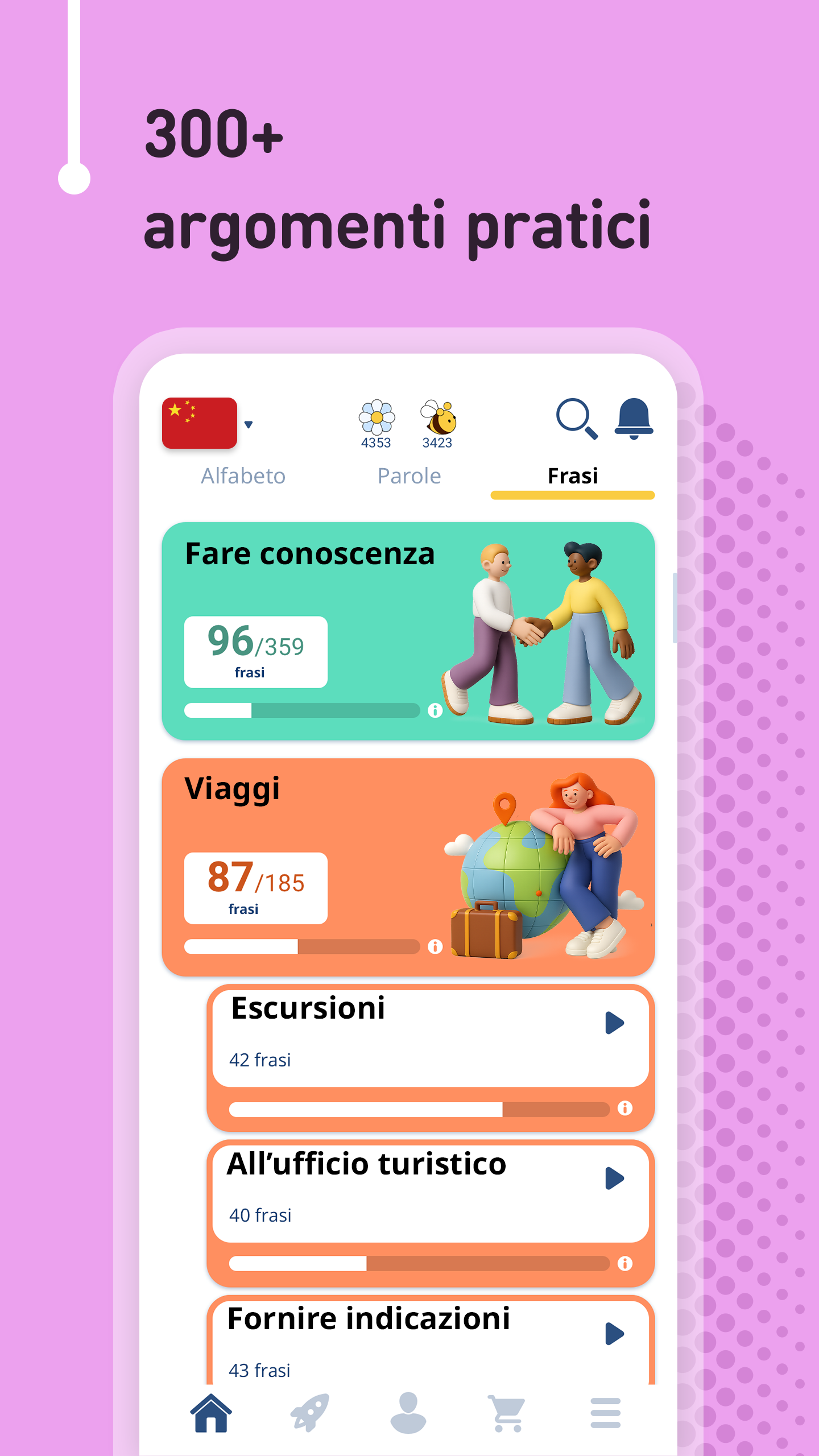 Impara il cinese da 61 lingue native, gratis & offline, con FunEasyLearn. Impara a LEGGERE 📖 SCRIVERE✍ e PARLARE il cinese 💬 Scopri il modo semplice & divertente per imparare tutte le regole di lettura, tutte le parole di cui avrai mai bisogno e tutte le frasi utili in lingua cinese. 🚀 Contenuto • 6.000 parole cinesi (in costante crescita): i nomi, i verbi, gli aggettivi, ecc. più comuni, classificati in 7 livelli e 200 argomenti; • 5.000 frasi cinesi (usate frequentemente): le frasi più importanti per conversazioni e viaggi quotidiani, suddivise in 10 livelli e 120 argomenti. Espandi il tuo vocabolario imparando parole, frasi ed espressioni per studenti principianti, di livello intermedio e avanzato. 🔔 Perchè imparare il cinese con FunEasyLearn? FunEasyLearn rivoluziona l'apprendimento delle lingue. Il nostro team di linguisti e insegnanti ha sviluppato una strategia unica di apprendimento delle lingue. Il segreto sta nel combinare un alfabeto con tutte le regole di lettura, tutte le parole necessarie e un pratico frasario in un'unica app. Ciò consente ai nostri utenti di leggere una parola o frase, pronunciarla correttamente, associarla a un'illustrazione e praticarla con giochi di ascolto, scrittura e conversazione. 🏆 Caratteristiche principali Illustrazioni disegnate a mano – memorizza il nuovo vocabolario più velocemente con illustrazioni intuitive; Registrazioni audio professionali – ascolta degli audio registrati da madrelingua; Statistiche dettagliate – analizza i tuoi risultati e traccia i tuoi progressi; Sistema di revisione – ripassa tutto ciò che impari; Ricerca complessa – trova rapidamente le parole e le frasi di cui hai bisogno; Nascondi ciò che sai Riconoscimento vocale – migliora la tua pronuncia; Offline – usa l'app in qualsiasi parte del mondo, senza connessione a Internet. 💼 Cinese per lavoro Ottieni l'accesso a speciali lezioni di mandarino creati per il vostro business. Offriamo corsi specializzati per tassisti, personale di hotel & ristoranti, assistenti di volo, commessi, ecc. ✈ Cinese per viaggiare Impara come prenotare una camera d'albergo, ordinare un pasto in un ristorante, chiedere indicazioni stradali, svolgere una conversazione e parlare in sicurezza con i madrelingua. 🙌 Cinese per adulti Adattiamo i contenuti in base all'età dello studente. Sia tu che tuo figlio potete imparare il cinese e divertirvi. Abbonamento Gratuito a FunEasyLearn Iscriviti GRATIS, con i fiori che guadagni giocando ai giochi di apprendimento delle lingue. Impara il cinese, gioca gratis! È veloce & facile. 📴 📥 Scarica subito il corso di cinese FunEasyLearn! Raccomanda l'app ai tuoi amici e ottieni una ricompensa! Valutaci e scrivi una recensione ⭐⭐⭐⭐⭐ Significherebbe molto per il nostro team! Contattaci: https://www.FunEasyLearn.com/