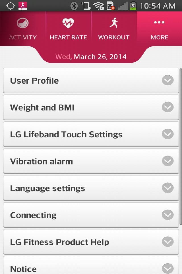 LG Fitness App - It works seamlessly with LG Fitness devices, including LG Lifeband Touch and/or Heart Rate Earphones, over Bluetooth. - It is intuitive, an easy-to-use fitness app to help users take greater control over their fitness & daily activities [Smartphone compatibility] - Android : compatible with Jelly Bean 4.3 and later ver. with Bluetooth 4.0 LE -- LG : G2, Nexus5, G Flex, G3, G Pro2, G2 Mini -- Samsung : Galaxy S3, Galaxy S4, Galaxy S5,Galaxy Note 2, Galaxy Note 3, Galaxy Note 4, Galaxy Round ** The list of compatible Smartphones will continue to be updated [Connected Devices] - LG Lifeband Touch: wearable activity tracker with a smart, intuitive user interface, OLED touch display and connectivity features to monitor activity in real time. -- Fitness tracking: calorie consumed, steps taken, distance, speed, pace and heart rate via LG Fitness app connecting to heart rate monitoring devices -- Innovative features: Text & Call notifications, Music control, Gesture recognition - Heart Rate Earphones: strapless continuous heart rate monitor that is also a Bluetooth headset. It accurately monitors and provides valuable biometric information including heart rate to the user while delivering excellent sound for wireless music & call -- Fitness tracking : heart rate, calorie consumed, distance, speed and pace -- Innovative features : tracking biometric data while listening to music, real time voice guidance for workout information, - Connect Lifeband Touch & Heart Rate Earphones together, and see heart rate on Lifeband Touch - Many more devices to be connected! [Key features of LG Fitness App] - Intuitive & easy: provide valuable information through intuitive and simple UI - Optimized: optimized menu and UI for connected devices - Extendable: can be easily connected with additional devices and other services [App menu] - Home: view daily summary at a glance - Activity: activities & calories-burned details - Heart rate: measure max. heart rate & VO2max - Work out: start workout session - More: settings [App & Device Connection] - Data sync with popular fitness apps and selected heart rate monitors so that users can keep using their favorite apps and heart rate monitor devices. -- Fitness apps : MyFitnessPal, Runkeeper -- Heart rate monitors : Polar, Zephyr. - Many more partners to come!