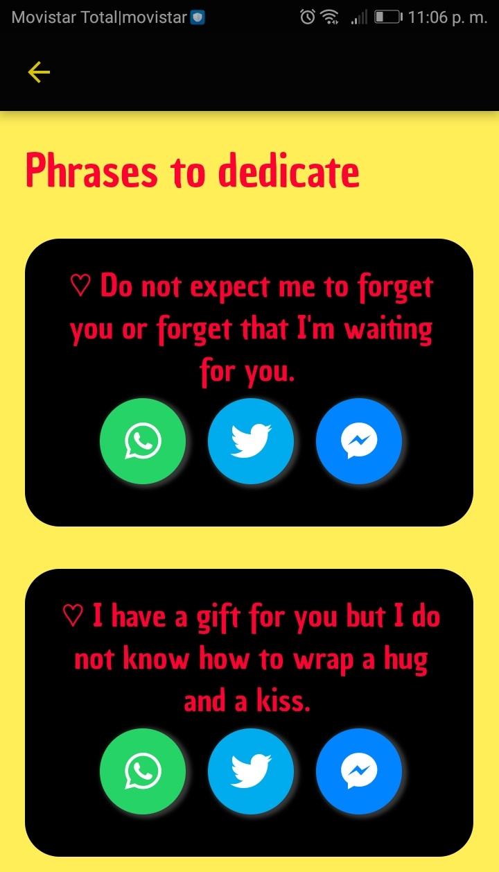 ¡Con nuestra aplicación lograras derretir el corazón del ser amado, no solo porque son hermosas, sino que tienen un mensaje muy cautivador y que hace la diferencia a la hora de intentar mostrarle tus sentimientos, ¡estos Mensajes romanticos son una gran colección de más de 70 💌, entonces tienen dedicación para casi tres meses enteros!